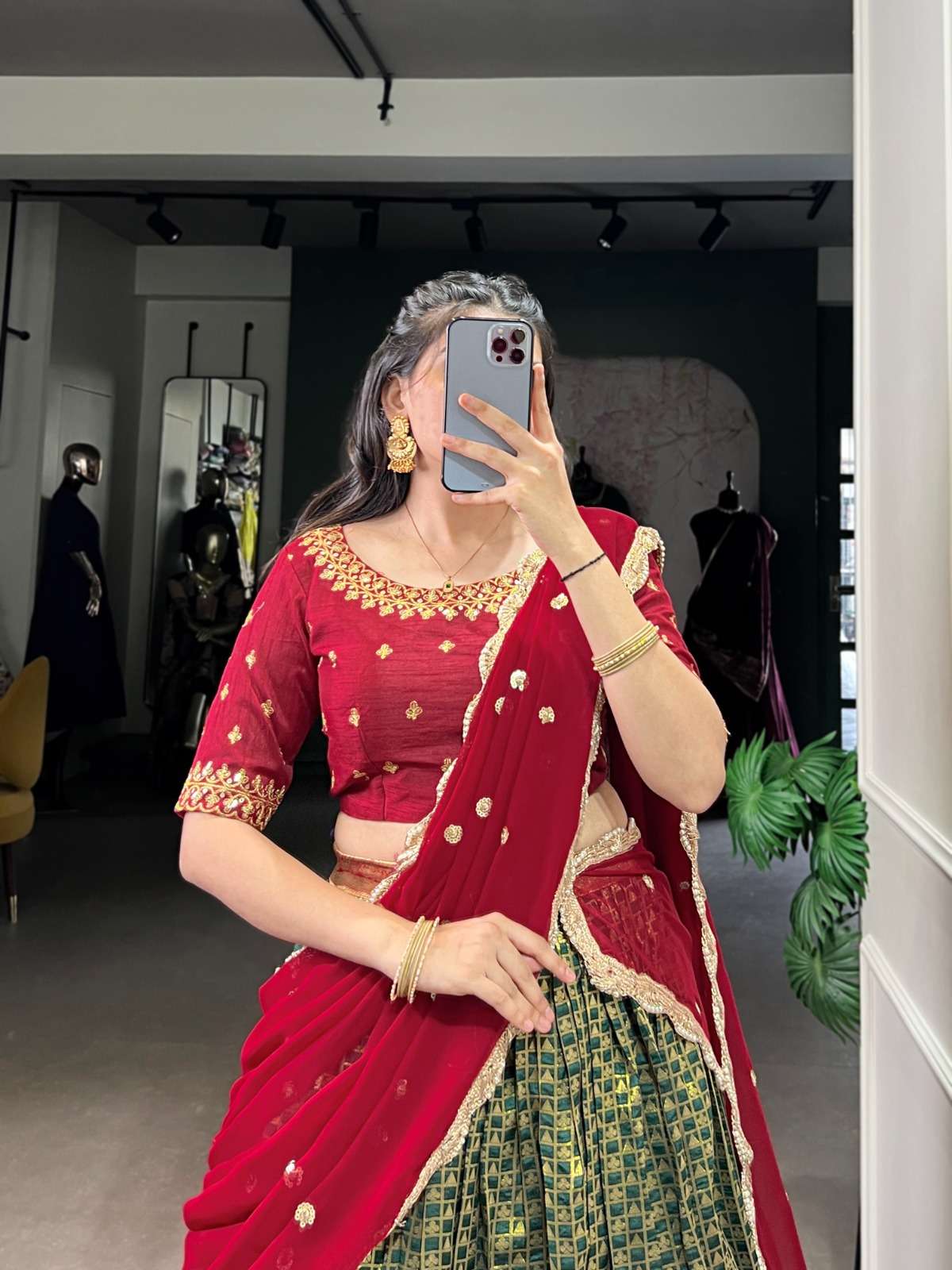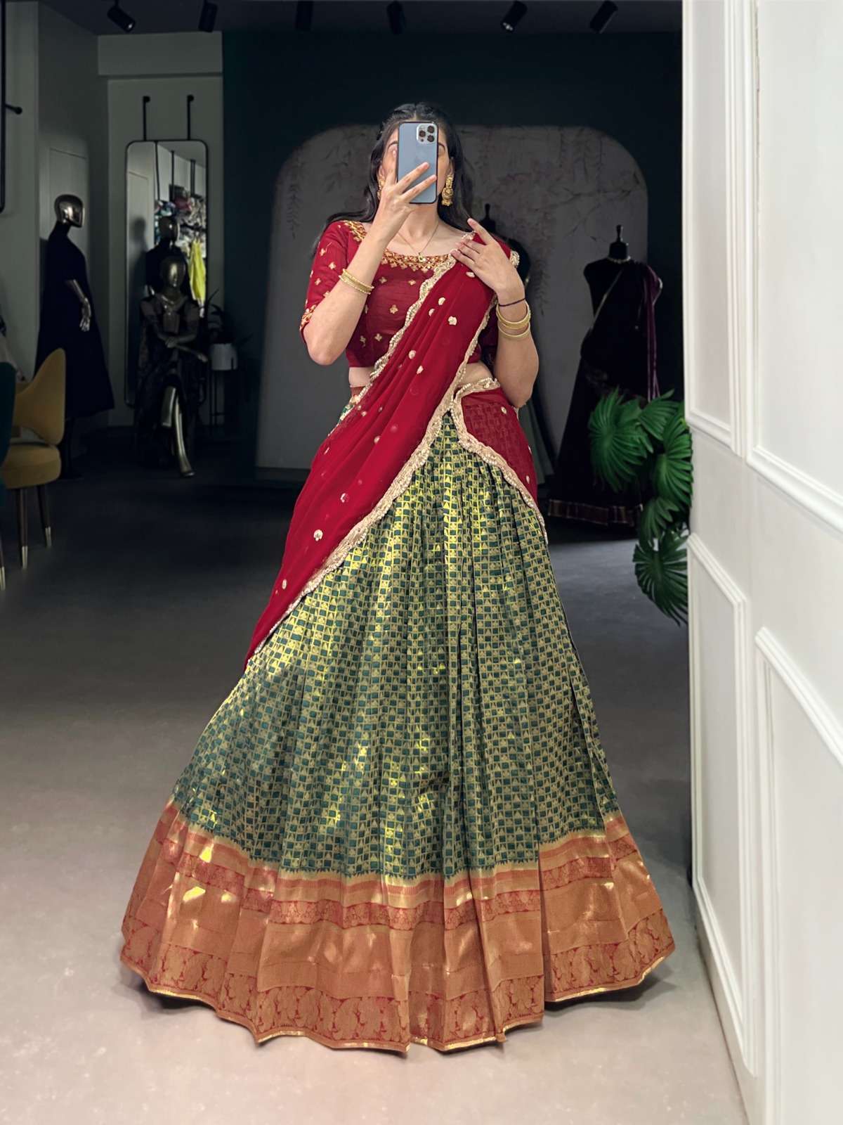 A lehenga that blends tradition with modern shine—Jacquard Silk at its finest. ☘️