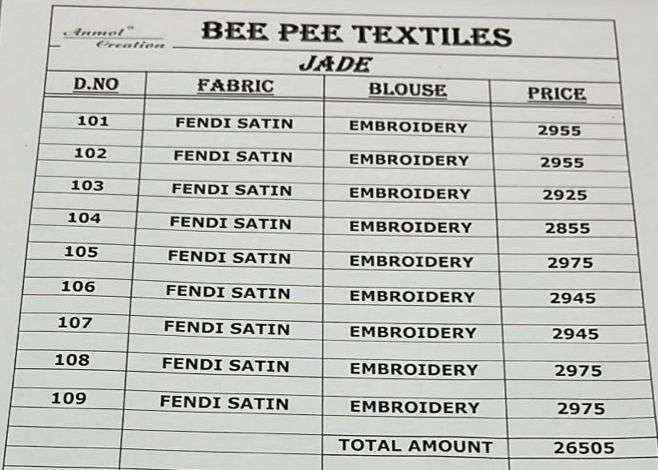 Buy Online Jade by anmol creation saree collection manufacturer surat 9 Pcs of Full Catalogue at Wholesale Price. Looking for Jade by anmol creation saree collection manufacturer surat Full Catalouge at Best Price? Buy Now Jade by anmol creation saree collection manufacturer surat at Wholesale Rate of Rs 0 with Total 9 Pcs from authroized dealer and supplier of ANMOL SAREE Brand. Cost of Each piece is just only Rs 0 which is very low and affordable price to resale the product in your retail store ,This is Surat based Wholesale Supplier & Dealer of ANMOL SAREE Brand. Click on Brand name to Know more about ANMOL SAREE Brand's products.Call or Whatsapp on 9898838984 for booking or enquiry