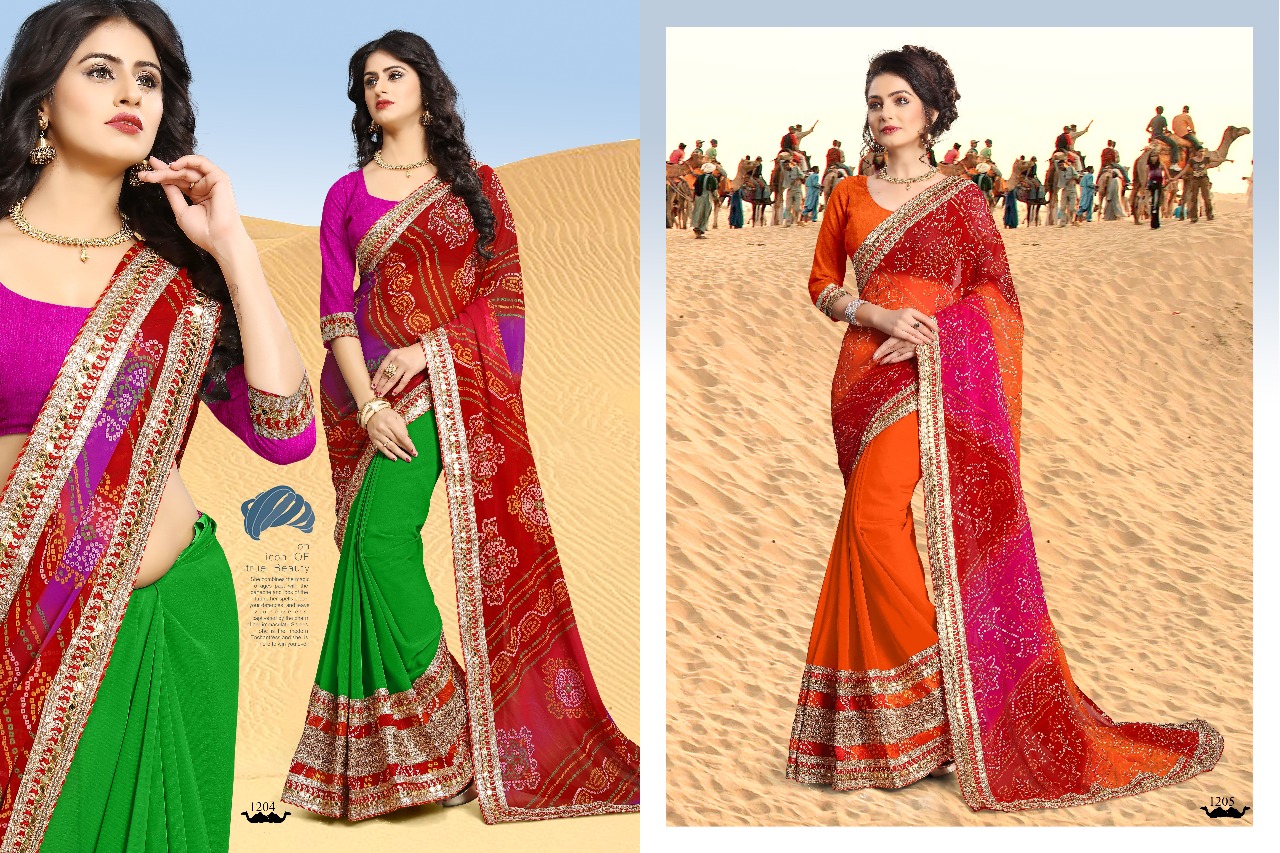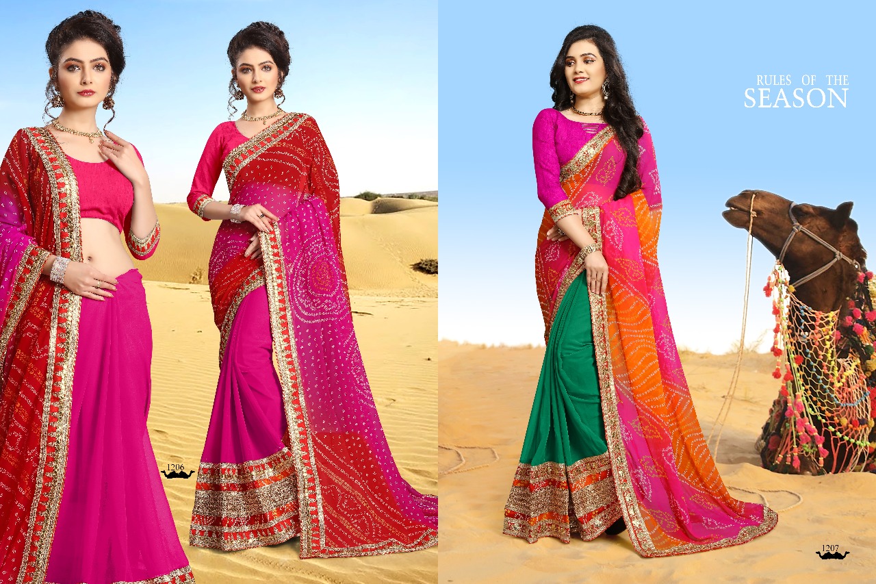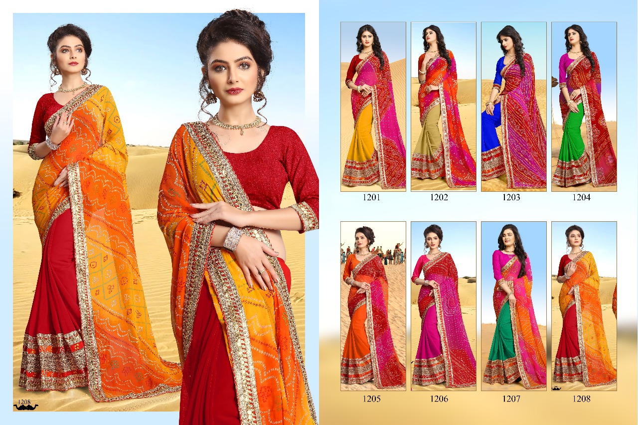 Buy Online Jalnidhi Panghat 1201 Series Pure Marble Bandhni Saree Surat 8 Pcs of Full Catalogue at Wholesale Price. Looking for Jalnidhi Panghat 1201 Series Pure Marble Bandhni Saree Surat Full Catalouge at Best Price? Buy Now Jalnidhi Panghat 1201 Series Pure Marble Bandhni Saree Surat at Wholesale Rate of Rs 6120 with Total 8 Pcs from authroized dealer and supplier of Jalnidhi sarees Brand. Cost of Each piece is just only Rs 765 which is very low and affordable price to resale the product in your retail store ,This is Surat based Wholesale Supplier & Dealer of Jalnidhi sarees Brand. Click on Brand name to Know more about Jalnidhi sarees Brand's products.Call or Whatsapp on 9898838984 for booking or enquiry