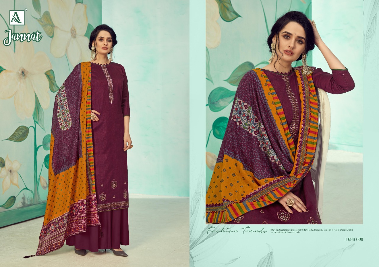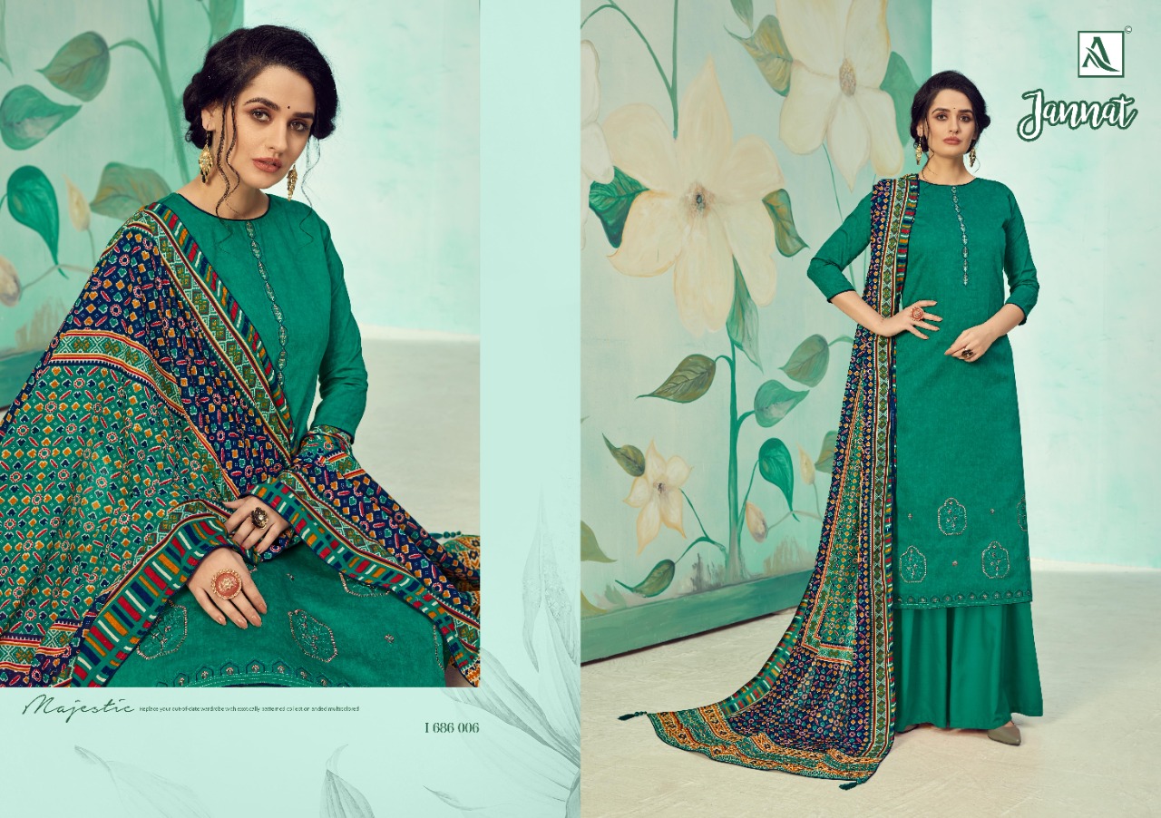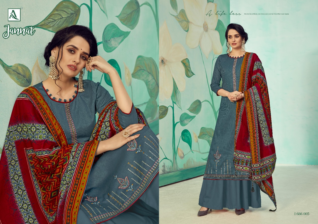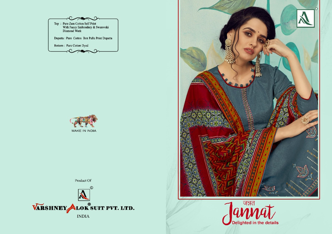 Buy Online Jannat By Alok Suit Single And Set Stockiest And Supplier From Surat 10 Pcs of Full Catalogue at Wholesale Price. Looking for Jannat By Alok Suit Single And Set Stockiest And Supplier From Surat Full Catalouge at Best Price? Buy Now Jannat By Alok Suit Single And Set Stockiest And Supplier From Surat at Wholesale Rate of Rs 6250 with Total 10 Pcs from authroized dealer and supplier of Brand. Cost of Each piece is just only Rs 625 which is very low and affordable price to resale the product in your retail store ,This is Surat based Wholesale Supplier & Dealer of Brand. Click on Brand name to Know more about Brand's products.Call or Whatsapp on 9898838984 for booking or enquiry