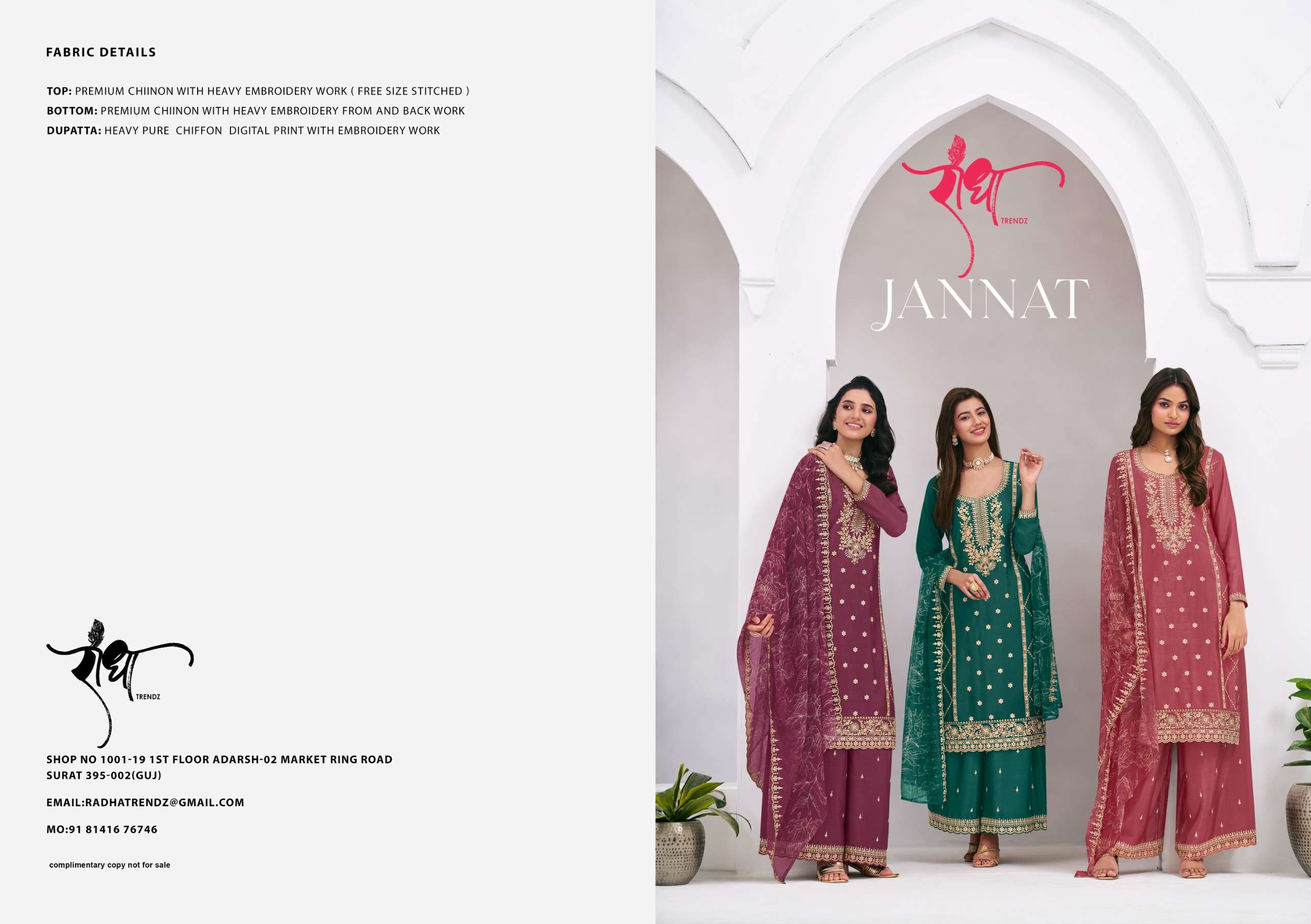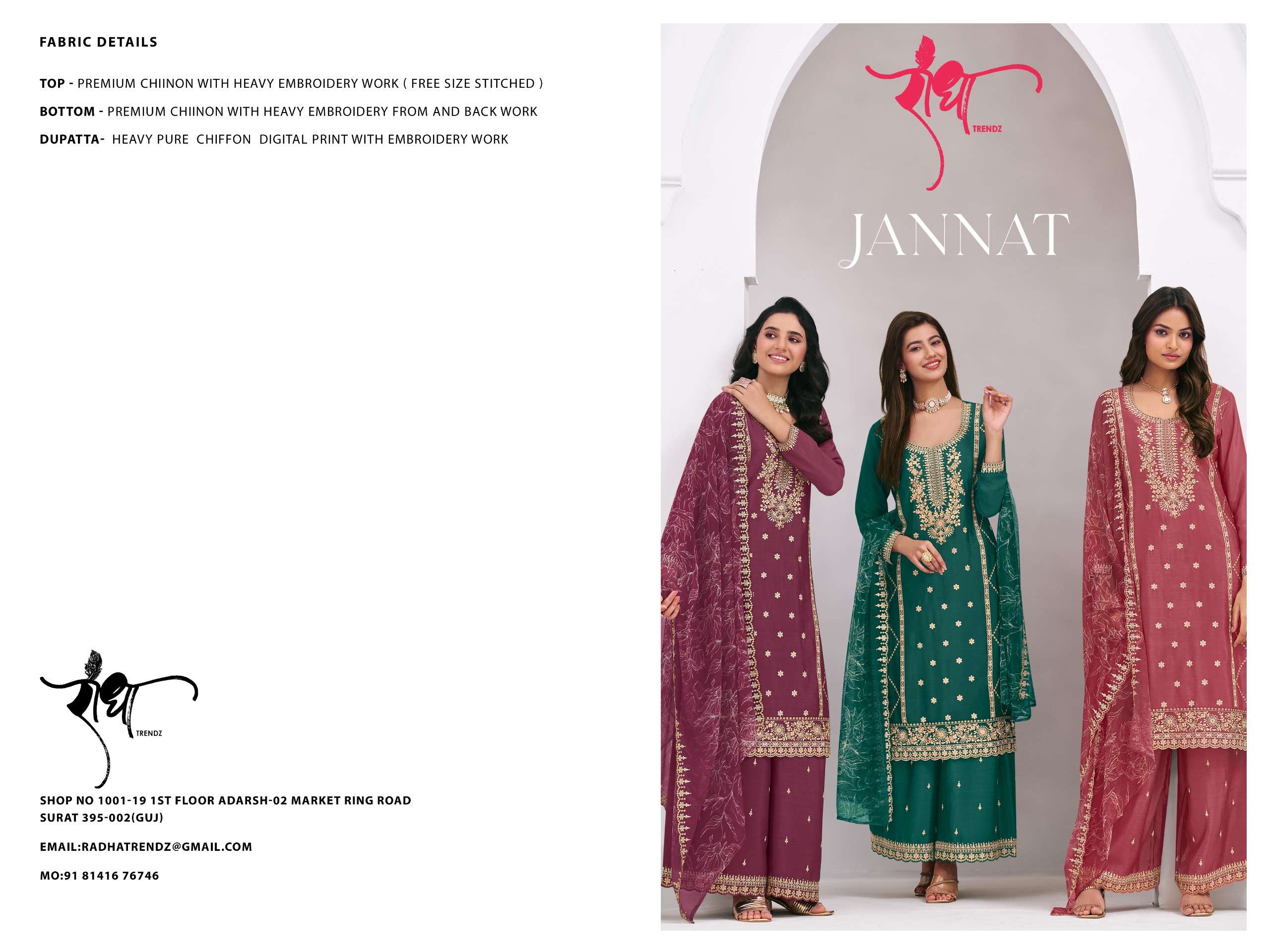 Buy Online JANNAT by RADHA TRENDZ suit collection manufacturers surat 4 Pcs of Full Catalogue at Wholesale Price. Looking for JANNAT by RADHA TRENDZ suit collection manufacturers surat Full Catalouge at Best Price? Buy Now JANNAT by RADHA TRENDZ suit collection manufacturers surat at Wholesale Rate of Rs 7180 with Total 4 Pcs from authroized dealer and supplier of Radha Trendz Brand. Cost of Each piece is just only Rs 1795 which is very low and affordable price to resale the product in your retail store ,This is Surat based Wholesale Supplier & Dealer of Radha Trendz Brand. Click on Brand name to Know more about Radha Trendz Brand's products.Call or Whatsapp on 9898838984 for booking or enquiry