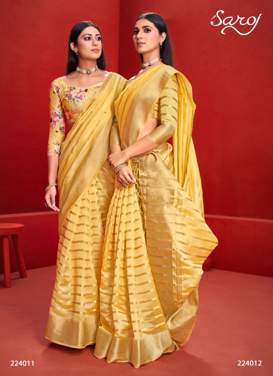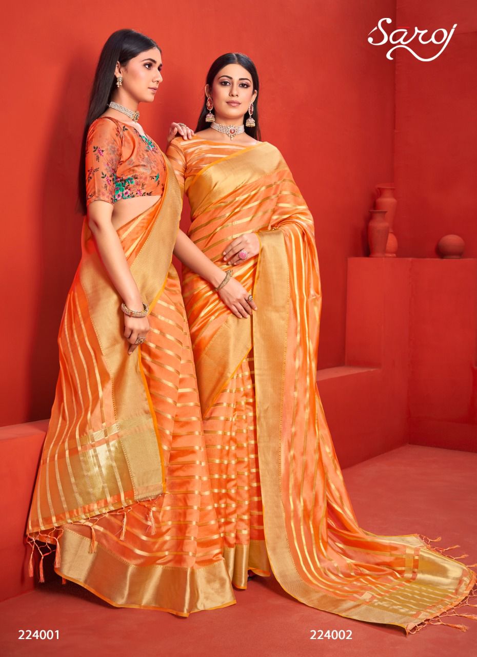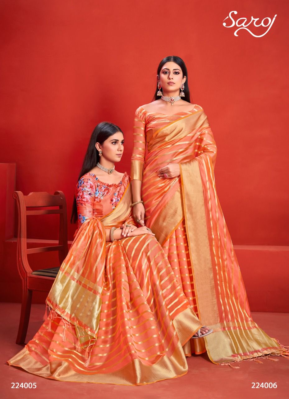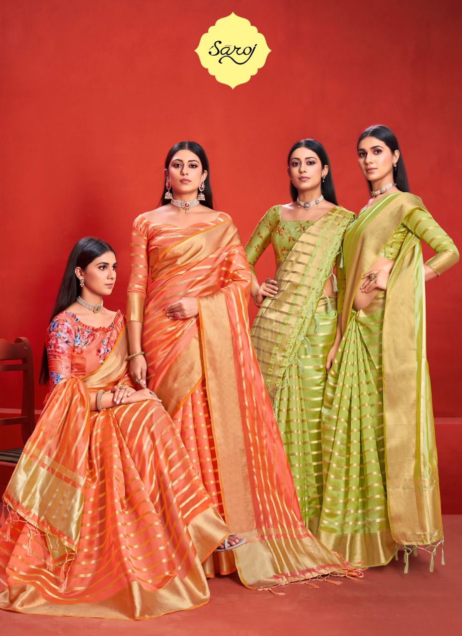 Brand - saroj . *Jannat (Rs.1050 per pcs )* Fabric: Orgenza Silk with Golden Jari Liling and Jari Border. Blouse: Organza Silk and Silk Digital Printed blouse. *NOTE 2 Blouse with 1 Saree. 6 Design in set. Set to set. Delivery from today |