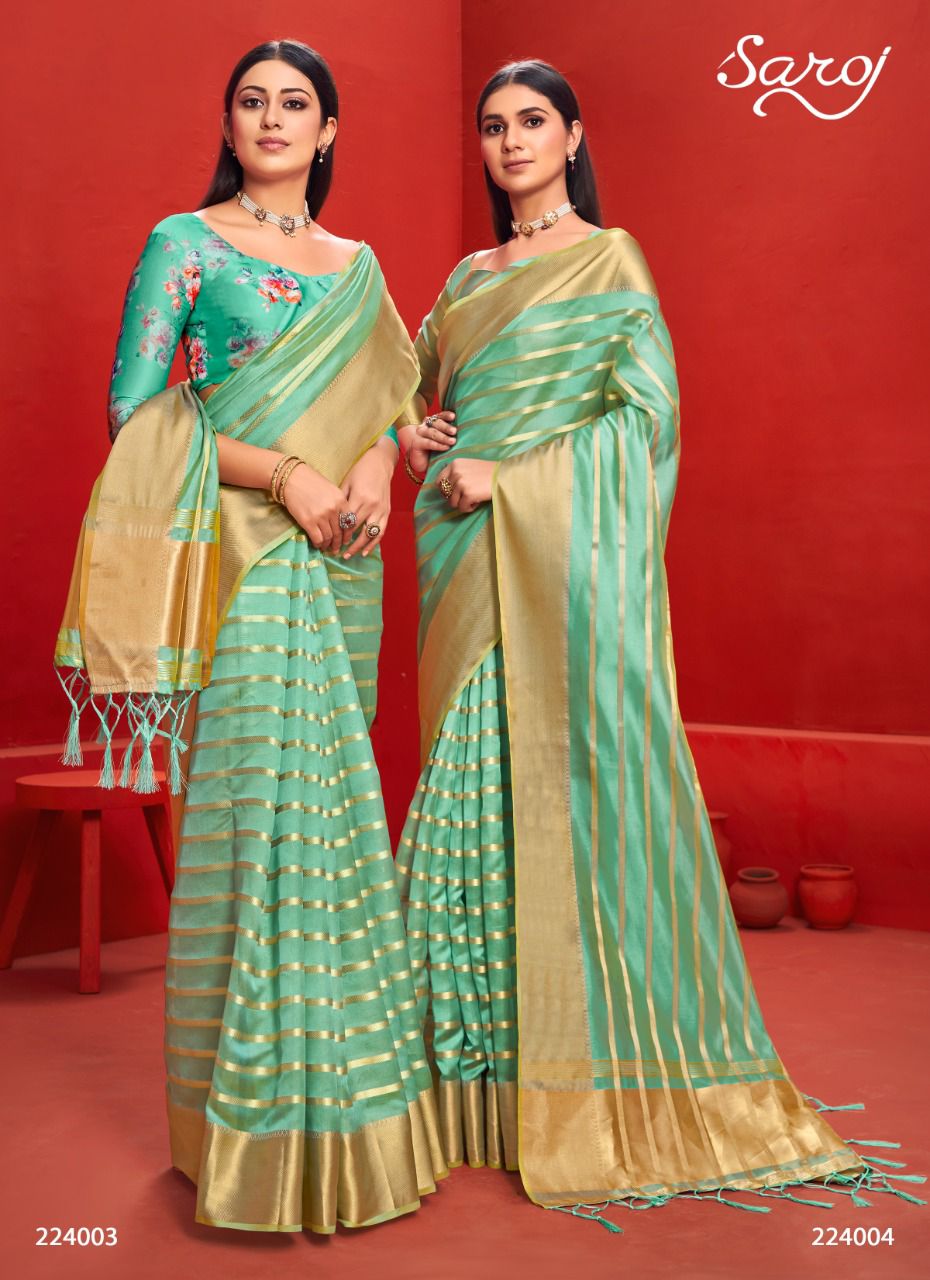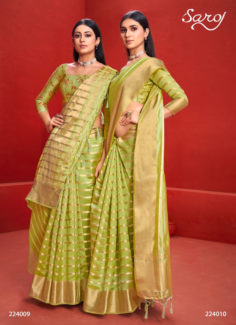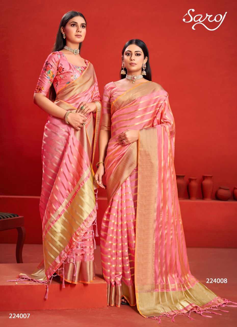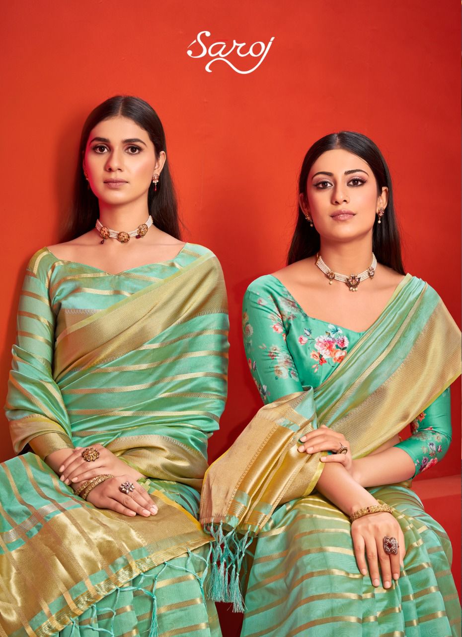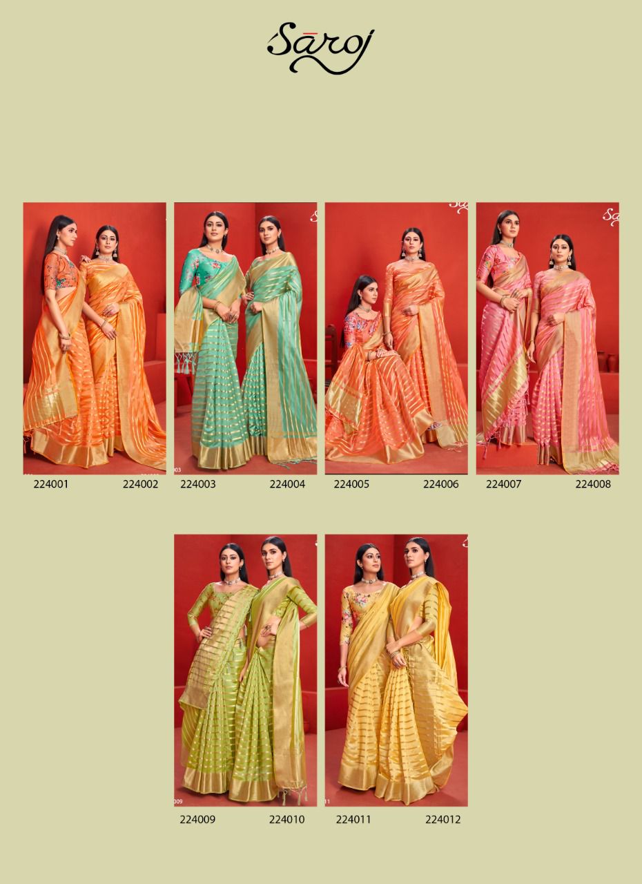 Brand - saroj . *Jannat (Rs.1050 per pcs )* Fabric: Orgenza Silk with Golden Jari Liling and Jari Border. Blouse: Organza Silk and Silk Digital Printed blouse. *NOTE 2 Blouse with 1 Saree. 6 Design in set. Set to set. Delivery from today |