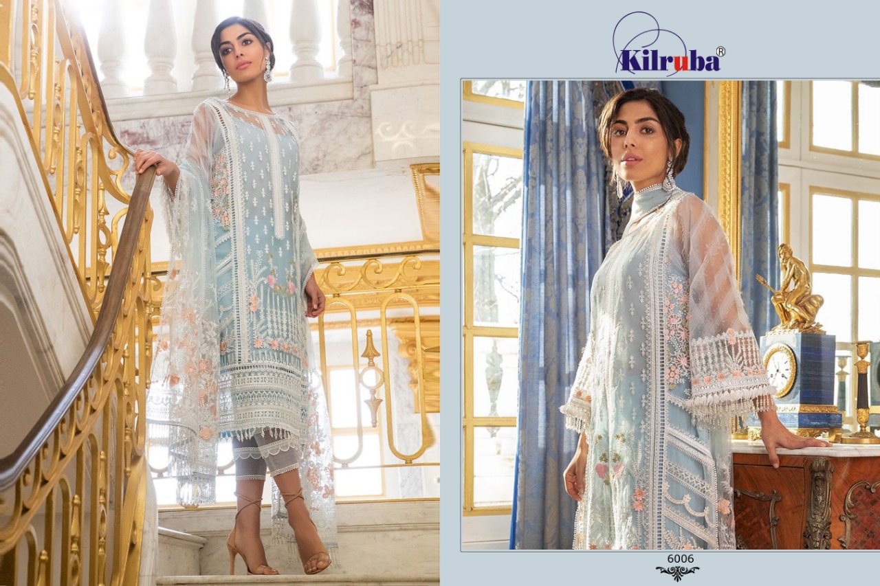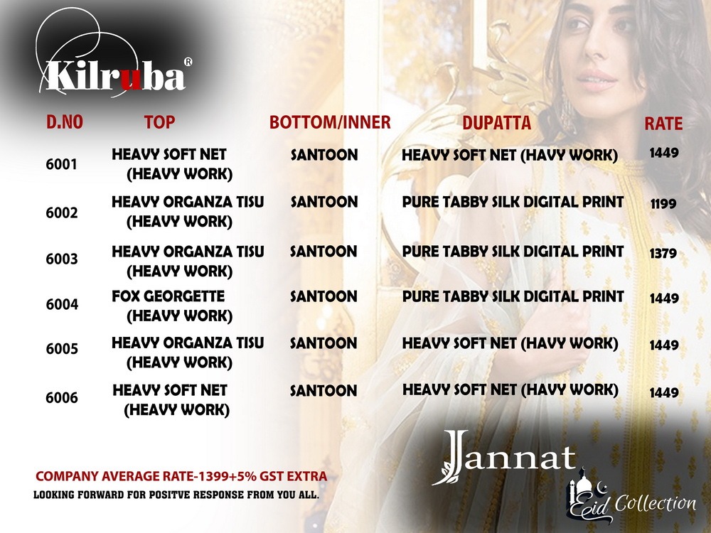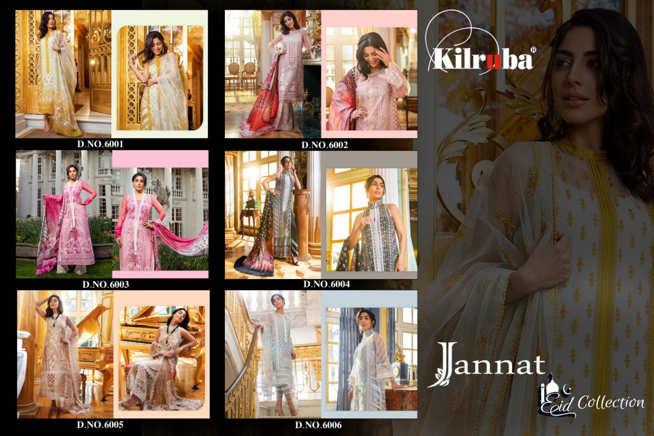 Buy Online Jannat Eid Collection By Kilruba Georgette Embroidered Designer Party Wear Pakistani Suits Wholesale Supplier Surat 6 Pcs of Full Catalogue at Wholesale Price. Looking for Jannat Eid Collection By Kilruba Georgette Embroidered Designer Party Wear Pakistani Suits Wholesale Supplier Surat Full Catalouge at Best Price? Buy Now Jannat Eid Collection By Kilruba Georgette Embroidered Designer Party Wear Pakistani Suits Wholesale Supplier Surat at Wholesale Rate of Rs 8394 with Total 6 Pcs from authroized dealer and supplier of Brand. Cost of Each piece is just only Rs 1399 which is very low and affordable price to resale the product in your retail store ,This is Surat based Wholesale Supplier & Dealer of Brand. Click on Brand name to Know more about Brand's products.Call or Whatsapp on 9898838984 for booking or enquiry