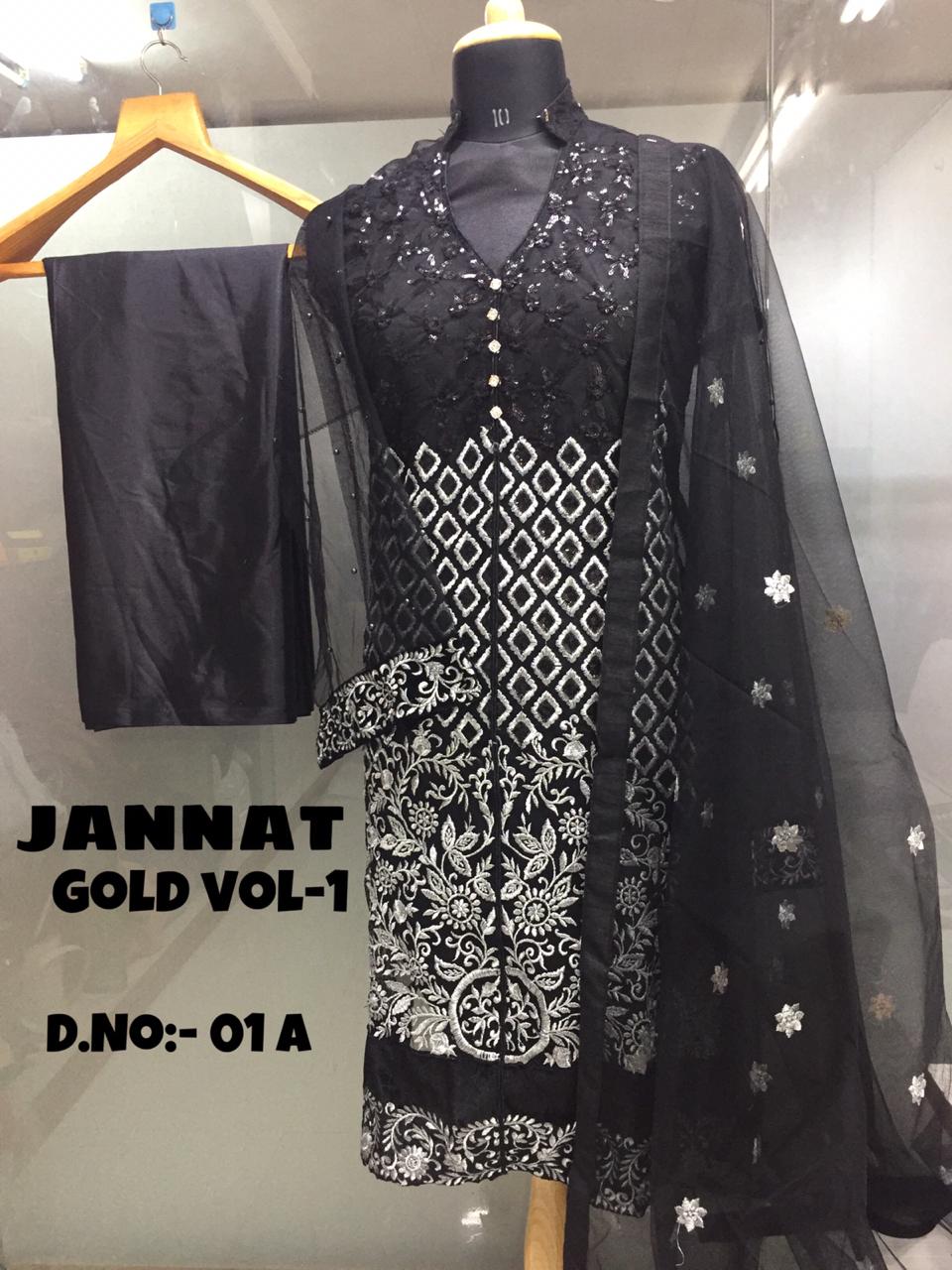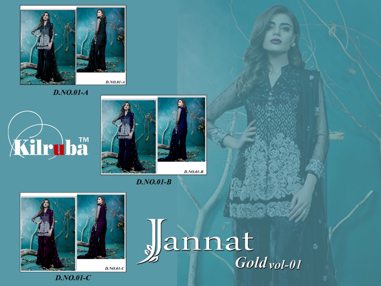 Buy Online Jannat Gold Vol 1 By Kilruba 01 Colours Fancy Pakistani Salwar Suit Collection Wholesaler Surat 3 Pcs of Full Catalogue at Wholesale Price. Looking for Jannat Gold Vol 1 By Kilruba 01 Colours Fancy Pakistani Salwar Suit Collection Wholesaler Surat Full Catalouge at Best Price? Buy Now Jannat Gold Vol 1 By Kilruba 01 Colours Fancy Pakistani Salwar Suit Collection Wholesaler Surat at Wholesale Rate of Rs 3597 with Total 3 Pcs from authroized dealer and supplier of Brand. Cost of Each piece is just only Rs 1199 which is very low and affordable price to resale the product in your retail store ,This is Surat based Wholesale Supplier & Dealer of Brand. Click on Brand name to Know more about Brand's products.Call or Whatsapp on 9898838984 for booking or enquiry