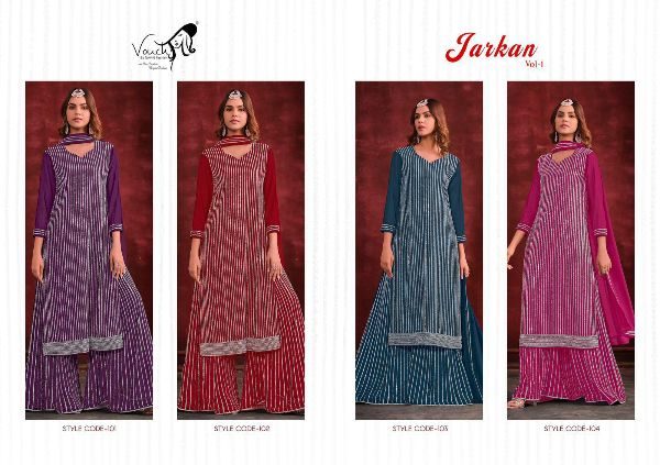 Buy Online Jarkan Vol 1 By Vouch New Collection 4 Pcs of Full Catalogue at Wholesale Price. Looking for Jarkan Vol 1 By Vouch New Collection Full Catalouge at Best Price? Buy Now Jarkan Vol 1 By Vouch New Collection at Wholesale Rate of Rs 7596 with Total 4 Pcs from authroized dealer and supplier of Brand. Cost of Each piece is just only Rs 1899 which is very low and affordable price to resale the product in your retail store ,This is Surat based Wholesale Supplier & Dealer of Brand. Click on Brand name to Know more about Brand's products.Call or Whatsapp on 9898838984 for booking or enquiry