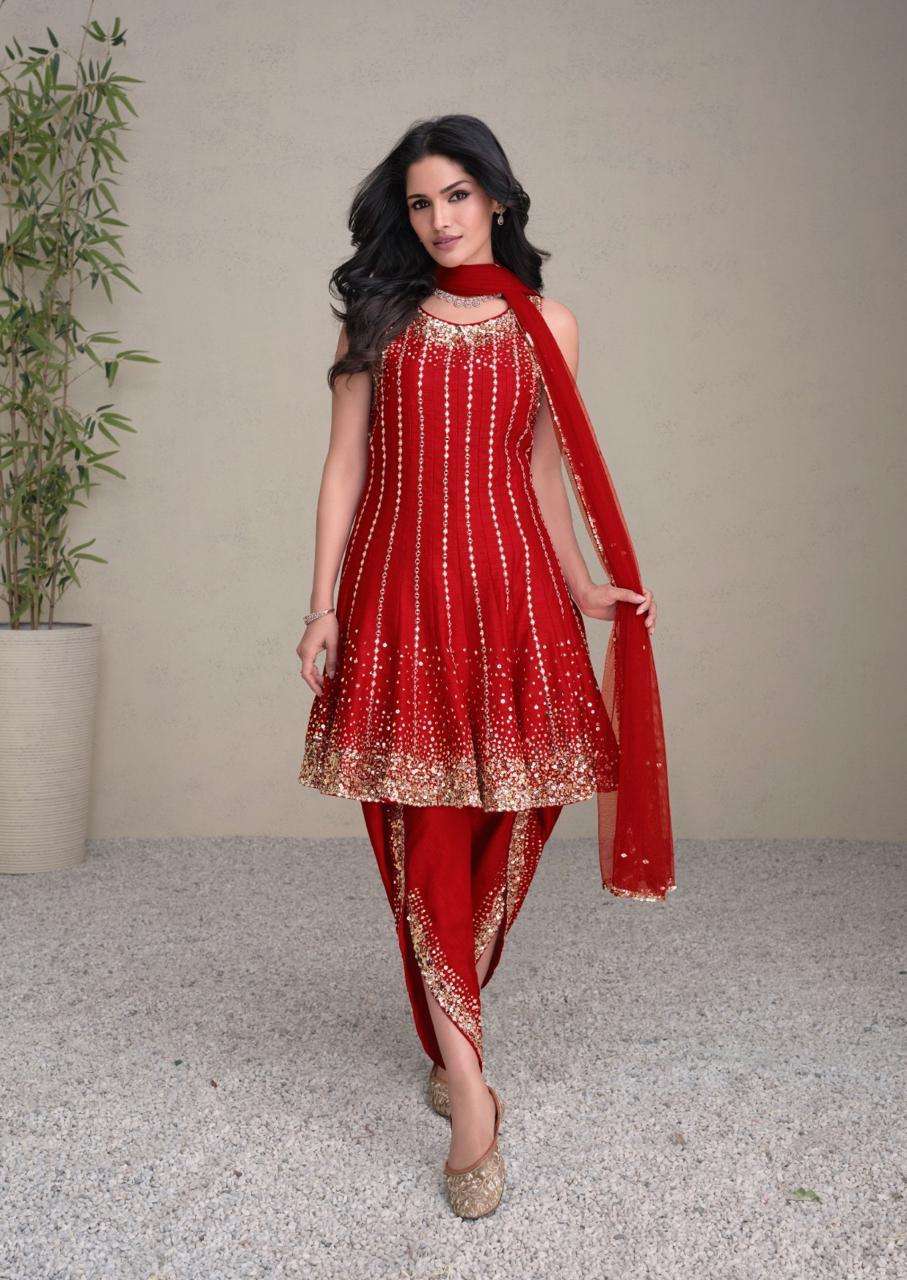 FABRIC - REAL PREMIUM SILK EMBROIDERED TOP WITH DHOTI AND EMBROIDRED NET DUPATTA ( FULL SLEEVES )