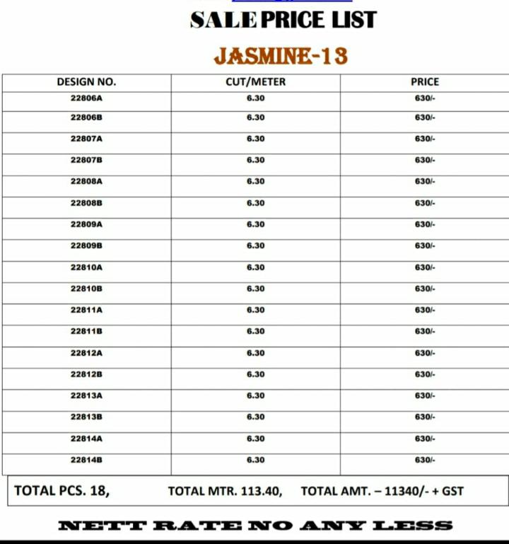 Buy Online Jasmine Vol 13 By Bela Manufacturer Traders Surat 18 Pcs of Full Catalogue at Wholesale Price. Looking for Jasmine Vol 13 By Bela Manufacturer Traders Surat Full Catalouge at Best Price? Buy Now Jasmine Vol 13 By Bela Manufacturer Traders Surat at Wholesale Rate of Rs 11340 with Total 18 Pcs from authroized dealer and supplier of BELA Brand. Cost of Each piece is just only Rs 630 which is very low and affordable price to resale the product in your retail store ,This is Surat based Wholesale Supplier & Dealer of BELA Brand. Click on Brand name to Know more about BELA Brand's products.Call or Whatsapp on 9898838984 for booking or enquiry