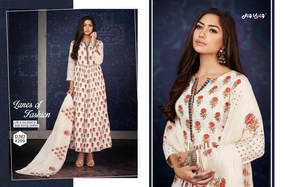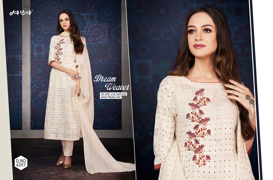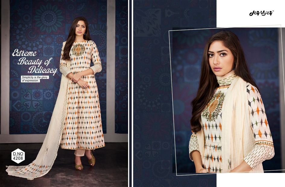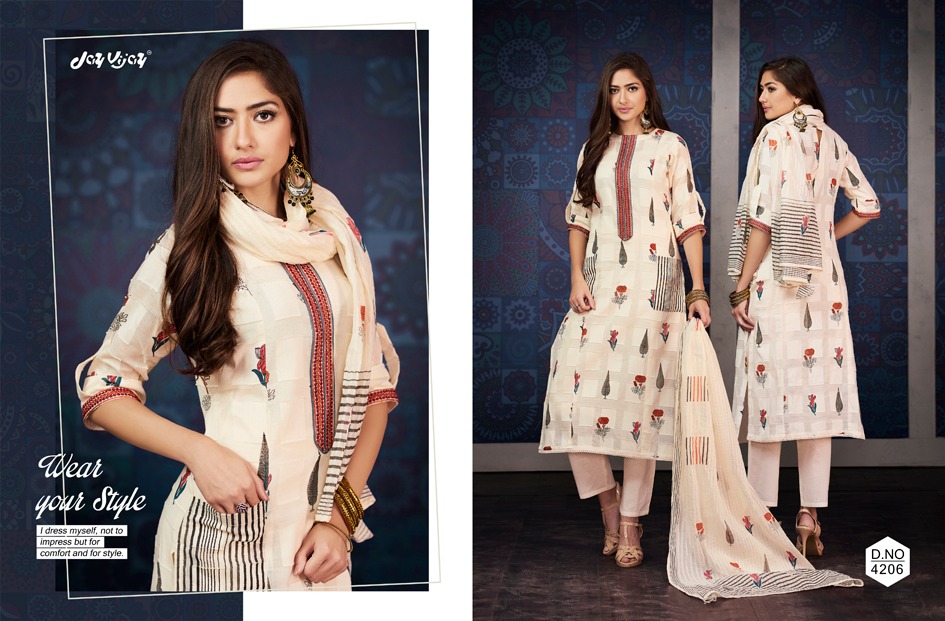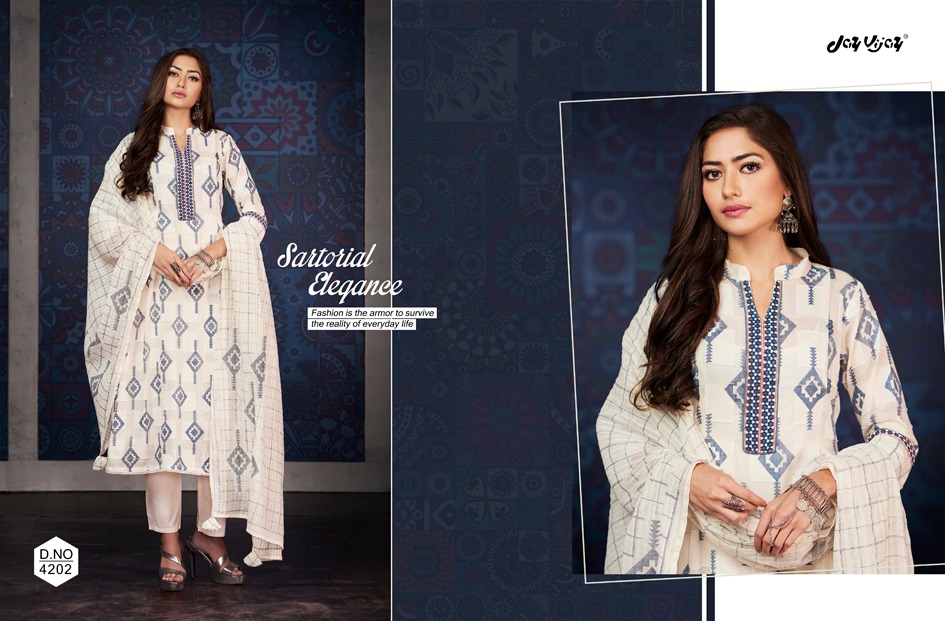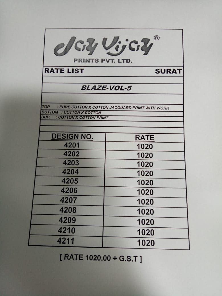 Buy Online Jay Vijay Blaze Vol 5 4201 Series Cotton Salwar Kameez Catlog Wholesale Dealer And Supplier Surat 11 Pcs of Full Catalogue at Wholesale Price. Looking for Jay Vijay Blaze Vol 5 4201 Series Cotton Salwar Kameez Catlog Wholesale Dealer And Supplier Surat Full Catalouge at Best Price? Buy Now Jay Vijay Blaze Vol 5 4201 Series Cotton Salwar Kameez Catlog Wholesale Dealer And Supplier Surat at Wholesale Rate of Rs 11220 with Total 11 Pcs from authroized dealer and supplier of JAY VIJAY Brand. Cost of Each piece is just only Rs 1020 which is very low and affordable price to resale the product in your retail store ,This is Surat based Wholesale Supplier & Dealer of JAY VIJAY Brand. Click on Brand name to Know more about JAY VIJAY Brand's products.Call or Whatsapp on 9898838984 for booking or enquiry
