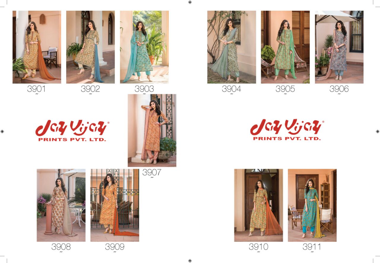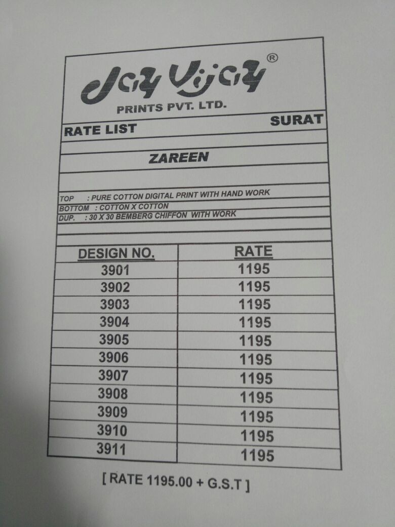 Buy Online Jay Vijay Zareen 3901 Series Coton Digital Print Salwar Suit 11 Pcs of Full Catalogue at Wholesale Price. Looking for Jay Vijay Zareen 3901 Series Coton Digital Print Salwar Suit Full Catalouge at Best Price? Buy Now Jay Vijay Zareen 3901 Series Coton Digital Print Salwar Suit at Wholesale Rate of Rs 13145 with Total 11 Pcs from authroized dealer and supplier of JAY VIJAY Brand. Cost of Each piece is just only Rs 1195 which is very low and affordable price to resale the product in your retail store ,This is Surat based Wholesale Supplier & Dealer of JAY VIJAY Brand. Click on Brand name to Know more about JAY VIJAY Brand's products.Call or Whatsapp on 9898838984 for booking or enquiry