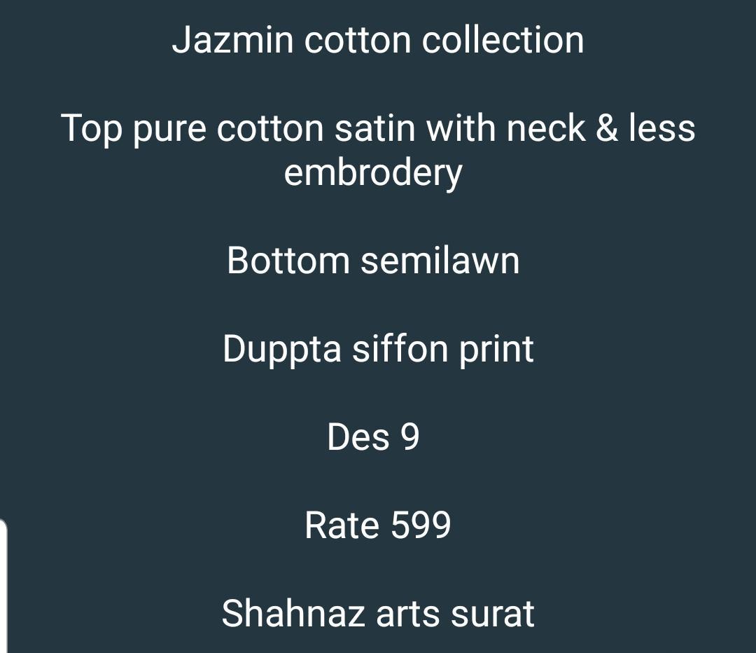 Buy Online Jazmin Cotton Collection By Shahnaz Art Cottan Dress Materials Wholesale Supplier Surat 9 Pcs of Full Catalogue at Wholesale Price. Looking for Jazmin Cotton Collection By Shahnaz Art Cottan Dress Materials Wholesale Supplier Surat Full Catalouge at Best Price? Buy Now Jazmin Cotton Collection By Shahnaz Art Cottan Dress Materials Wholesale Supplier Surat at Wholesale Rate of Rs 5391 with Total 9 Pcs from authroized dealer and supplier of SHAHNAZ ARTS Brand. Cost of Each piece is just only Rs 599 which is very low and affordable price to resale the product in your retail store ,This is Surat based Wholesale Supplier & Dealer of SHAHNAZ ARTS Brand. Click on Brand name to Know more about SHAHNAZ ARTS Brand's products.Call or Whatsapp on 9898838984 for booking or enquiry