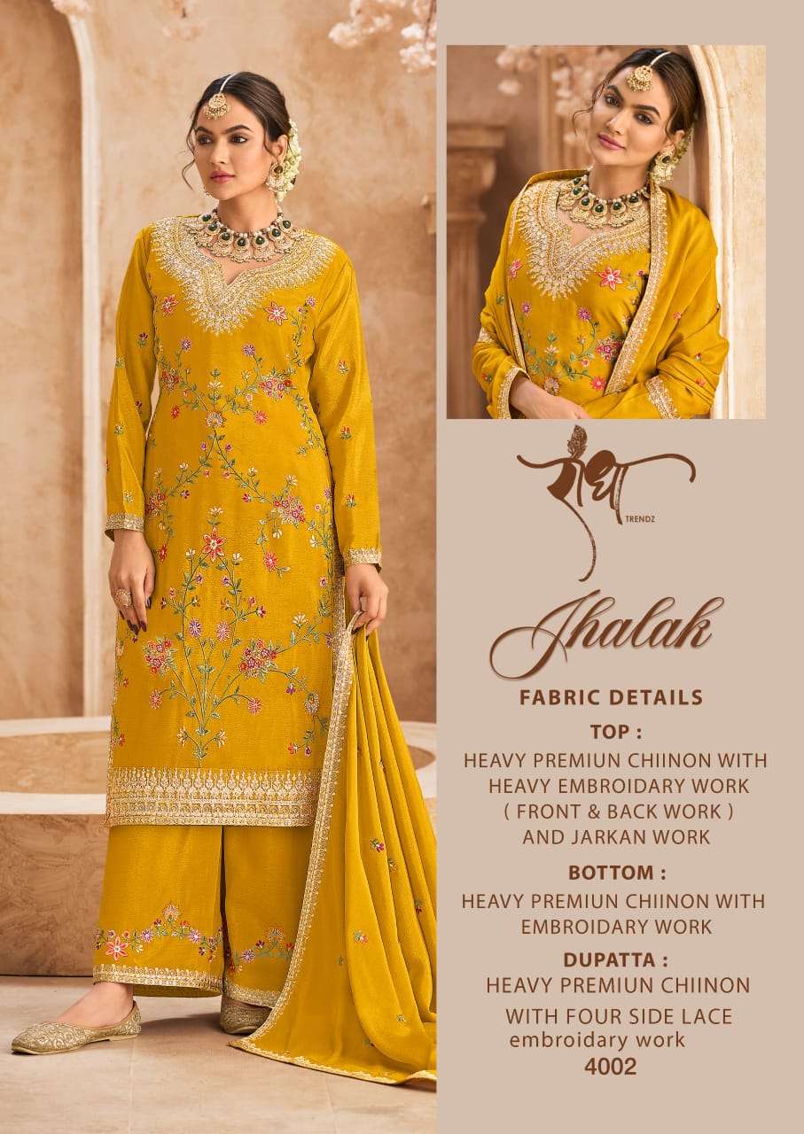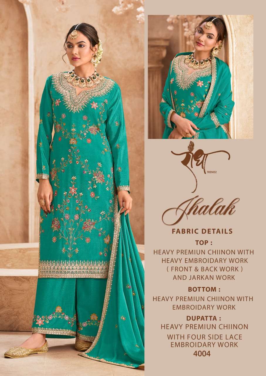 Buy Online JHALAK by RADHA TRENDZ PREMIUM CHINON suit collection manufacturer surat 4 Pcs of Full Catalogue at Wholesale Price. Looking for JHALAK by RADHA TRENDZ PREMIUM CHINON suit collection manufacturer surat Full Catalouge at Best Price? Buy Now JHALAK by RADHA TRENDZ PREMIUM CHINON suit collection manufacturer surat at Wholesale Rate of Rs 8000 with Total 4 Pcs from authroized dealer and supplier of Radha Trendz Brand. Cost of Each piece is just only Rs 2000 which is very low and affordable price to resale the product in your retail store ,This is Surat based Wholesale Supplier & Dealer of Radha Trendz Brand. Click on Brand name to Know more about Radha Trendz Brand's products.Call or Whatsapp on 9898838984 for booking or enquiry