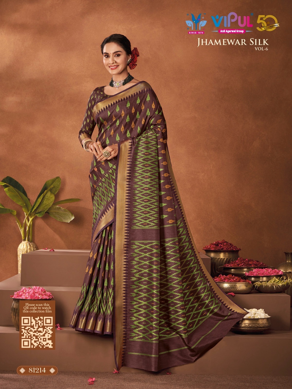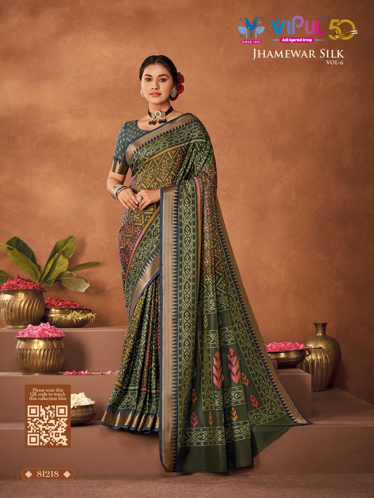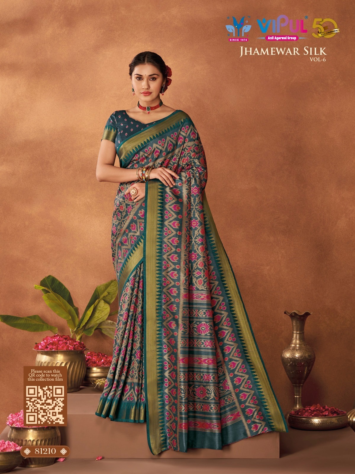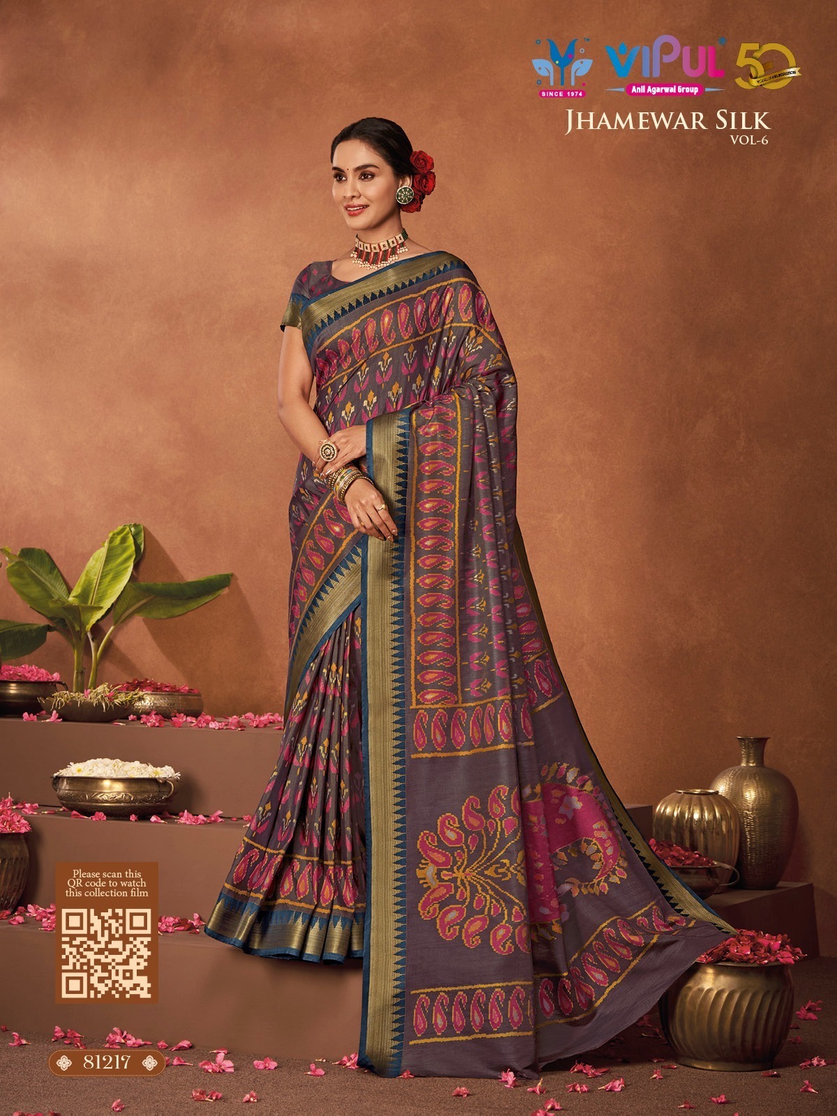 BRAND NAME Â? VIPUL CATALOG NAME Â? JHAMEWAR SILK VOL-06 SERIES - 81207 TO 81218 Fabric- Two tone saree with exclusive print and weaving border RATE - 942/- PER PCS GST 5% EXTRA SINGLEÂ AVAILABLE 100+ SINGLE |