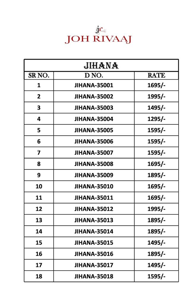 Buy Online Jihana By Joh Rivaaj 18 Pcs of Full Catalogue at Wholesale Price. Looking for Jihana By Joh Rivaaj Full Catalouge at Best Price? Buy Now Jihana By Joh Rivaaj at Wholesale Rate of Rs 0 with Total 18 Pcs from authroized dealer and supplier of JOH RIVAAJ Brand. Cost of Each piece is just only Rs 0 which is very low and affordable price to resale the product in your retail store ,This is Surat based Wholesale Supplier & Dealer of JOH RIVAAJ Brand. Click on Brand name to Know more about JOH RIVAAJ Brand's products.Call or Whatsapp on 9898838984 for booking or enquiry
