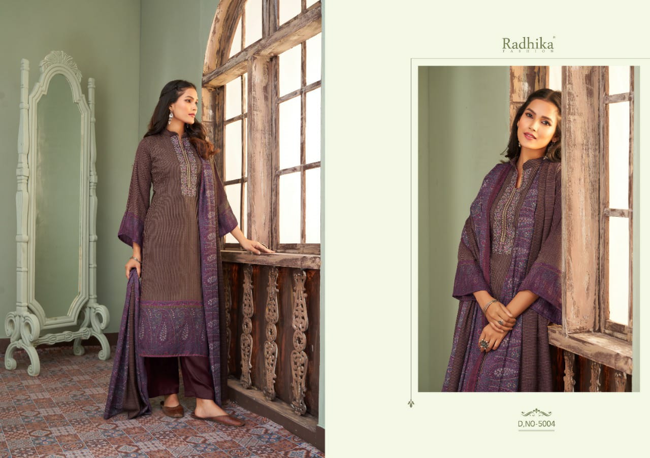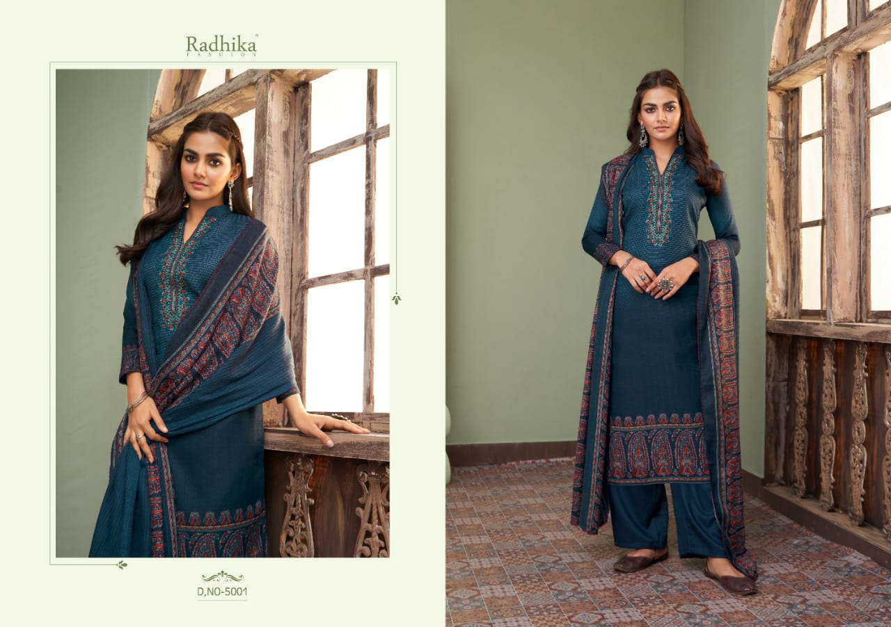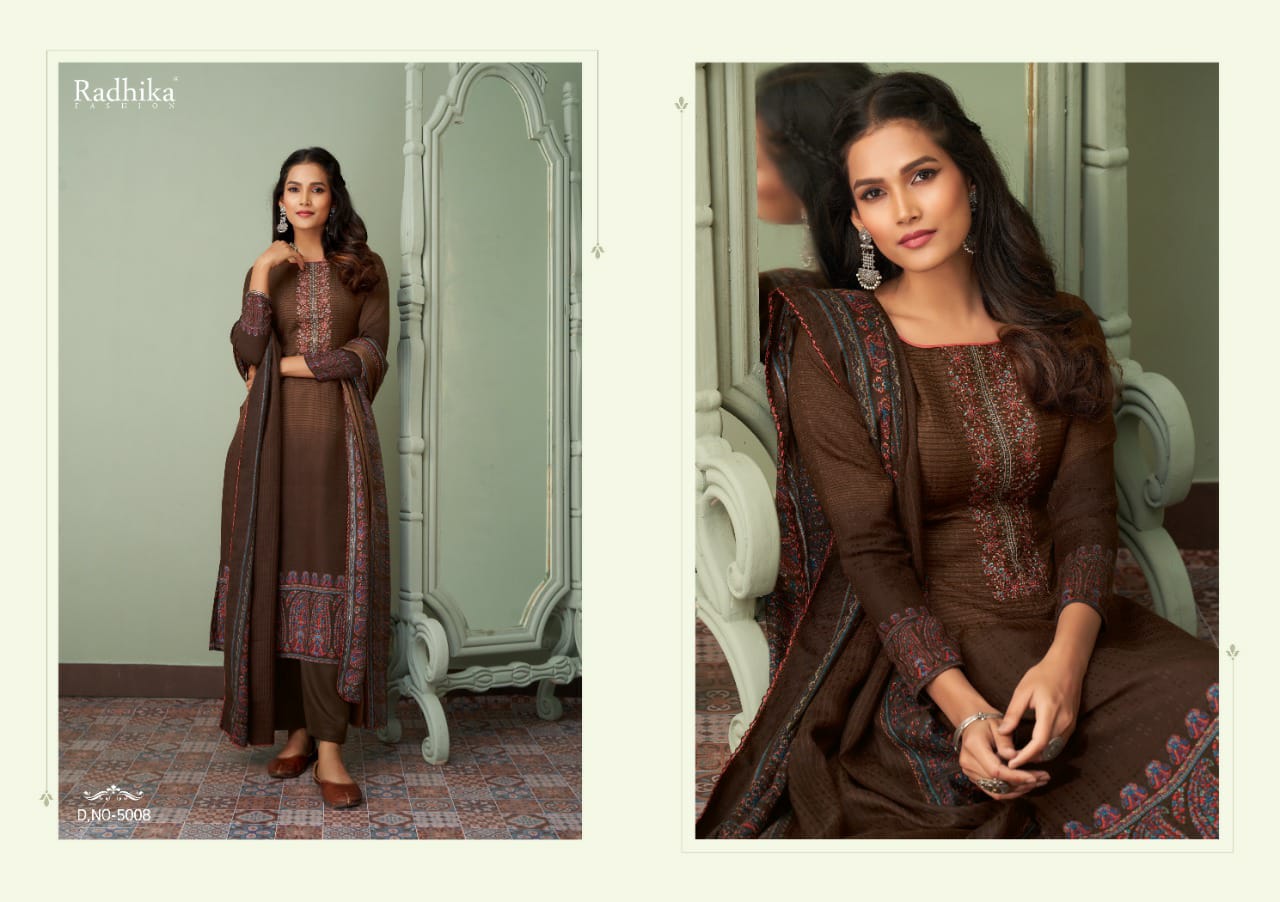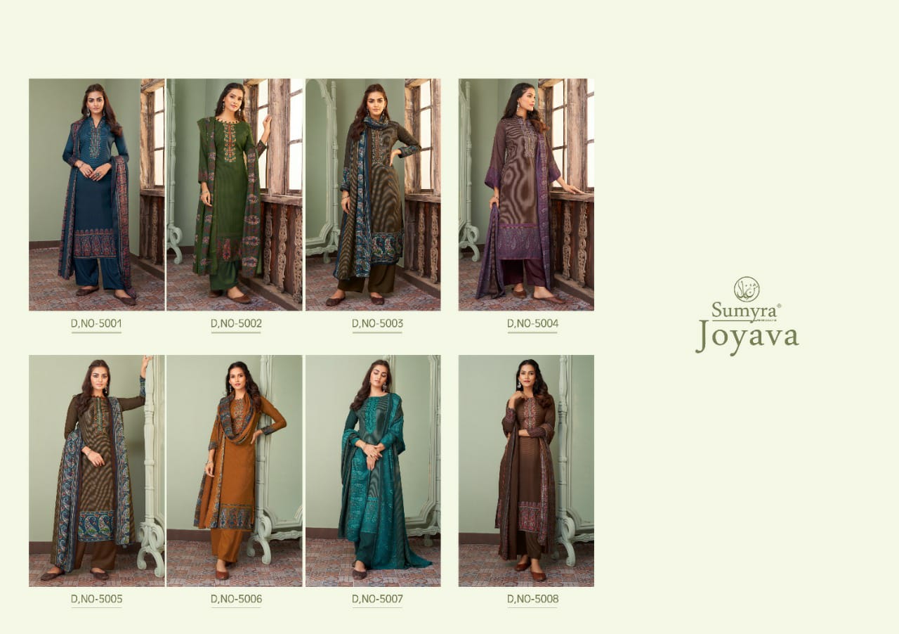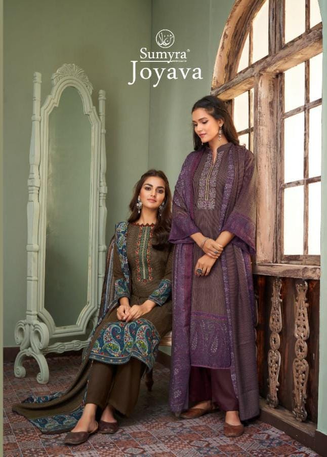 _*............Sumyra...........*_ _presents_ *"JOYAVAÂ?* ?Top: pure pashmina designer print with self embroidery ?Dupatta: pashmina shawl print with arca lace ?Bottom: pashmina ? Pcs: 8 pic catalog Rate- 570/- Set to set Your trust is our capital *Radhika fashion* |