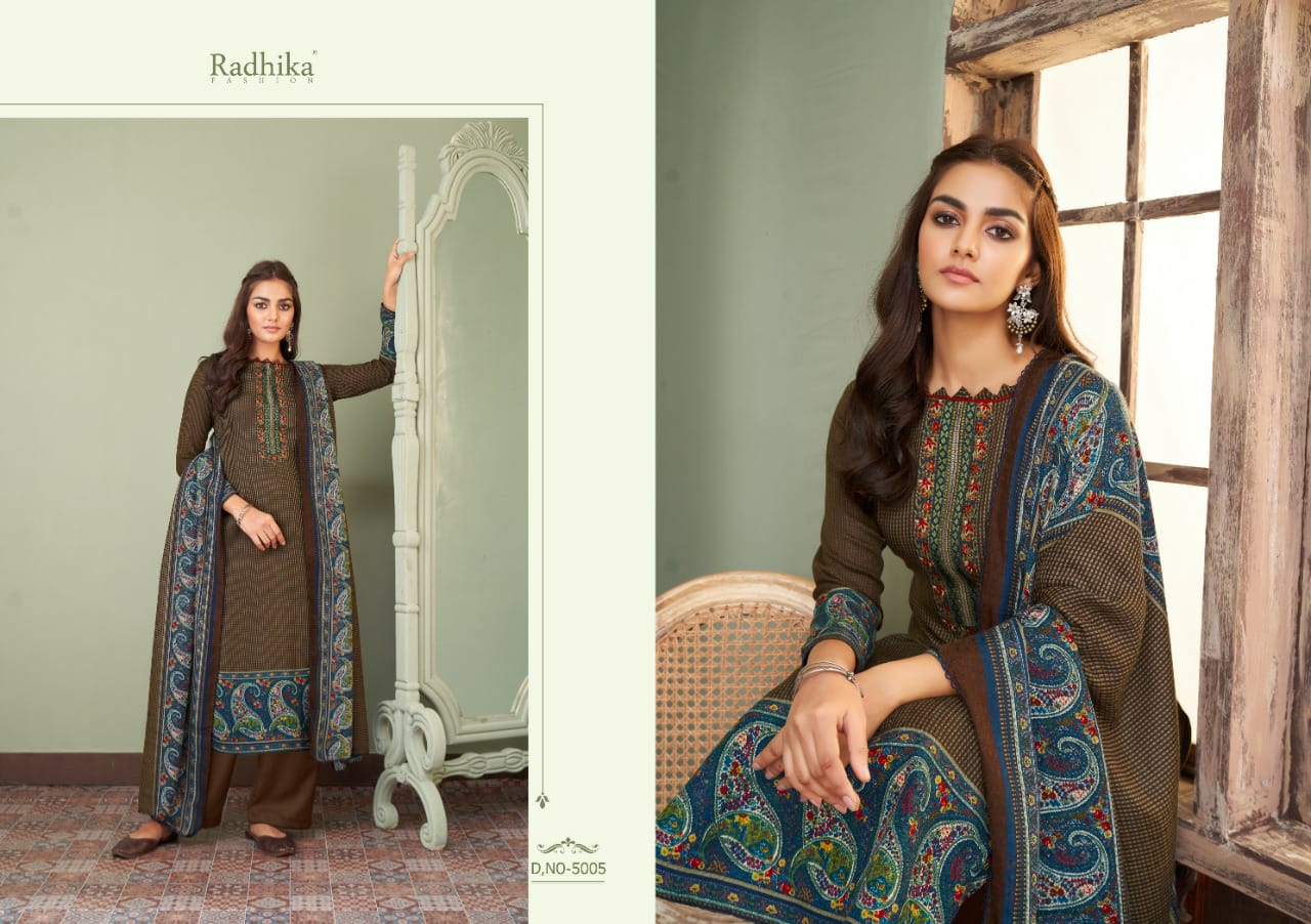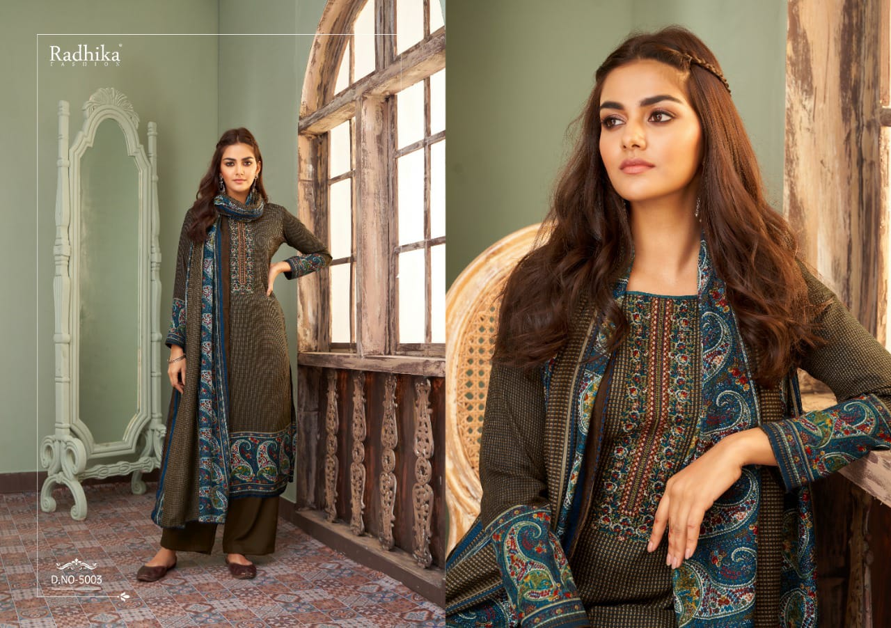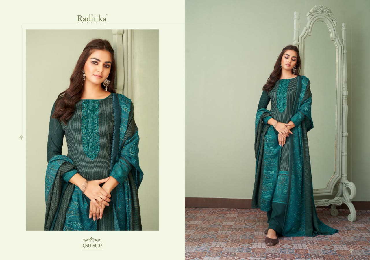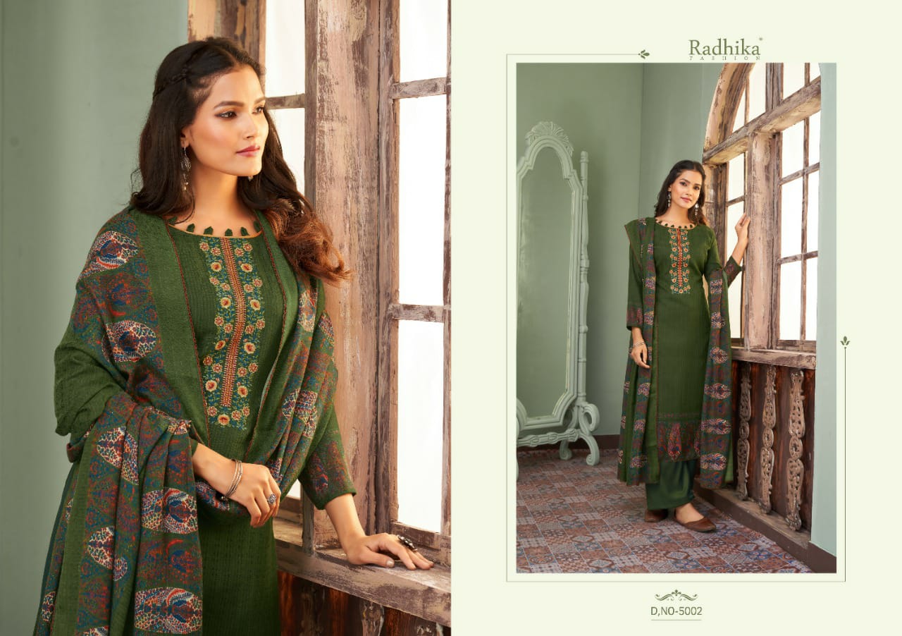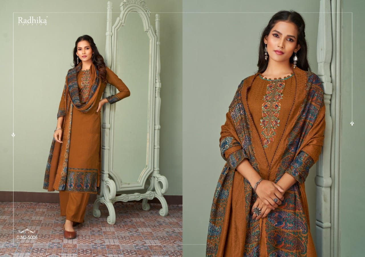 _*............Sumyra...........*_ _presents_ *"JOYAVAÂ?* ?Top: pure pashmina designer print with self embroidery ?Dupatta: pashmina shawl print with arca lace ?Bottom: pashmina ? Pcs: 8 pic catalog Rate- 570/- Set to set Your trust is our capital *Radhika fashion* |