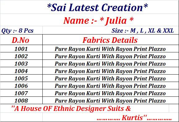 Buy Online Julia By Slc Kurtis With Plazzo Wholesale Supplier Surat 8 Pcs of Full Catalogue at Wholesale Price. Looking for Julia By Slc Kurtis With Plazzo Wholesale Supplier Surat Full Catalouge at Best Price? Buy Now Julia By Slc Kurtis With Plazzo Wholesale Supplier Surat at Wholesale Rate of Rs 5200 with Total 8 Pcs from authroized dealer and supplier of Brand. Cost of Each piece is just only Rs 650 which is very low and affordable price to resale the product in your retail store ,This is Surat based Wholesale Supplier & Dealer of Brand. Click on Brand name to Know more about Brand's products.Call or Whatsapp on 9898838984 for booking or enquiry