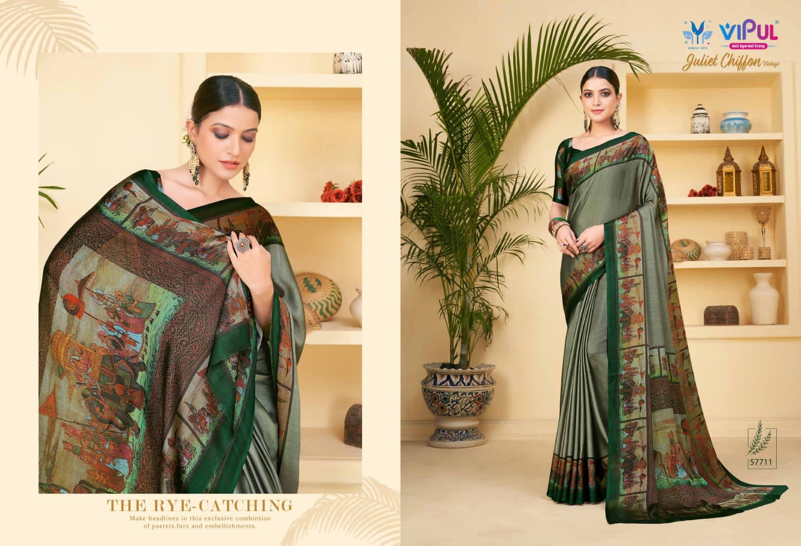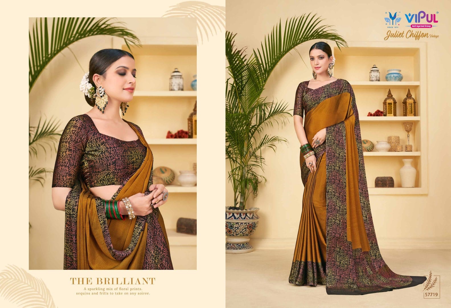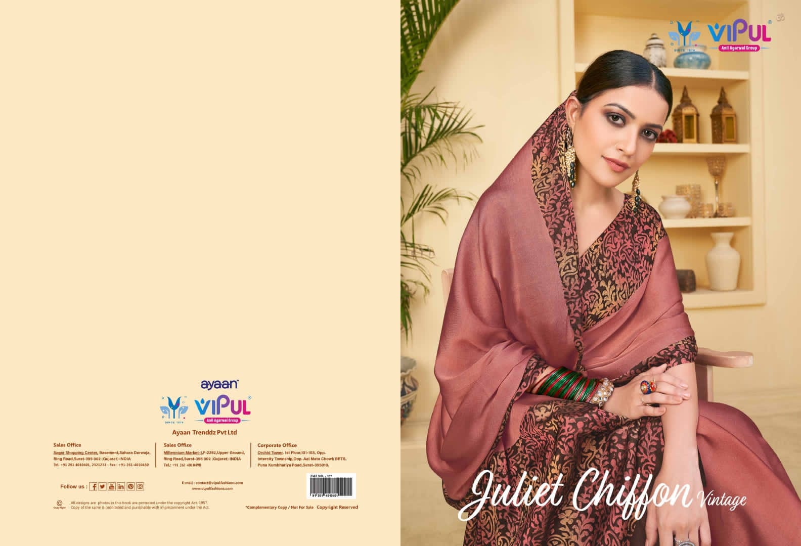 Buy Online Juliet Chiffon Vintage By Vipul Designer Saree Dealer From India 12 Pcs of Full Catalogue at Wholesale Price. Looking for Juliet Chiffon Vintage By Vipul Designer Saree Dealer From India Full Catalouge at Best Price? Buy Now Juliet Chiffon Vintage By Vipul Designer Saree Dealer From India at Wholesale Rate of Rs 7200 with Total 12 Pcs from authroized dealer and supplier of VIPUL Brand. Cost of Each piece is just only Rs 600 which is very low and affordable price to resale the product in your retail store ,This is Surat based Wholesale Supplier & Dealer of VIPUL Brand. Click on Brand name to Know more about VIPUL Brand's products.Call or Whatsapp on 9898838984 for booking or enquiry