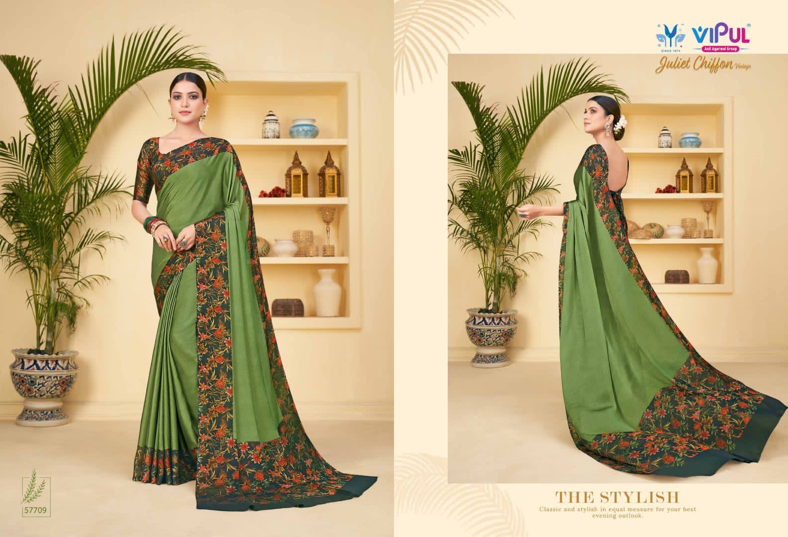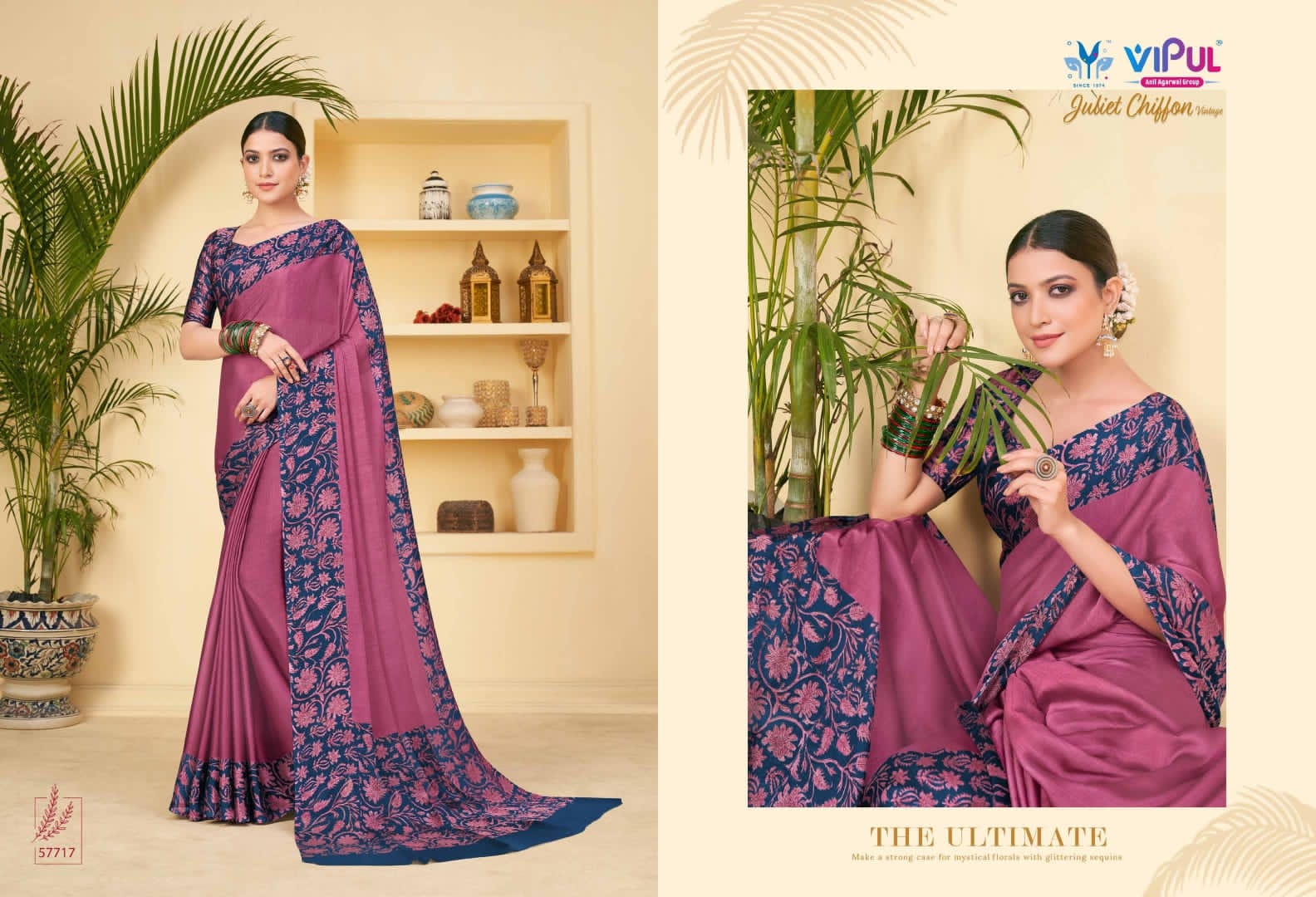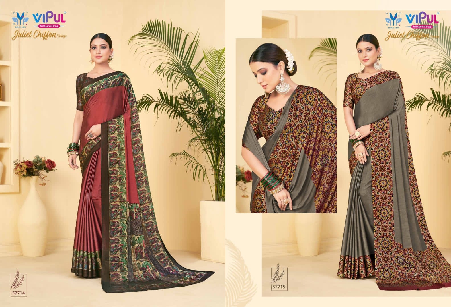 Buy Online Juliet Chiffon Vintage By Vipul Designer Saree Dealer From India 12 Pcs of Full Catalogue at Wholesale Price. Looking for Juliet Chiffon Vintage By Vipul Designer Saree Dealer From India Full Catalouge at Best Price? Buy Now Juliet Chiffon Vintage By Vipul Designer Saree Dealer From India at Wholesale Rate of Rs 7200 with Total 12 Pcs from authroized dealer and supplier of VIPUL Brand. Cost of Each piece is just only Rs 600 which is very low and affordable price to resale the product in your retail store ,This is Surat based Wholesale Supplier & Dealer of VIPUL Brand. Click on Brand name to Know more about VIPUL Brand's products.Call or Whatsapp on 9898838984 for booking or enquiry