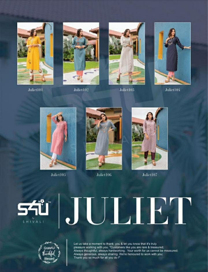 *Brand :* S4U *Catalog Name:* Juliet Kurti With Pant *Price:* ?951 *Piece:* 6 *Total Price:* 5706 ( GST Extra ) *Size:* M,L,XL,XXL *Fabric:* rayon *Availibility:* On Booking |