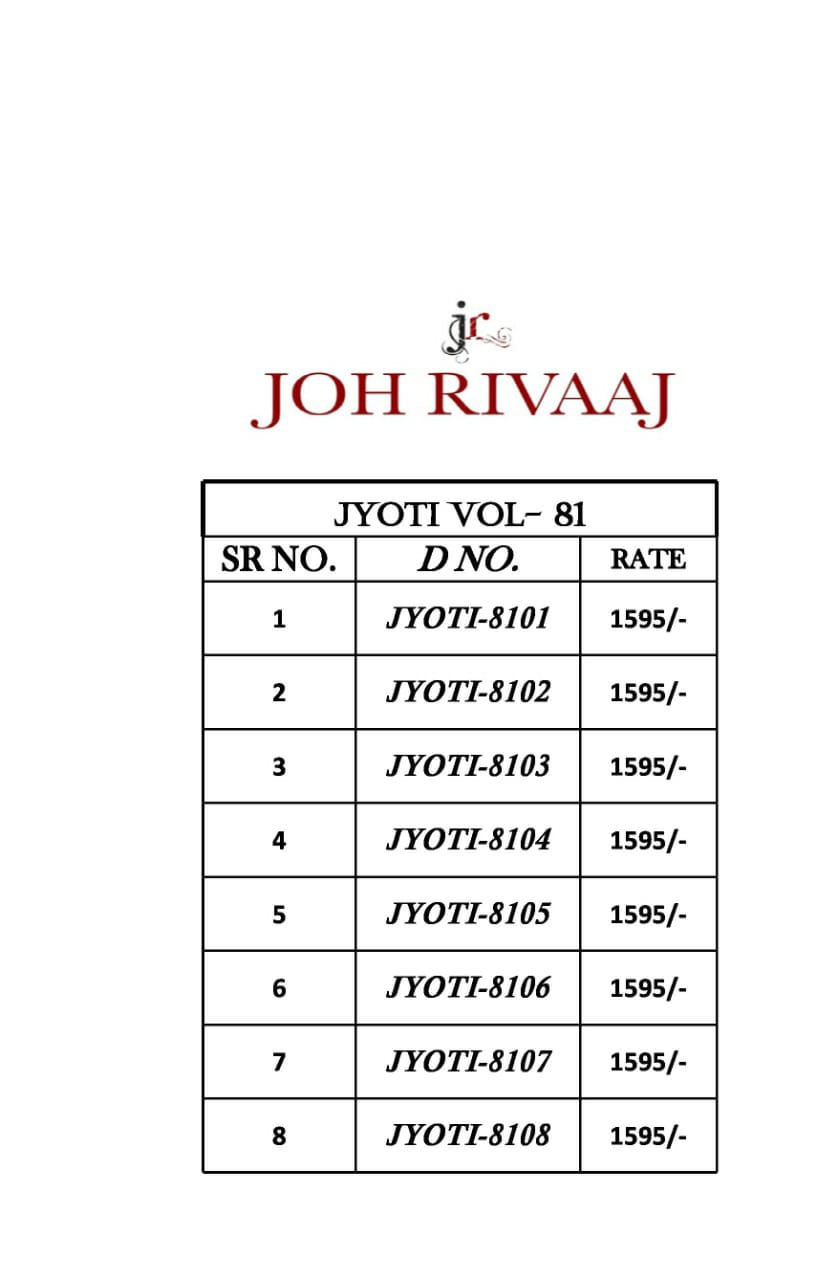 Buy Online Jyoti Vol 81 By Joh Rivaaj Designer Saree Wholesale Suppliers And Dealer From India 8 Pcs of Full Catalogue at Wholesale Price. Looking for Jyoti Vol 81 By Joh Rivaaj Designer Saree Wholesale Suppliers And Dealer From India Full Catalouge at Best Price? Buy Now Jyoti Vol 81 By Joh Rivaaj Designer Saree Wholesale Suppliers And Dealer From India at Wholesale Rate of Rs 12760 with Total 8 Pcs from authroized dealer and supplier of Brand. Cost of Each piece is just only Rs 1595 which is very low and affordable price to resale the product in your retail store ,This is Surat based Wholesale Supplier & Dealer of Brand. Click on Brand name to Know more about Brand's products.Call or Whatsapp on 9898838984 for booking or enquiry