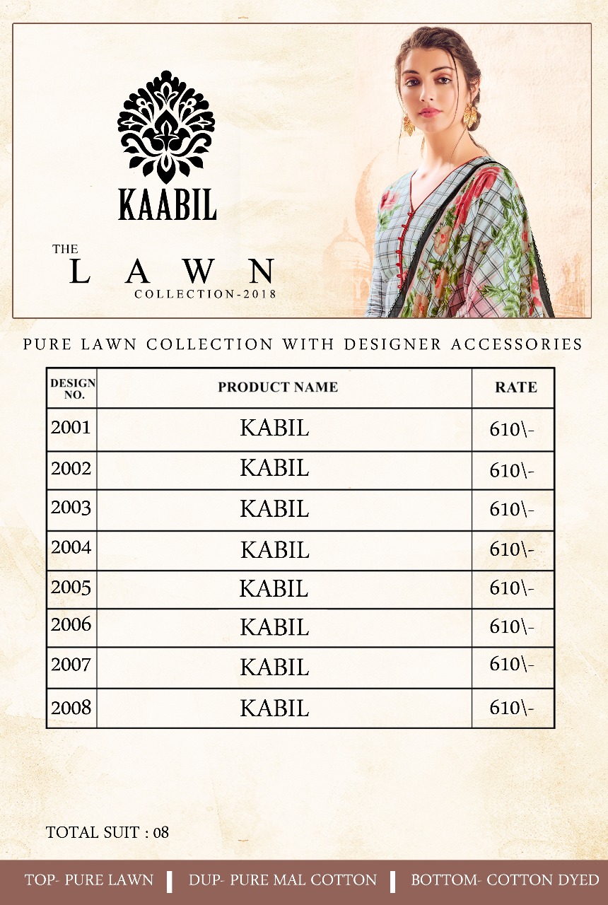 Buy Online Kaabil Lawn Collection Vol 5 Manufactured By Karachi Prints Wholesale Supplier And Dealer Surat 8 Pcs of Full Catalogue at Wholesale Price. Looking for Kaabil Lawn Collection Vol 5 Manufactured By Karachi Prints Wholesale Supplier And Dealer Surat Full Catalouge at Best Price? Buy Now Kaabil Lawn Collection Vol 5 Manufactured By Karachi Prints Wholesale Supplier And Dealer Surat at Wholesale Rate of Rs 4880 with Total 8 Pcs from authroized dealer and supplier of BRAND'S Brand. Cost of Each piece is just only Rs 610 which is very low and affordable price to resale the product in your retail store ,This is Surat based Wholesale Supplier & Dealer of BRAND'S Brand. Click on Brand name to Know more about BRAND'S Brand's products.Call or Whatsapp on 9898838984 for booking or enquiry
