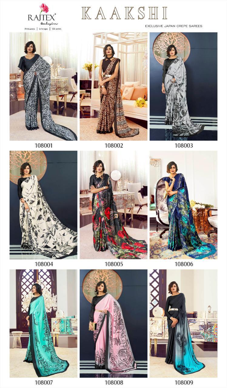 Buy Online Kaakahi By Raj Tex Series 108001 Tp 108018 Satin Crepe Sarees Set And Single Wholesale Supplier And Dealer Surat 18 Pcs of Full Catalogue at Wholesale Price. Looking for Kaakahi By Raj Tex Series 108001 Tp 108018 Satin Crepe Sarees Set And Single Wholesale Supplier And Dealer Surat Full Catalouge at Best Price? Buy Now Kaakahi By Raj Tex Series 108001 Tp 108018 Satin Crepe Sarees Set And Single Wholesale Supplier And Dealer Surat at Wholesale Rate of Rs 9450 with Total 18 Pcs from authroized dealer and supplier of RAJTEX Brand. Cost of Each piece is just only Rs 525 which is very low and affordable price to resale the product in your retail store ,This is Surat based Wholesale Supplier & Dealer of RAJTEX Brand. Click on Brand name to Know more about RAJTEX Brand's products.Call or Whatsapp on 9898838984 for booking or enquiry