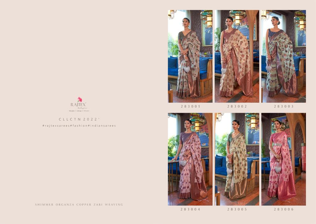 BRAND NAME Â? *RAJTEX* CATALOG NAME Â? *KADVIKA SILK* SERIES Â? 283001 TO 283006 FABRIC Â? SHIMMER ORGANZA COPPER ZARI WEAVING RATE Â? 1360/- PER PCS GST EXTRA BOOK YOUR ORDER NOW 100+Singles |