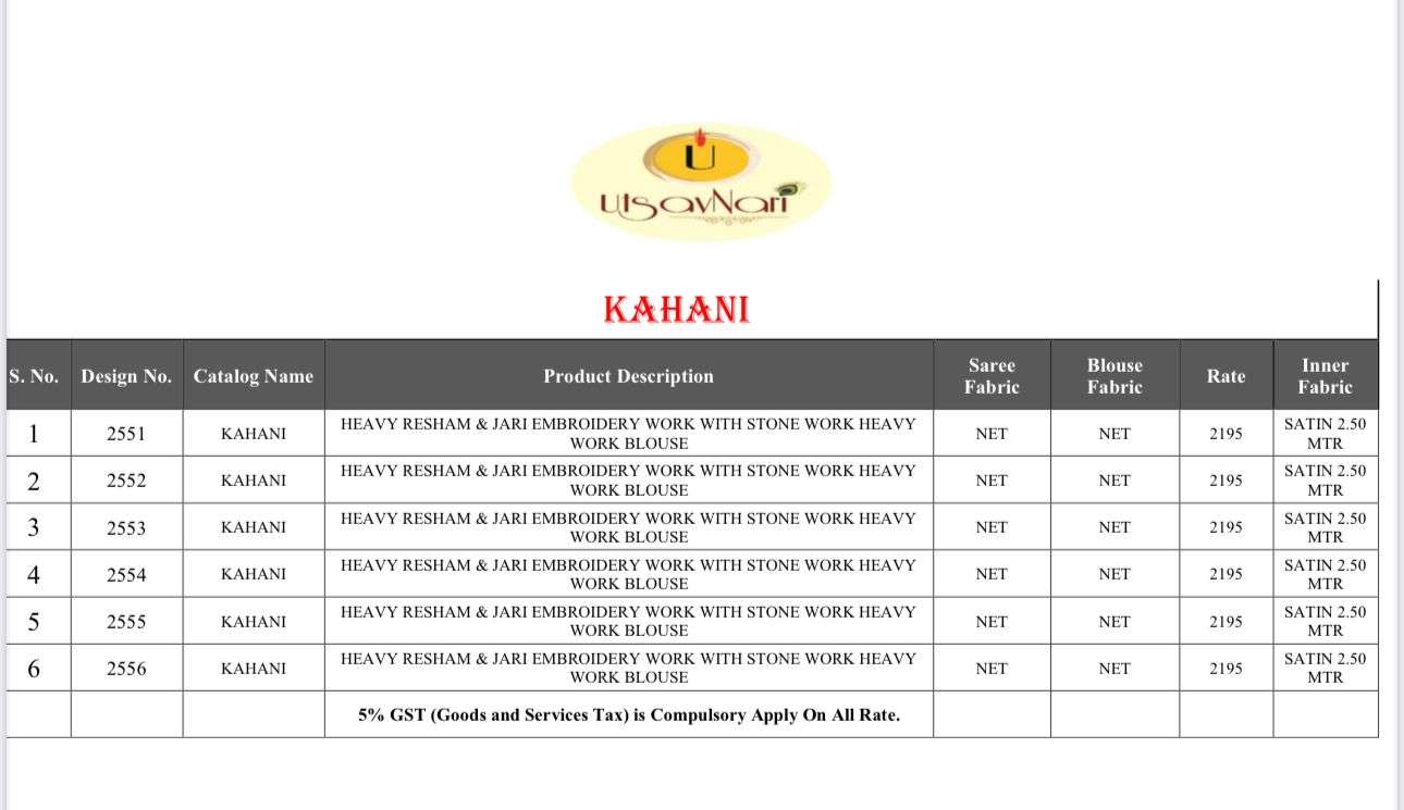 Buy Online KAHANI by utsavnari Net saree collection manufacturer surat 6 Pcs of Full Catalogue at Wholesale Price. Looking for KAHANI by utsavnari Net saree collection manufacturer surat Full Catalouge at Best Price? Buy Now KAHANI by utsavnari Net saree collection manufacturer surat at Wholesale Rate of Rs 13170 with Total 6 Pcs from authroized dealer and supplier of UTSAV NARI Brand. Cost of Each piece is just only Rs 2195 which is very low and affordable price to resale the product in your retail store ,This is Surat based Wholesale Supplier & Dealer of UTSAV NARI Brand. Click on Brand name to Know more about UTSAV NARI Brand's products.Call or Whatsapp on 9898838984 for booking or enquiry