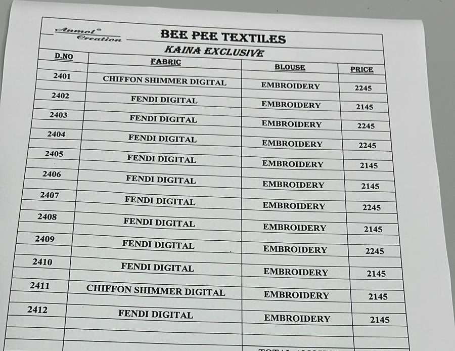 Buy Online KAINA EXCLUSIVE by ANMOL CREATION saree Collection manufacturer surat 12 Pcs of Full Catalogue at Wholesale Price. Looking for KAINA EXCLUSIVE by ANMOL CREATION saree Collection manufacturer surat Full Catalouge at Best Price? Buy Now KAINA EXCLUSIVE by ANMOL CREATION saree Collection manufacturer surat at Wholesale Rate of Rs 0 with Total 12 Pcs from authroized dealer and supplier of BRAND'S Brand. Cost of Each piece is just only Rs 0 which is very low and affordable price to resale the product in your retail store ,This is Surat based Wholesale Supplier & Dealer of BRAND'S Brand. Click on Brand name to Know more about BRAND'S Brand's products.Call or Whatsapp on 9898838984 for booking or enquiry
