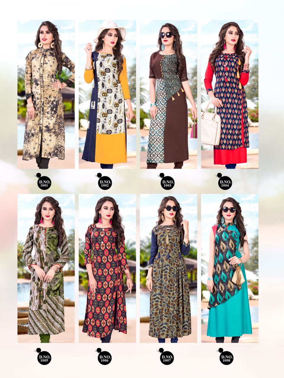 Kainaat Vol 1 1001 To 1008 Series Reyon Printes Kurti Saller