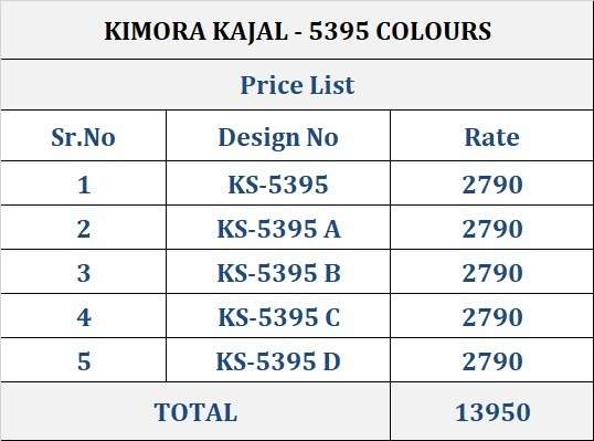 Buy Online Kajal Series 5395 TO 5395D by Kimora saree collection manufacturer Surat 5 Pcs of Full Catalogue at Wholesale Price. Looking for Kajal Series 5395 TO 5395D by Kimora saree collection manufacturer Surat Full Catalouge at Best Price? Buy Now Kajal Series 5395 TO 5395D by Kimora saree collection manufacturer Surat at Wholesale Rate of Rs 13950 with Total 5 Pcs from authroized dealer and supplier of KIMORA Brand. Cost of Each piece is just only Rs 2790 which is very low and affordable price to resale the product in your retail store ,This is Surat based Wholesale Supplier & Dealer of KIMORA Brand. Click on Brand name to Know more about KIMORA Brand's products.Call or Whatsapp on 9898838984 for booking or enquiry