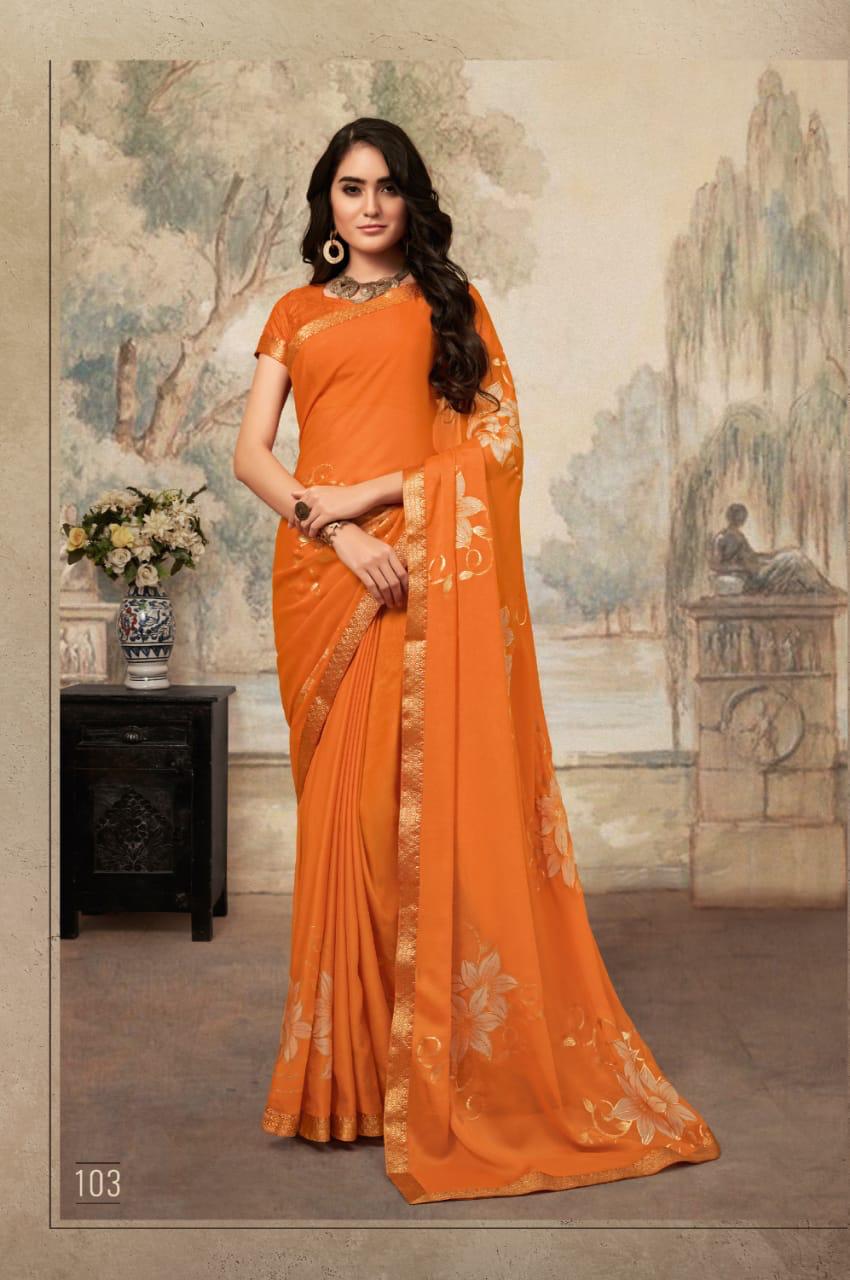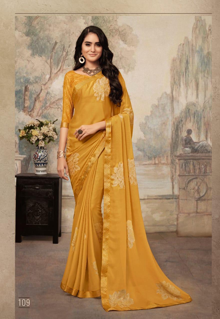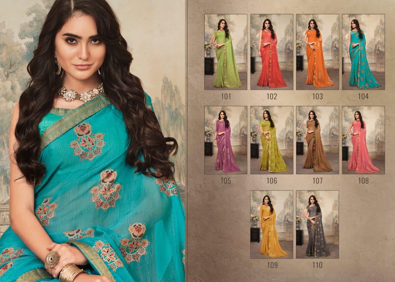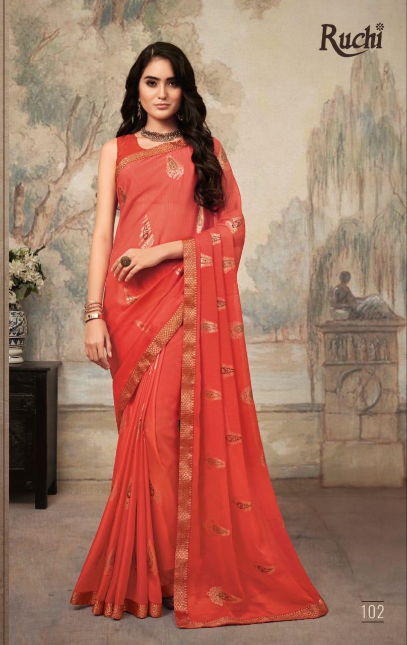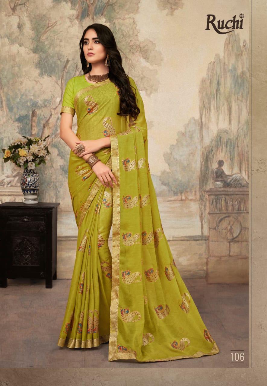 Buy Online Kajari By Ruchi Series 101 To 110 Sarees Set And Single Wholesale Supplier Gujarat 10 Pcs of Full Catalogue at Wholesale Price. Looking for Kajari By Ruchi Series 101 To 110 Sarees Set And Single Wholesale Supplier Gujarat Full Catalouge at Best Price? Buy Now Kajari By Ruchi Series 101 To 110 Sarees Set And Single Wholesale Supplier Gujarat at Wholesale Rate of Rs 7300 with Total 10 Pcs from authroized dealer and supplier of RUCHI SAREE Brand. Cost of Each piece is just only Rs 730 which is very low and affordable price to resale the product in your retail store ,This is Surat based Wholesale Supplier & Dealer of RUCHI SAREE Brand. Click on Brand name to Know more about RUCHI SAREE Brand's products.Call or Whatsapp on 9898838984 for booking or enquiry