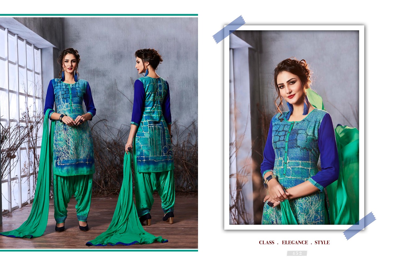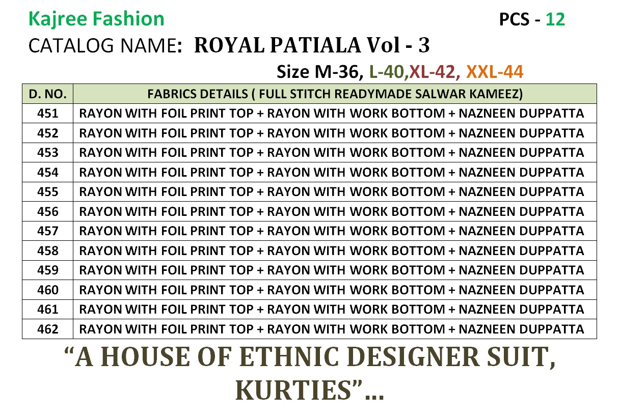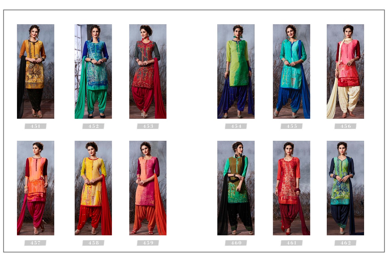 Buy Online Kajree Fashion Royal Patiala Vol 3 451 Series Patiala Suits 12 Pcs of Full Catalogue at Wholesale Price. Looking for Kajree Fashion Royal Patiala Vol 3 451 Series Patiala Suits Full Catalouge at Best Price? Buy Now Kajree Fashion Royal Patiala Vol 3 451 Series Patiala Suits at Wholesale Rate of Rs 9588 with Total 12 Pcs from authroized dealer and supplier of KESSI Brand. Cost of Each piece is just only Rs 799 which is very low and affordable price to resale the product in your retail store ,This is Surat based Wholesale Supplier & Dealer of KESSI Brand. Click on Brand name to Know more about KESSI Brand's products.Call or Whatsapp on 9898838984 for booking or enquiry