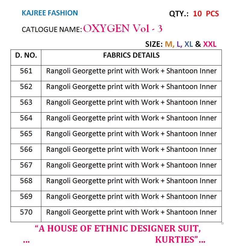 Kajree Price 499+gst Only full set New catalog "Oxygen Vol - 3" ?Catalog - Oxygen Vol - 3 ?Series - 561-570 ?Fabric :- Rangoli Georgette print with Work + Shantoon Inner ?Size :- M-38, L-40, XL-42, XXL-44 ?Total Design :- 10 ?Dispatching 5 to 6 days later ?Booking started from now...? Book your order soon... order and inquiry +919898838984 |