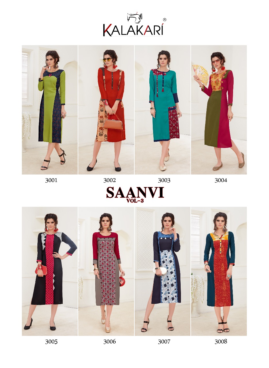 Buy Online Kalakari Nx Saanvi Vol 3 3001 Series Designer Rayon Kurti 8 Pcs of Full Catalogue at Wholesale Price. Looking for Kalakari Nx Saanvi Vol 3 3001 Series Designer Rayon Kurti Full Catalouge at Best Price? Buy Now Kalakari Nx Saanvi Vol 3 3001 Series Designer Rayon Kurti at Wholesale Rate of Rs 3400 with Total 8 Pcs from authroized dealer and supplier of KALAKARI NX Brand. Cost of Each piece is just only Rs 425 which is very low and affordable price to resale the product in your retail store ,This is Surat based Wholesale Supplier & Dealer of KALAKARI NX Brand. Click on Brand name to Know more about KALAKARI NX Brand's products.Call or Whatsapp on 9898838984 for booking or enquiry