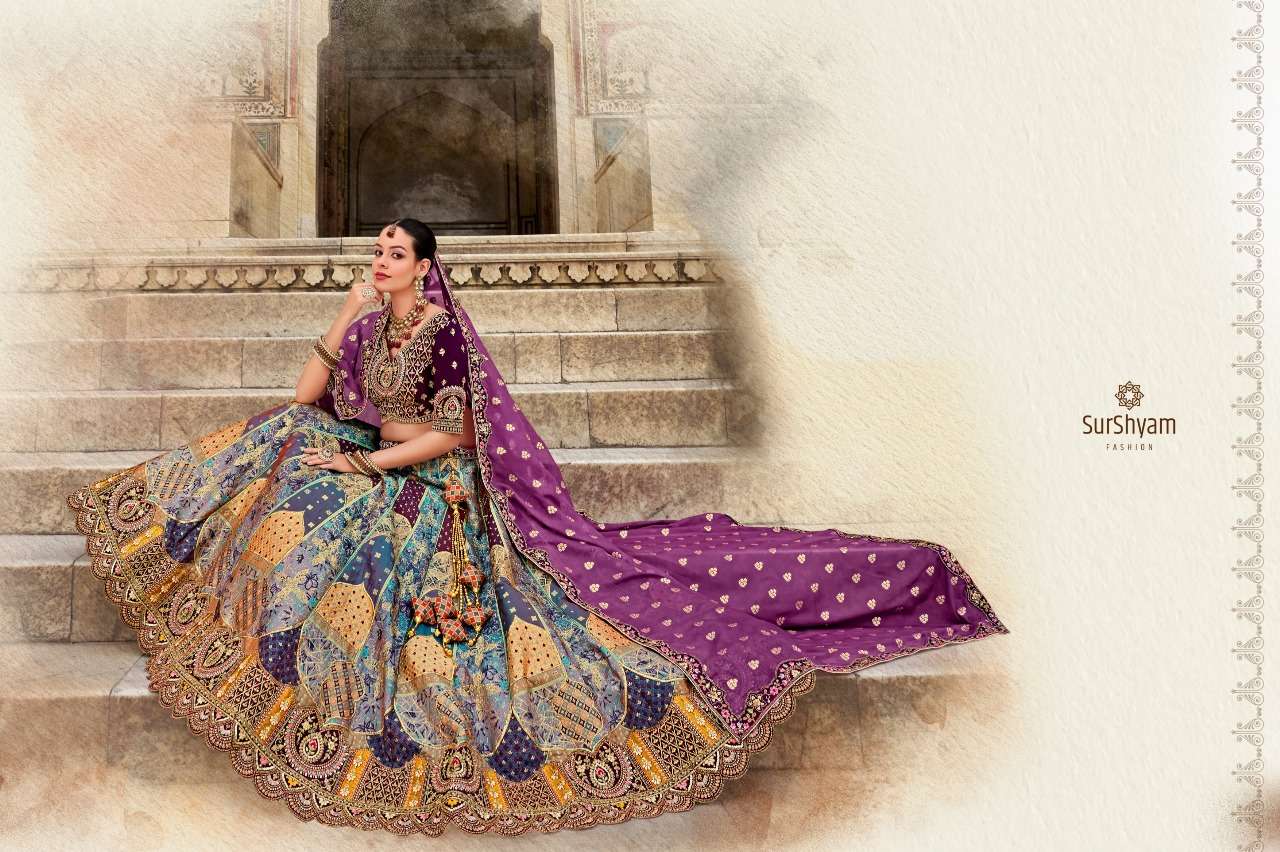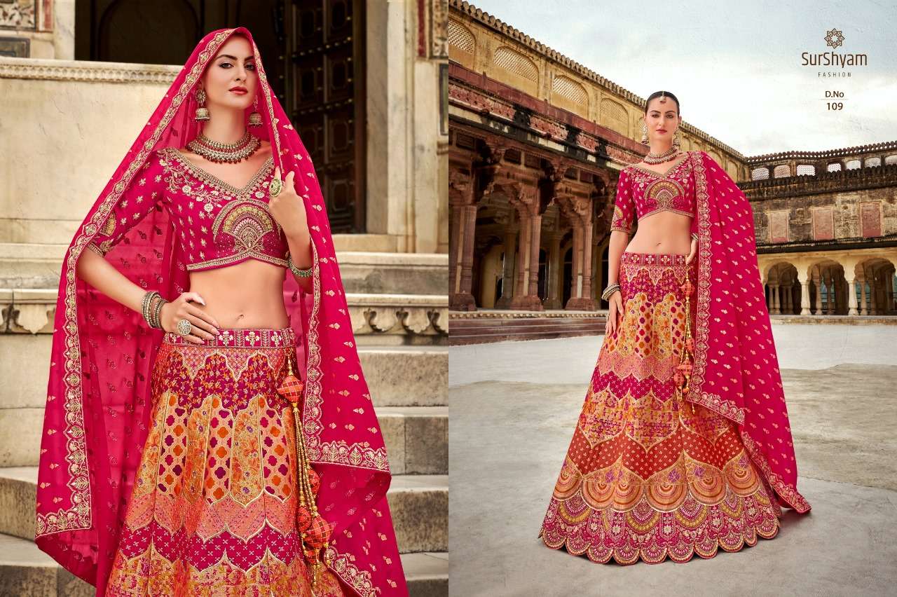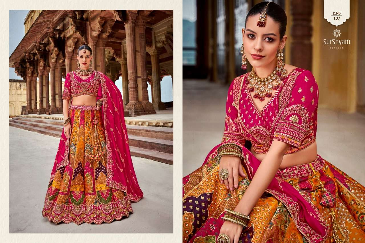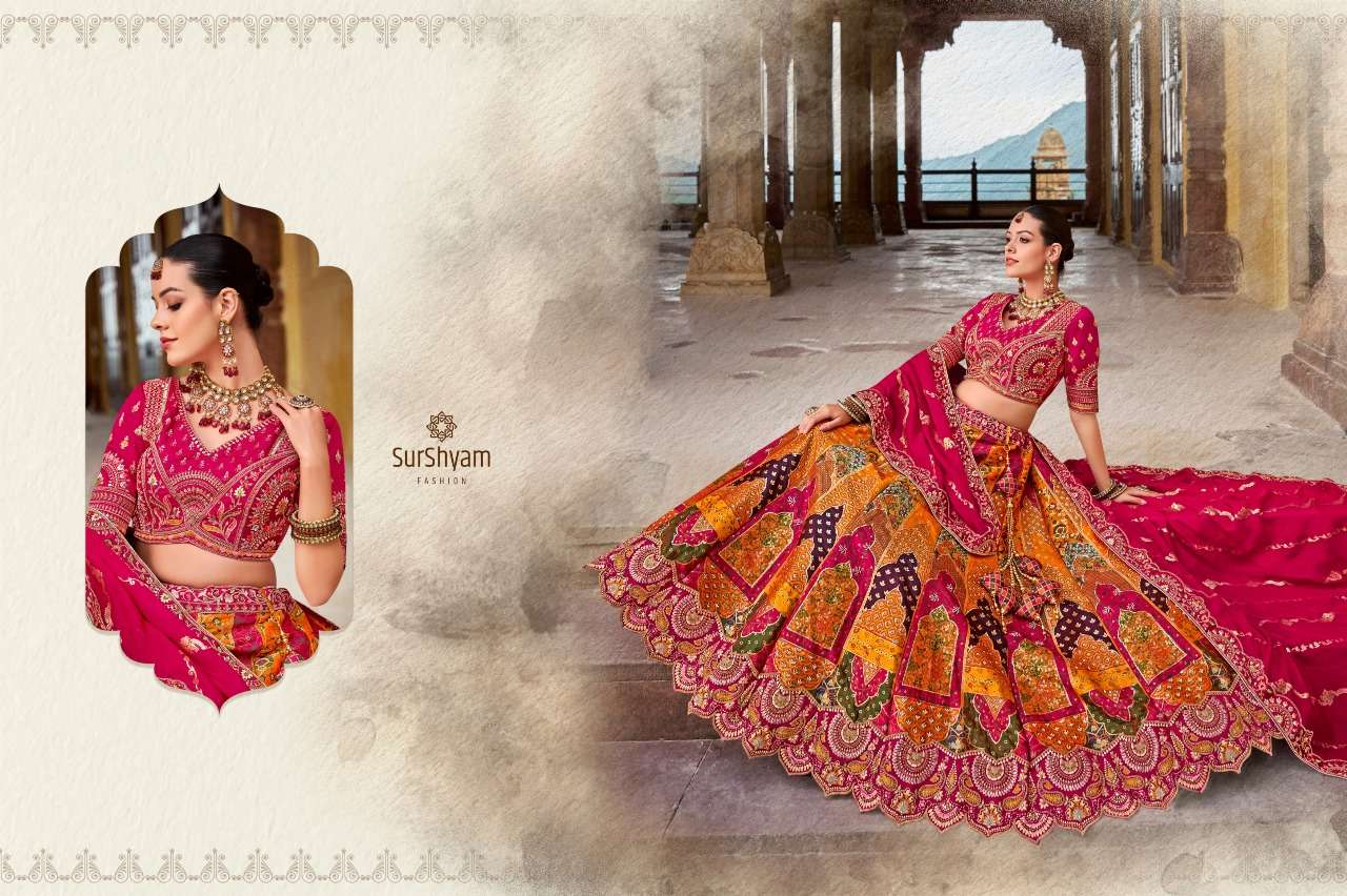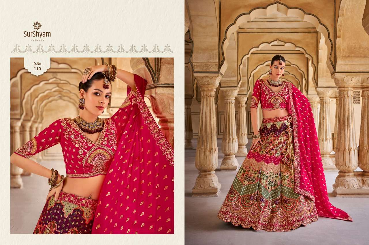 Brand-Surshyam fashion surat Catlogue name-kalamkari series-101 to 110 Banarasi silk Semi-Stitched Lehenga choli Rate 8995/- Gst tax 12% extra Lehenga-Banarasi silk with zarkan |