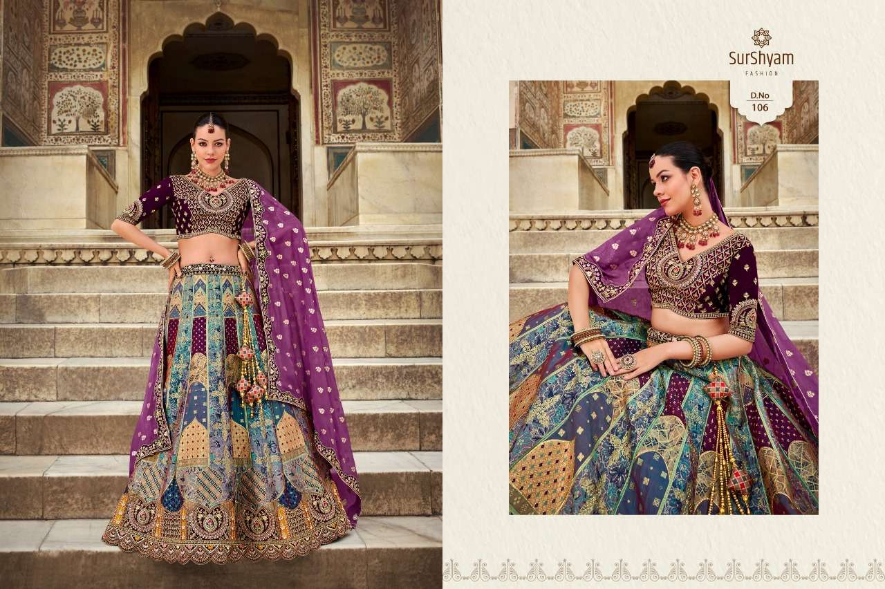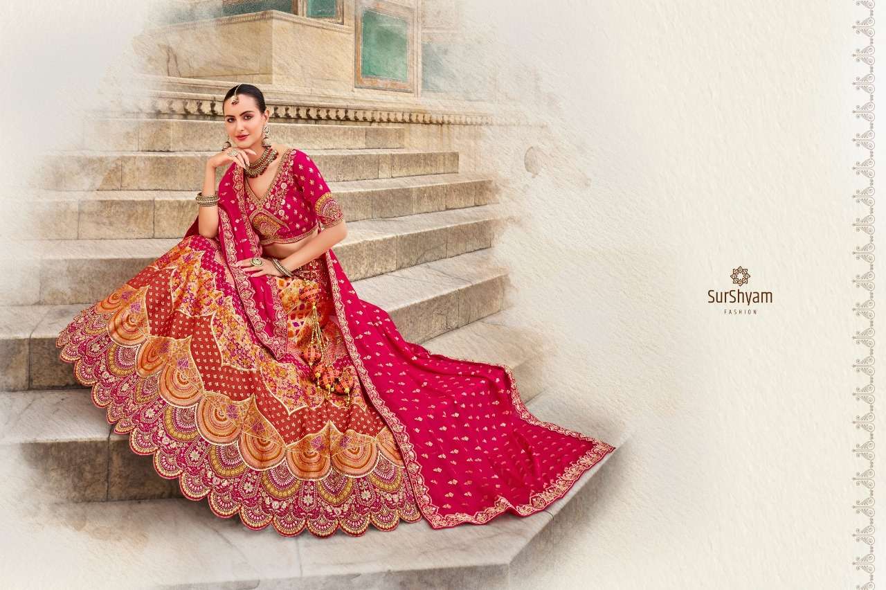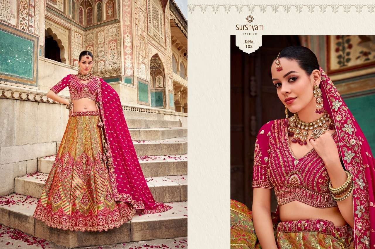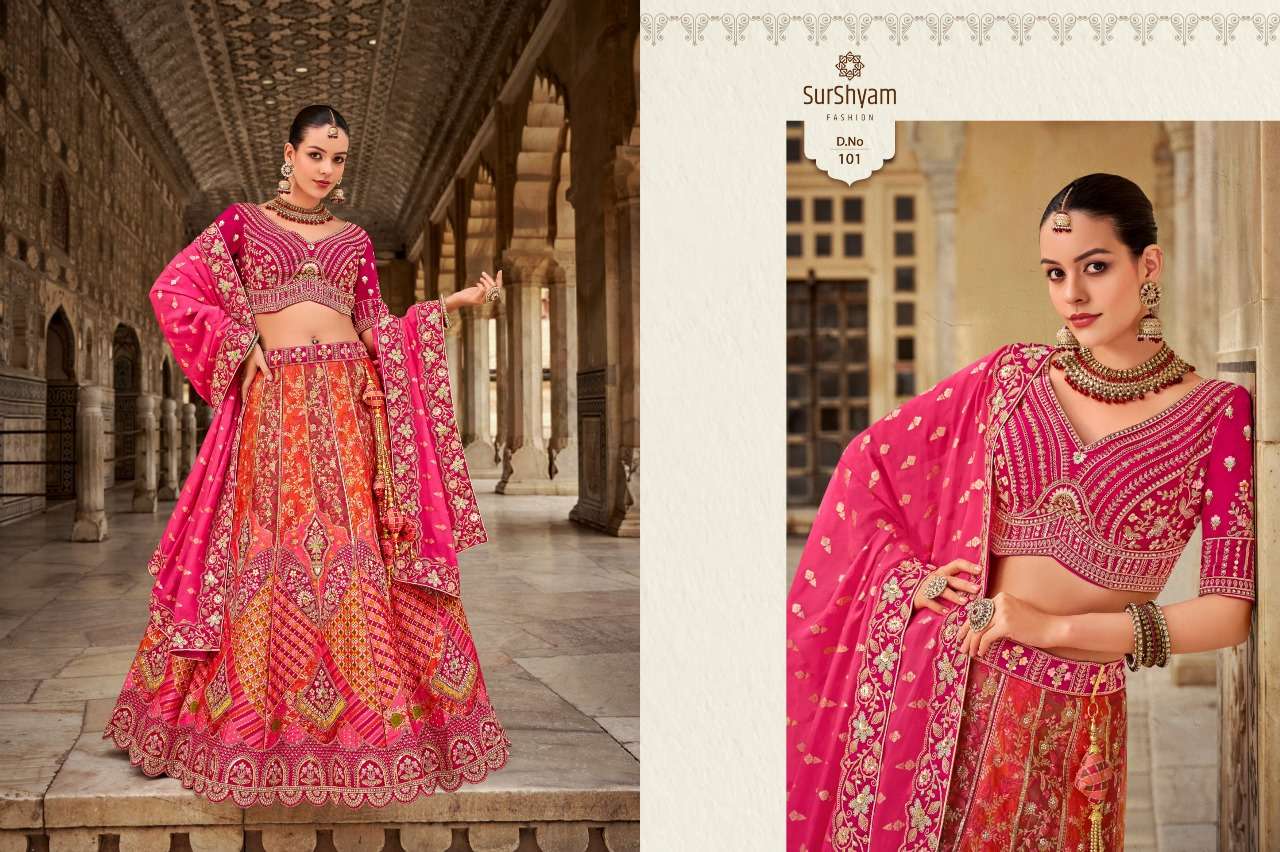Brand-Surshyam fashion surat Catlogue name-kalamkari series-101 to 110 Banarasi silk Semi-Stitched Lehenga choli Rate 8995/- Gst tax 12% extra Lehenga-Banarasi silk with zarkan |
