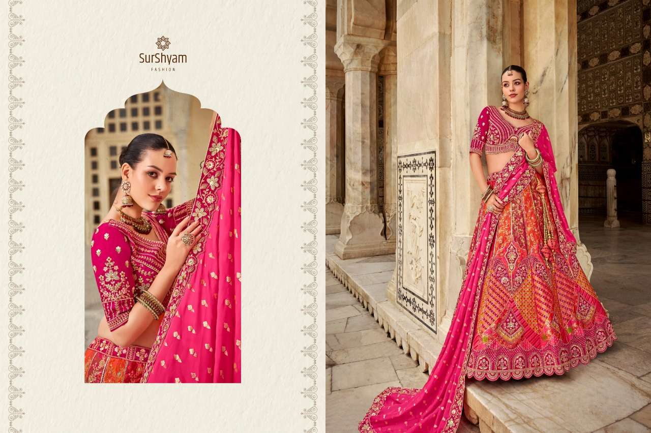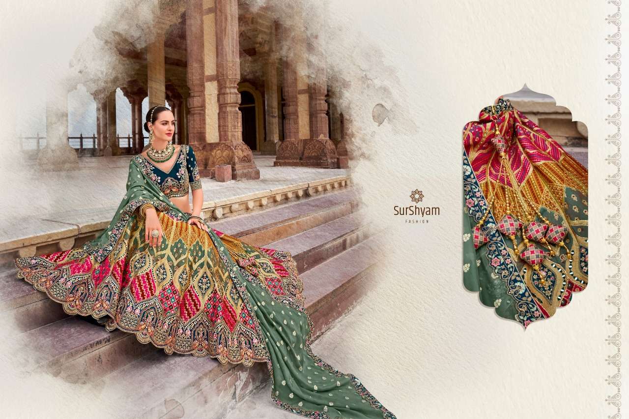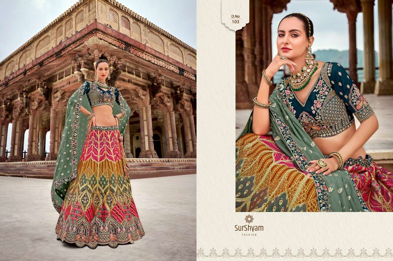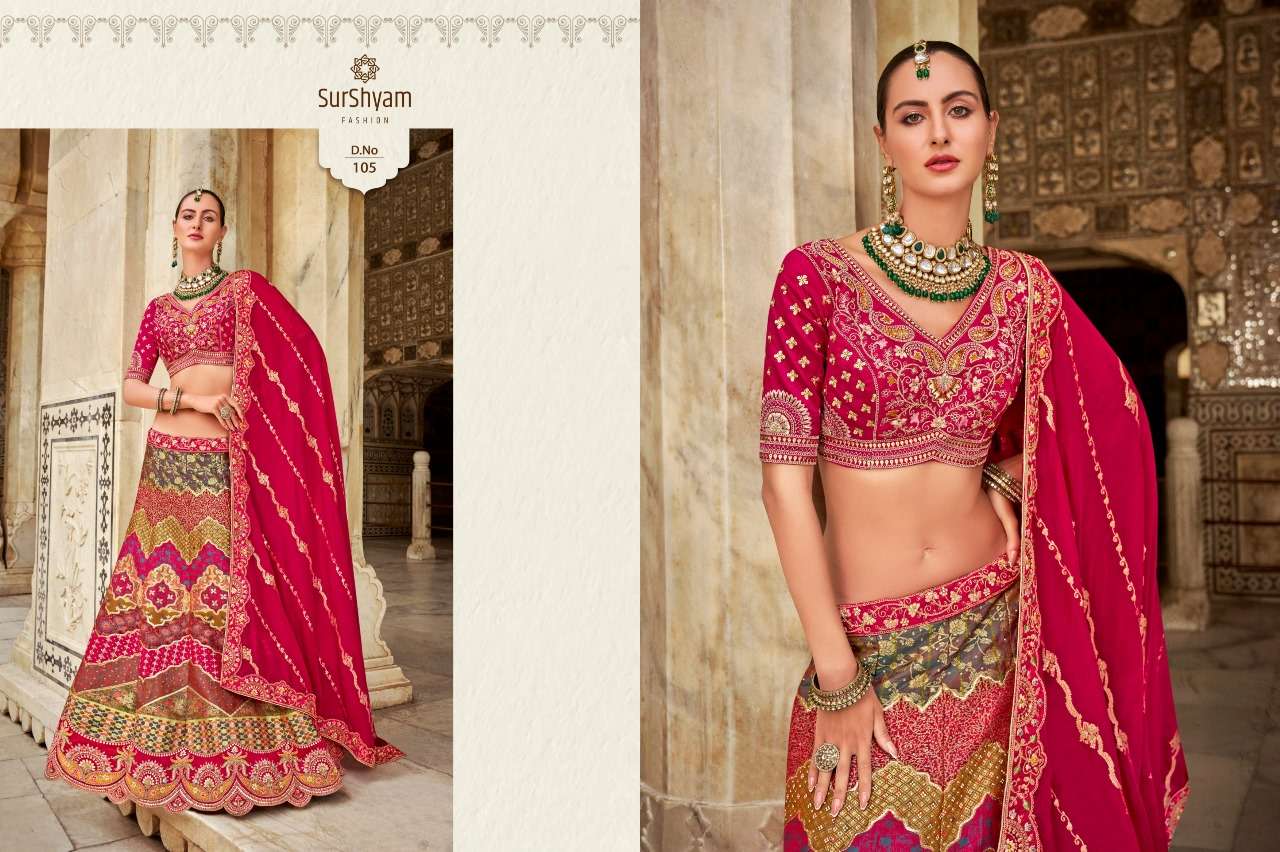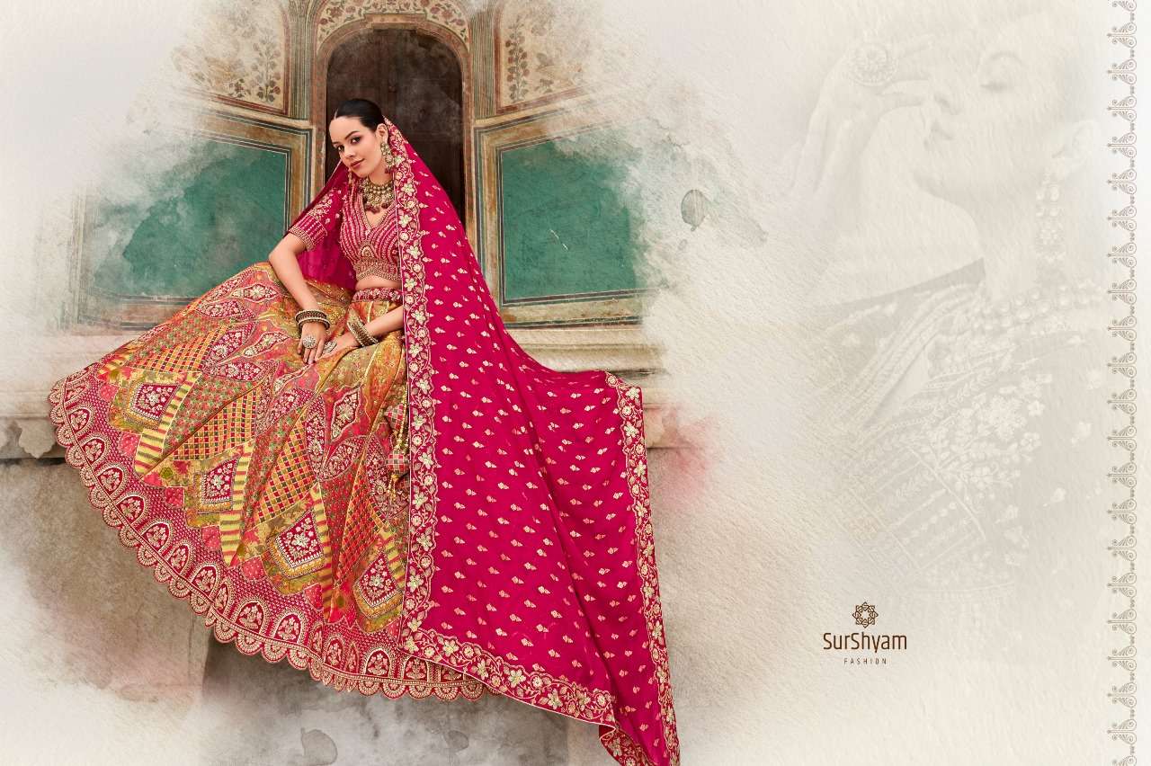 Brand-Surshyam fashion surat Catlogue name-kalamkari series-101 to 110 Banarasi silk Semi-Stitched Lehenga choli Rate 8995/- Gst tax 12% extra Lehenga-Banarasi silk with zarkan |