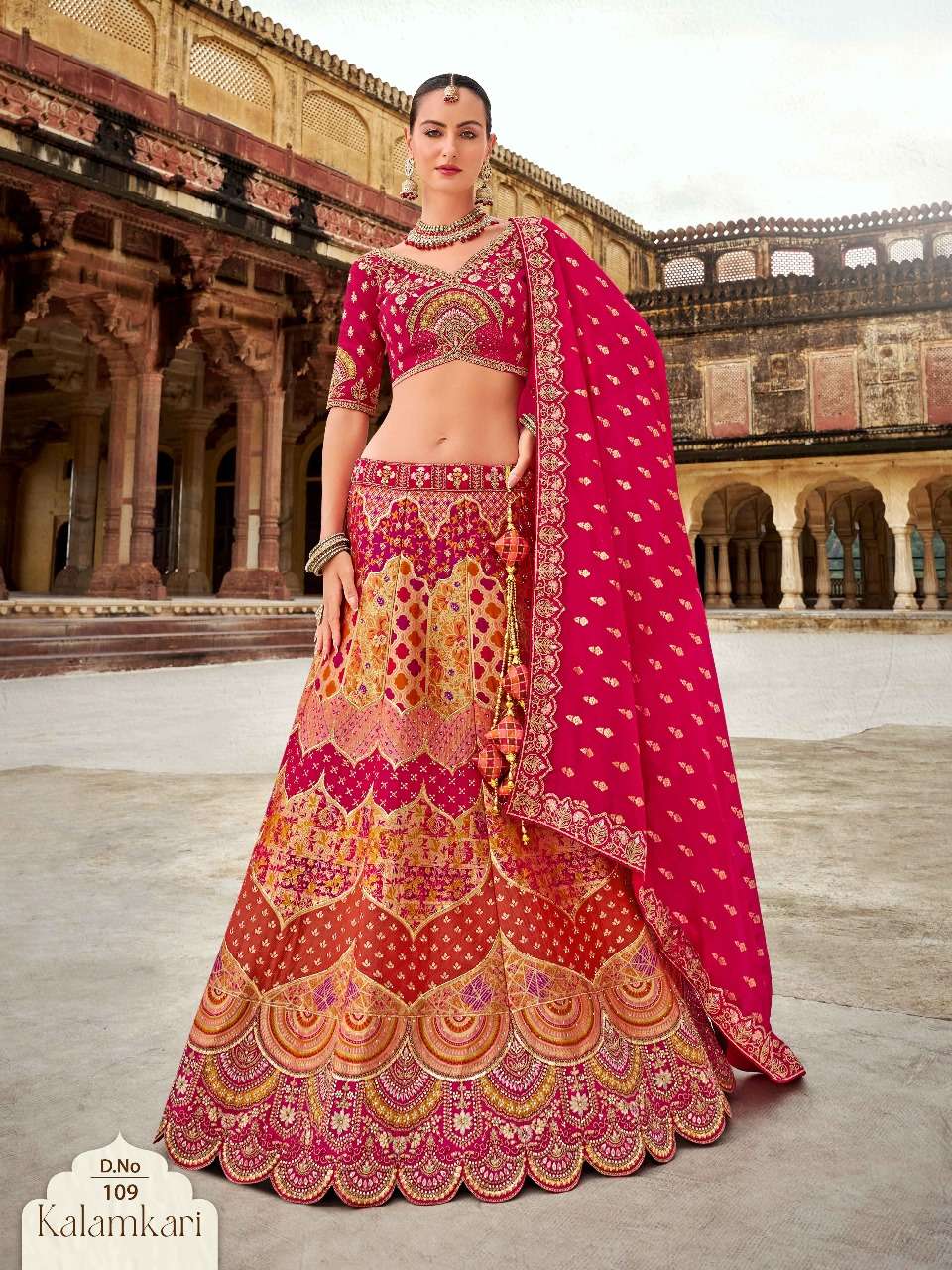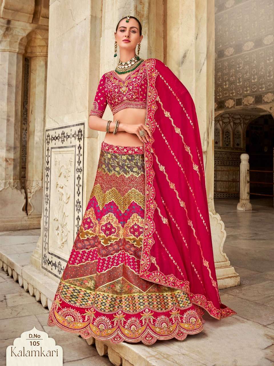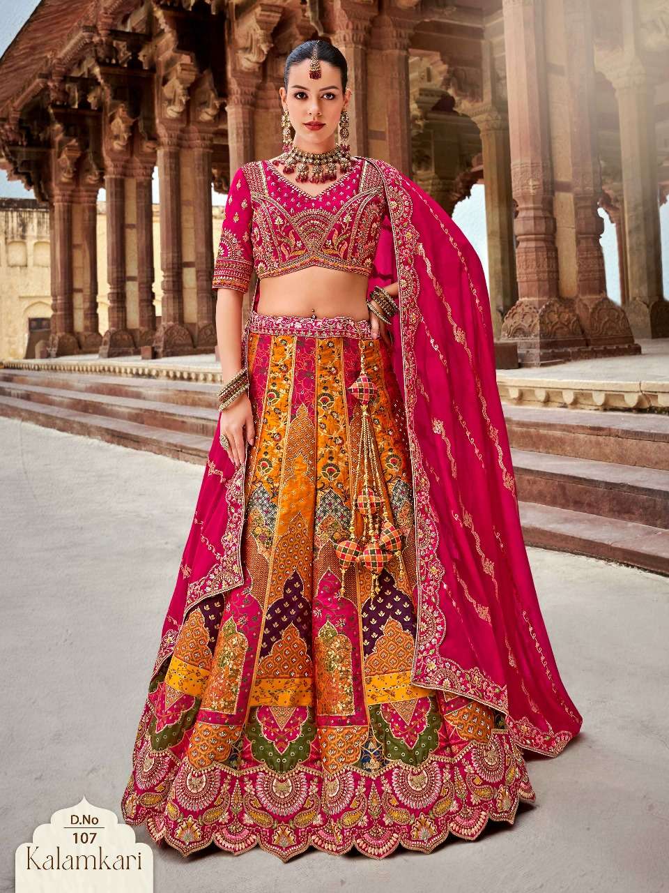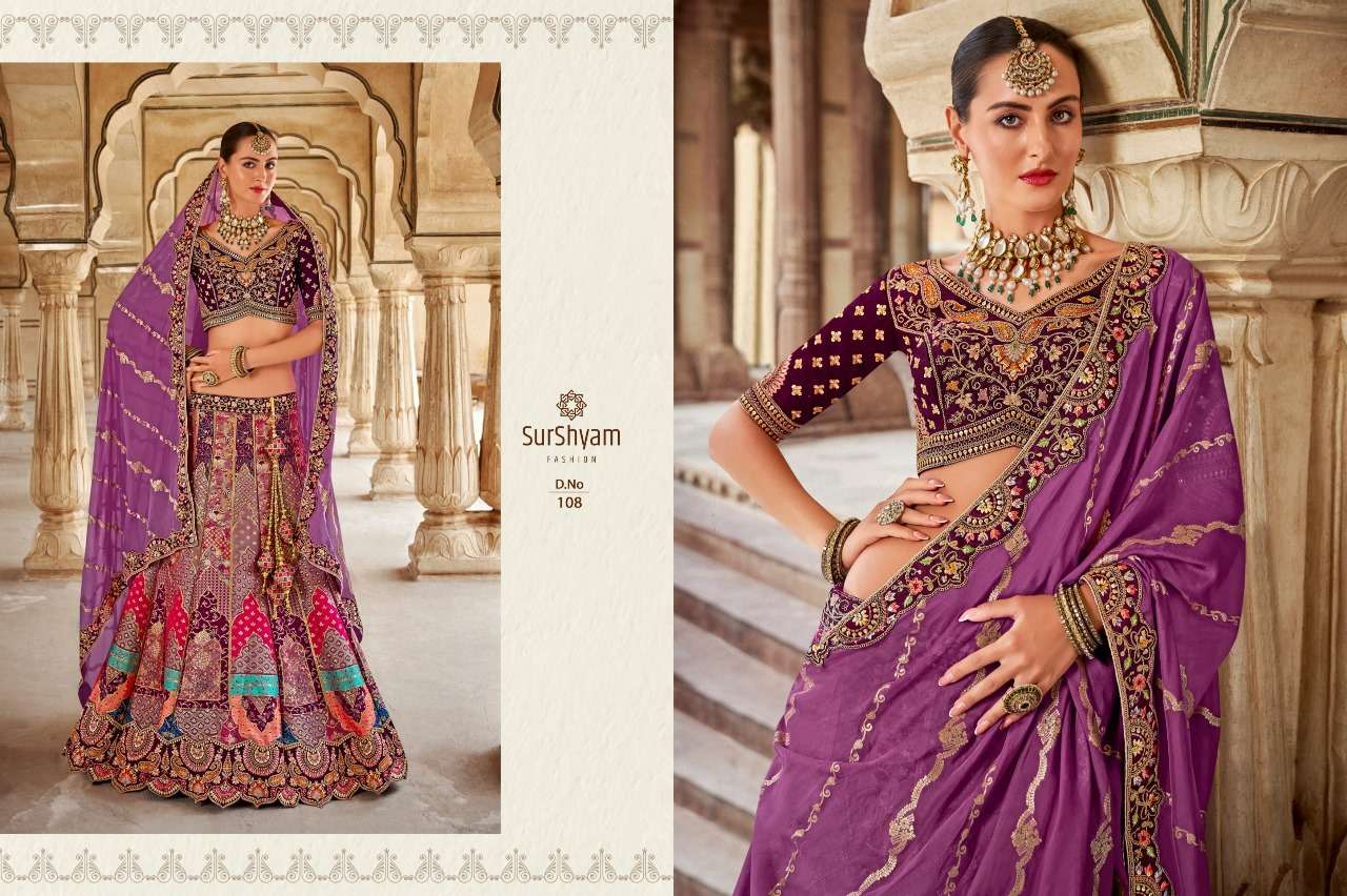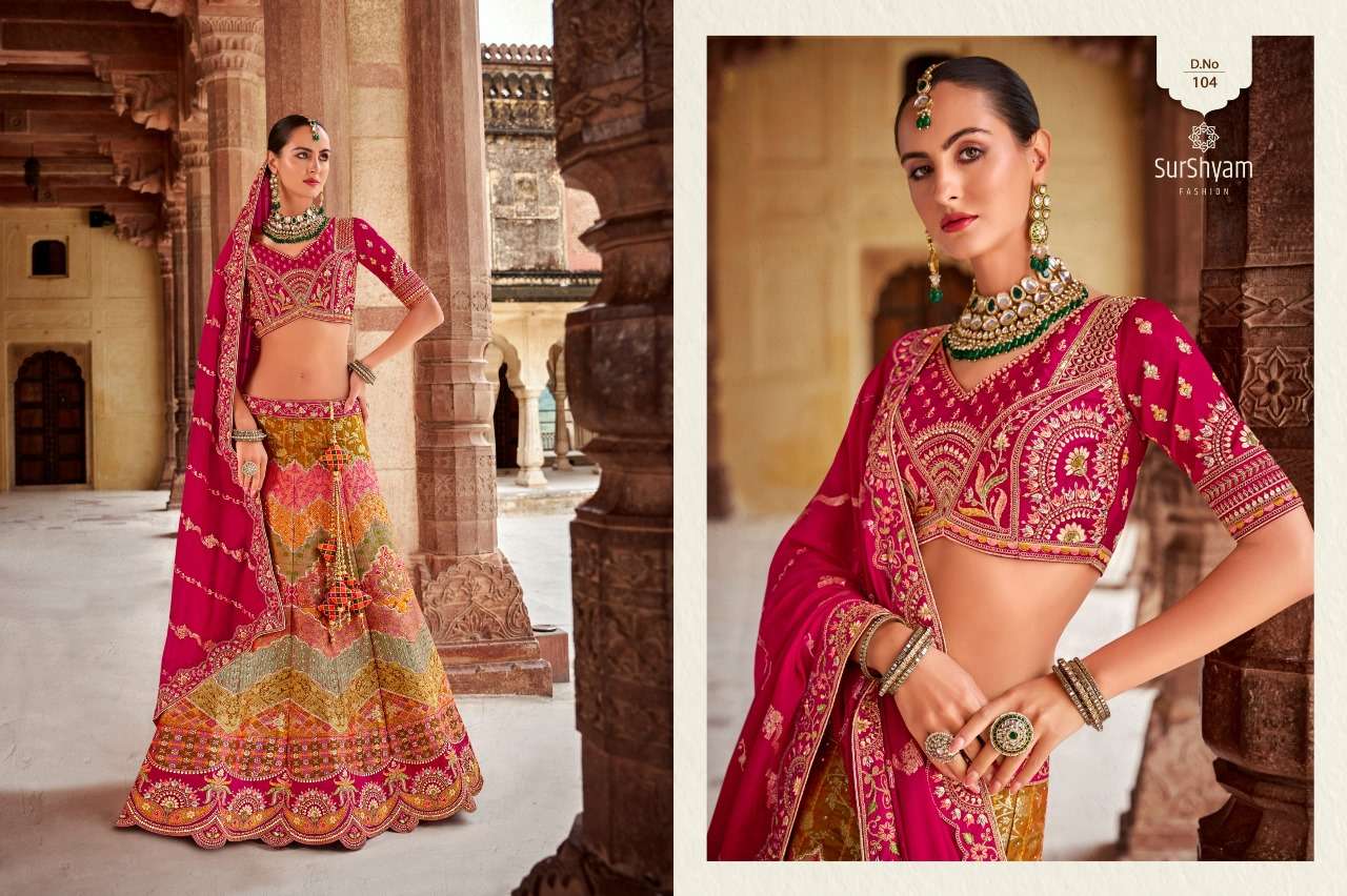 Brand-Surshyam fashion surat Catlogue name-kalamkari series-101 to 110 Banarasi silk Semi-Stitched Lehenga choli Rate 8995/- Gst tax 12% extra Lehenga-Banarasi silk with zarkan |