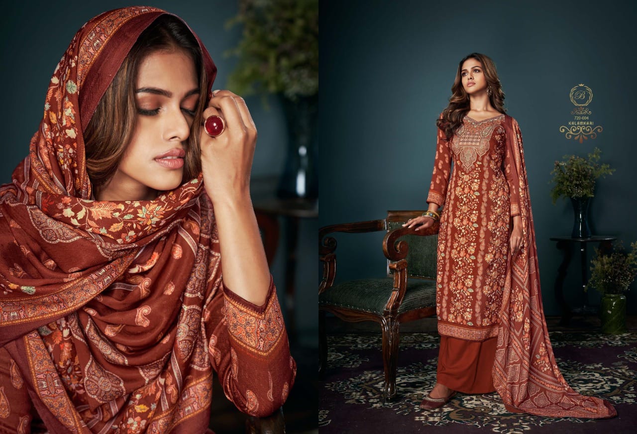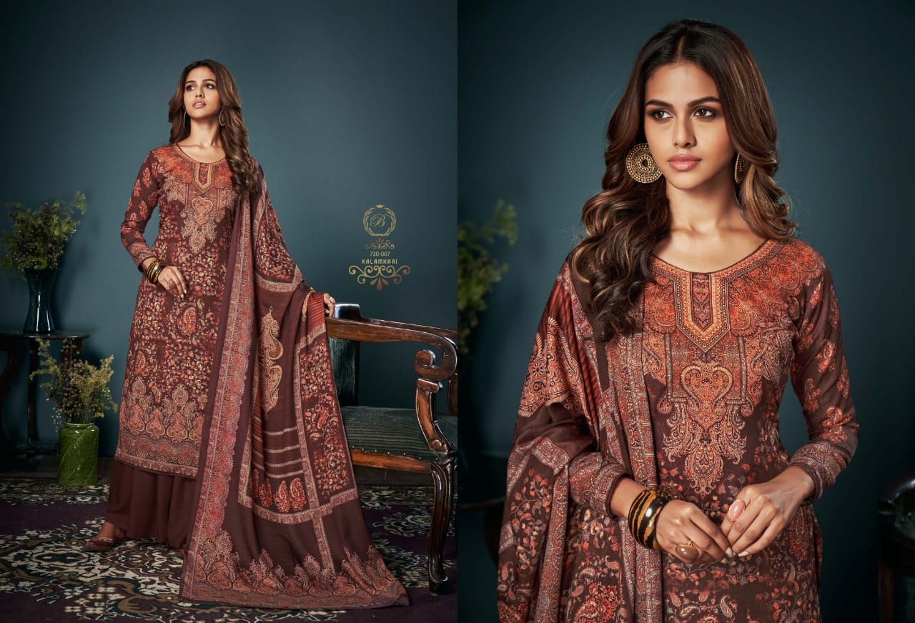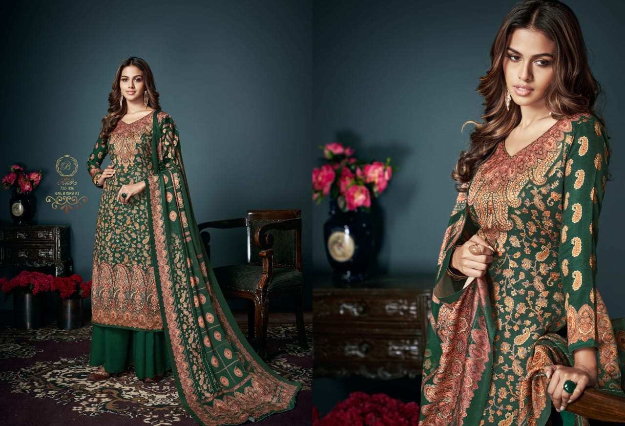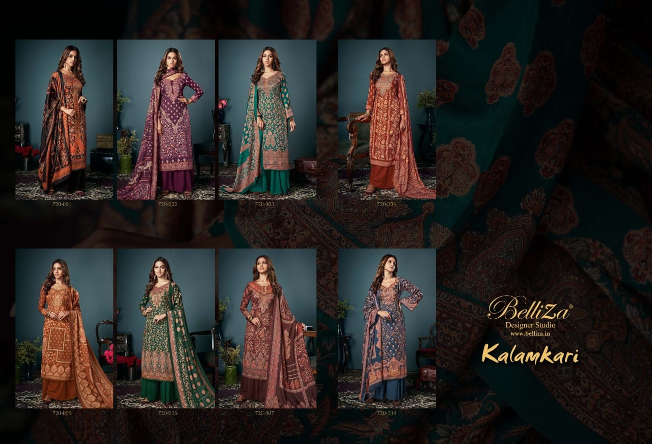 # BELLIZA # EXOTIC DESIGNS # UNBEATABLE COLORS _*......BelliZa DesigNer StuDio......*_ _presents_ *"KALAMKARI"* _...digital woollen collection..._ ?Top: 100% Pure Pashmina with Exclusive Digital Prints. (2.50 mtrs) ?Dupatta: 100% Pure Pashmina Shawl Digital Print with 4 side lace. (2.30 mtr) ?Bottom: Pure Pashmina Spun. (3 mtrs) ?Pcs: 08 ? Rate: 625/- # Book Now |
