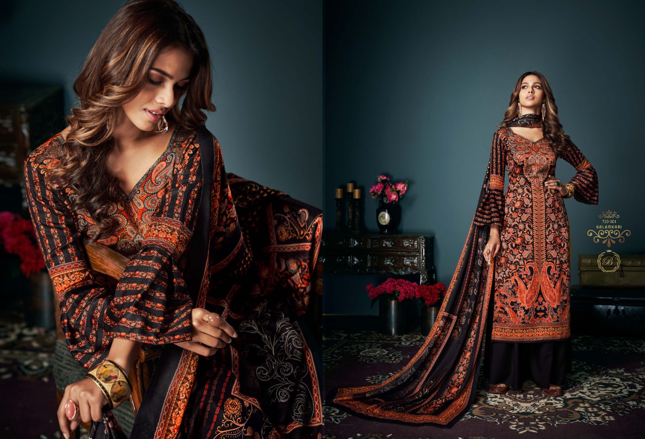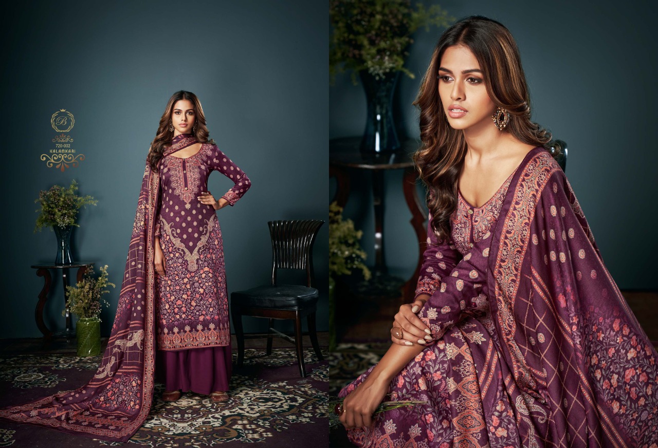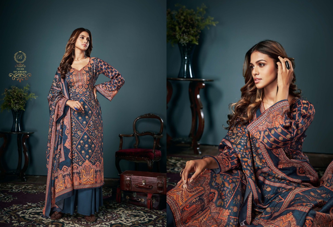 # BELLIZA # EXOTIC DESIGNS # UNBEATABLE COLORS _*......BelliZa DesigNer StuDio......*_ _presents_ *"KALAMKARI"* _...digital woollen collection..._ ?Top: 100% Pure Pashmina with Exclusive Digital Prints. (2.50 mtrs) ?Dupatta: 100% Pure Pashmina Shawl Digital Print with 4 side lace. (2.30 mtr) ?Bottom: Pure Pashmina Spun. (3 mtrs) ?Pcs: 08 ? Rate: 625/- # Book Now |
