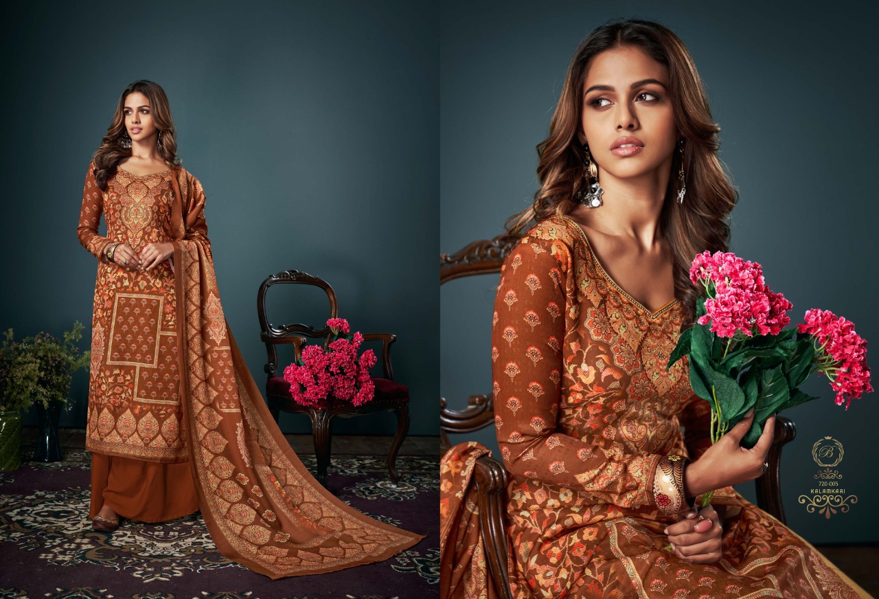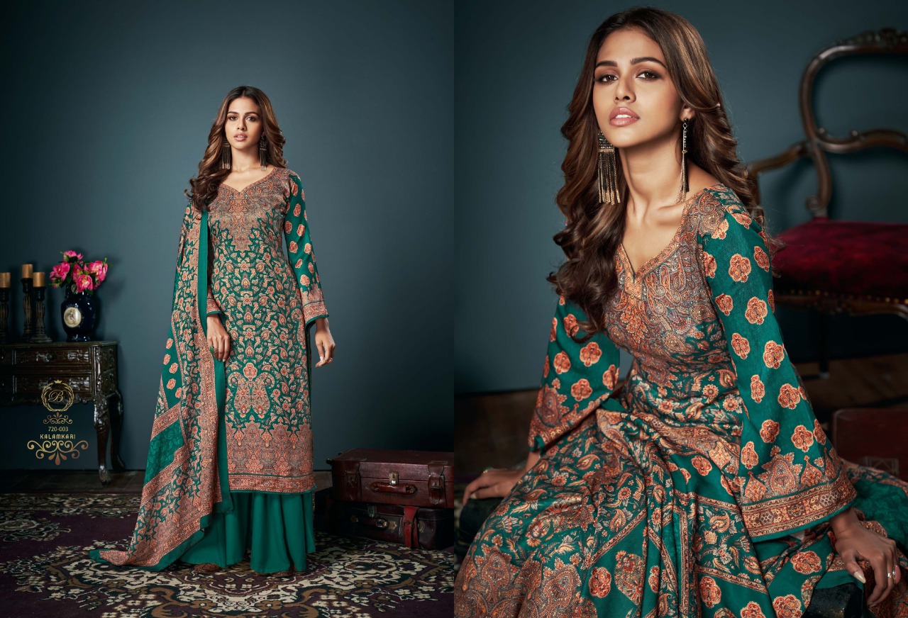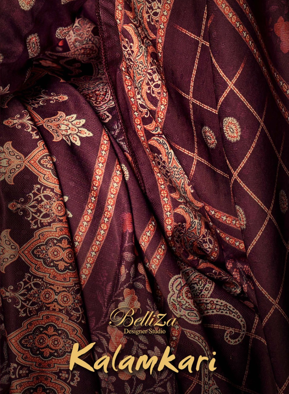 # BELLIZA # EXOTIC DESIGNS # UNBEATABLE COLORS _*......BelliZa DesigNer StuDio......*_ _presents_ *"KALAMKARI"* _...digital woollen collection..._ ?Top: 100% Pure Pashmina with Exclusive Digital Prints. (2.50 mtrs) ?Dupatta: 100% Pure Pashmina Shawl Digital Print with 4 side lace. (2.30 mtr) ?Bottom: Pure Pashmina Spun. (3 mtrs) ?Pcs: 08 ? Rate: 625/- # Book Now |