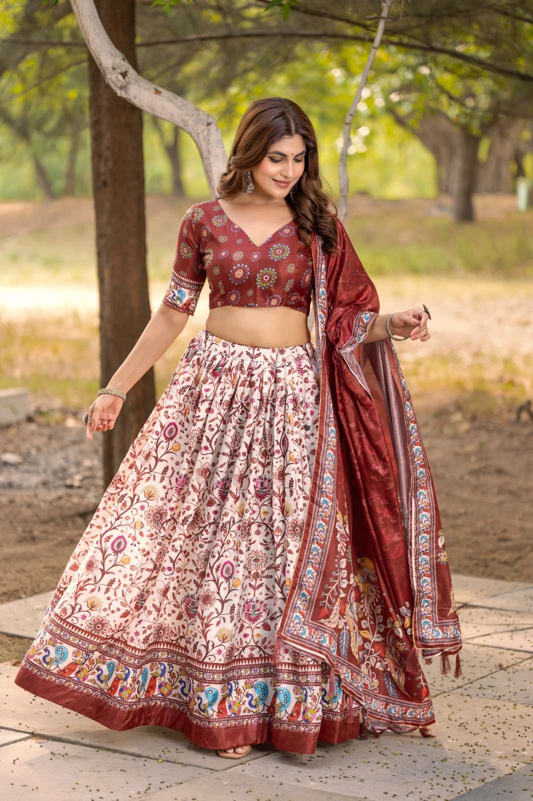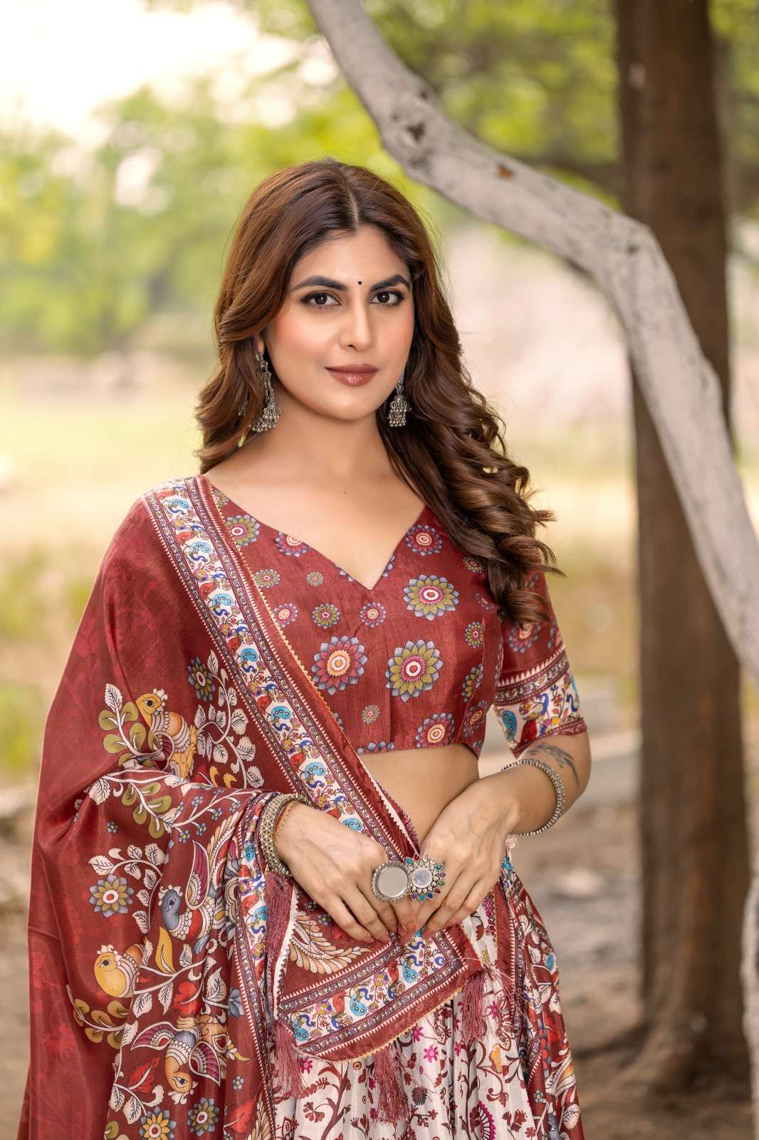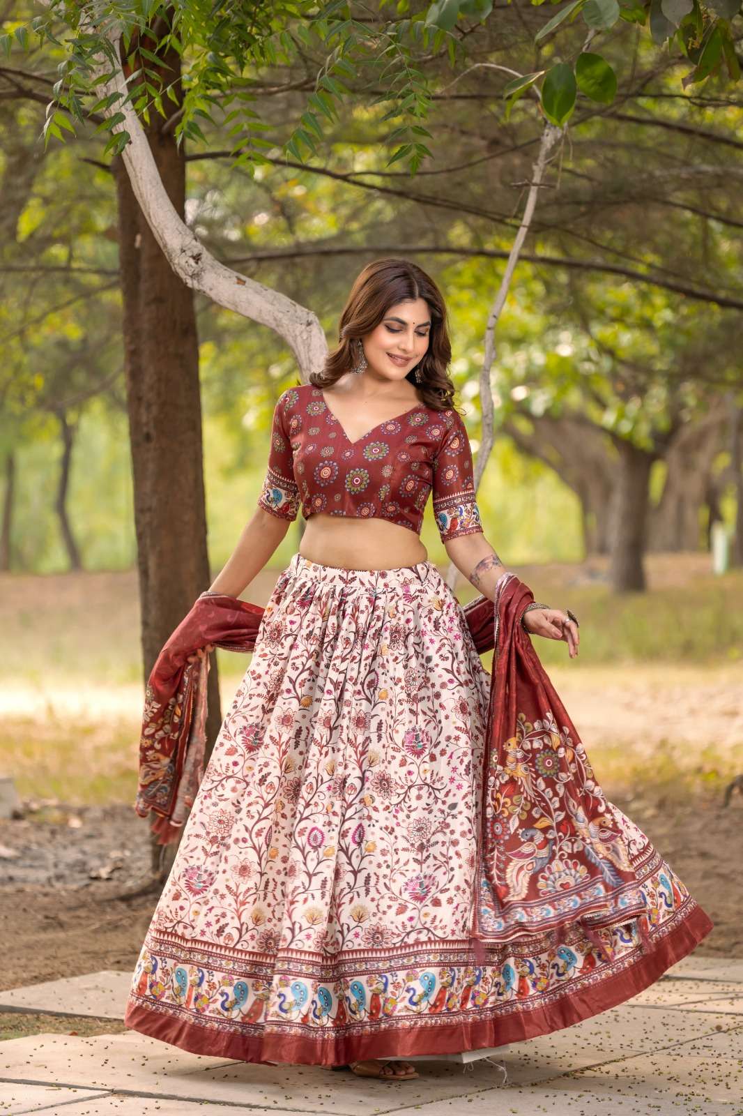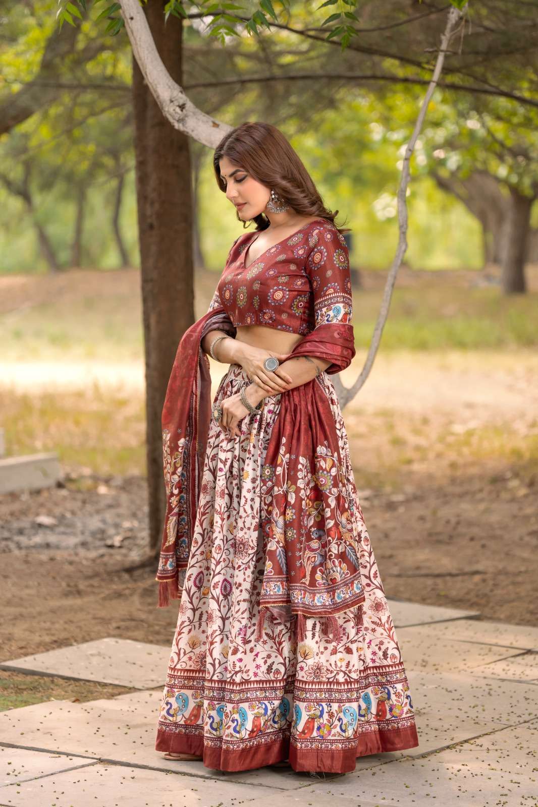👗*New Exclusive Kalamkari Flower Semi Stitched Printed Silk Lehenga Choli Collection*👗