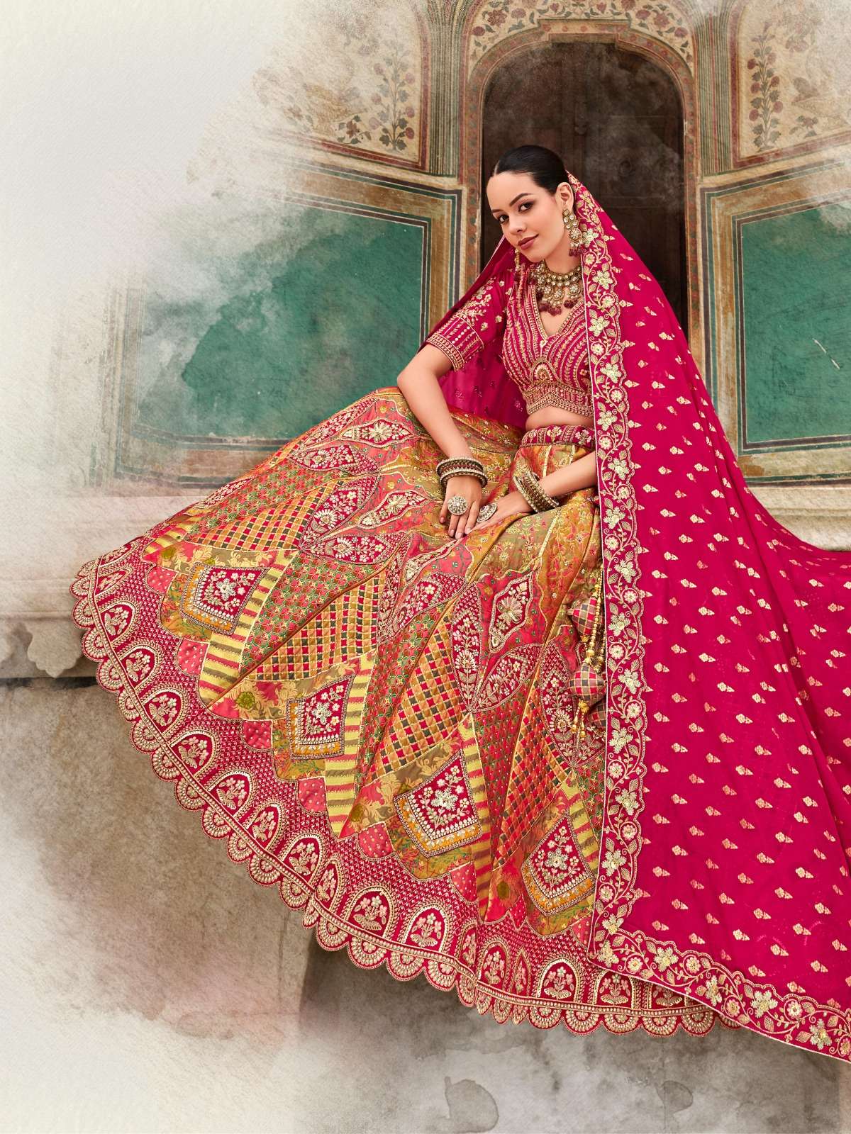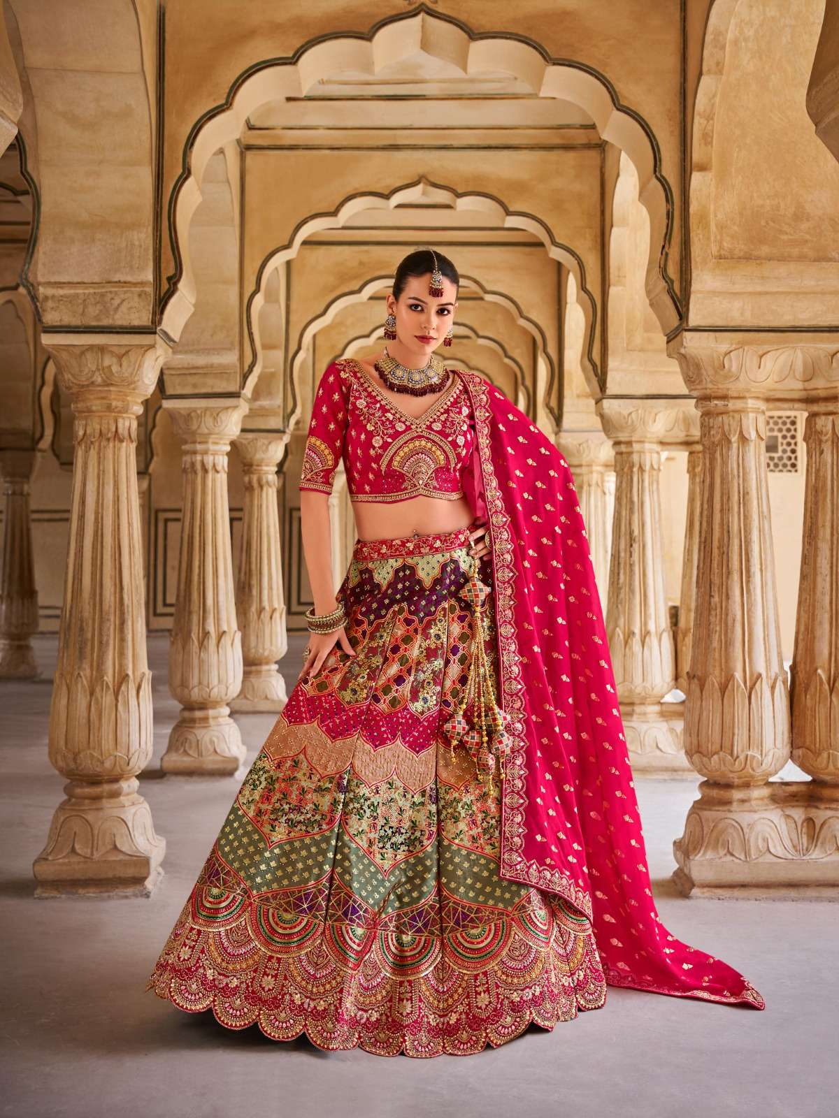 *BRAND NAME – *SURSHYAM FASHION* CATALOG NAME – KALAMKARI series-101 TO 110 Banarasi silk Semi-Stitched Lehenga choli Lehenga-Banarasi silk with zarkan Blouse-Silk with zarkan sequence codding work Dupatta-pure viscose * Lehenga:- Made of premium quality banarasi weaving silk Semi-Stitched lehenga with zarkan , Sequins and Coding thread Work Embroidery. * Lehenga Stitching Note:- 2 layers of Can Can with size waist upto 42 * Dupatta:- pure viscose fabric Ethnic motif with ZARKAN sequence Embroidery lace Border. * Blouse:- silkWith Heavy sequinse zarka and Embroidery work. * Lehenga Flair : 4 meter with Inner attached with latkans * 1 Lehenga, 1 Blouse, 1 Dupatta * Lehenga: Customizable upto 42 inches at the waist, * Lehenga Flair: 4 Meter * Lehenga length: 42 inches at the length * Choli: Customizable upto 44 inches at the Bust * Dupatta length: 2.50 meter * Dupatta width: 1 meter RATE 8795/- PER PCS GST 12% EXTRA