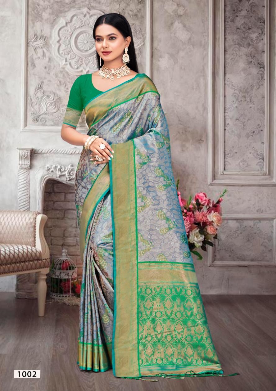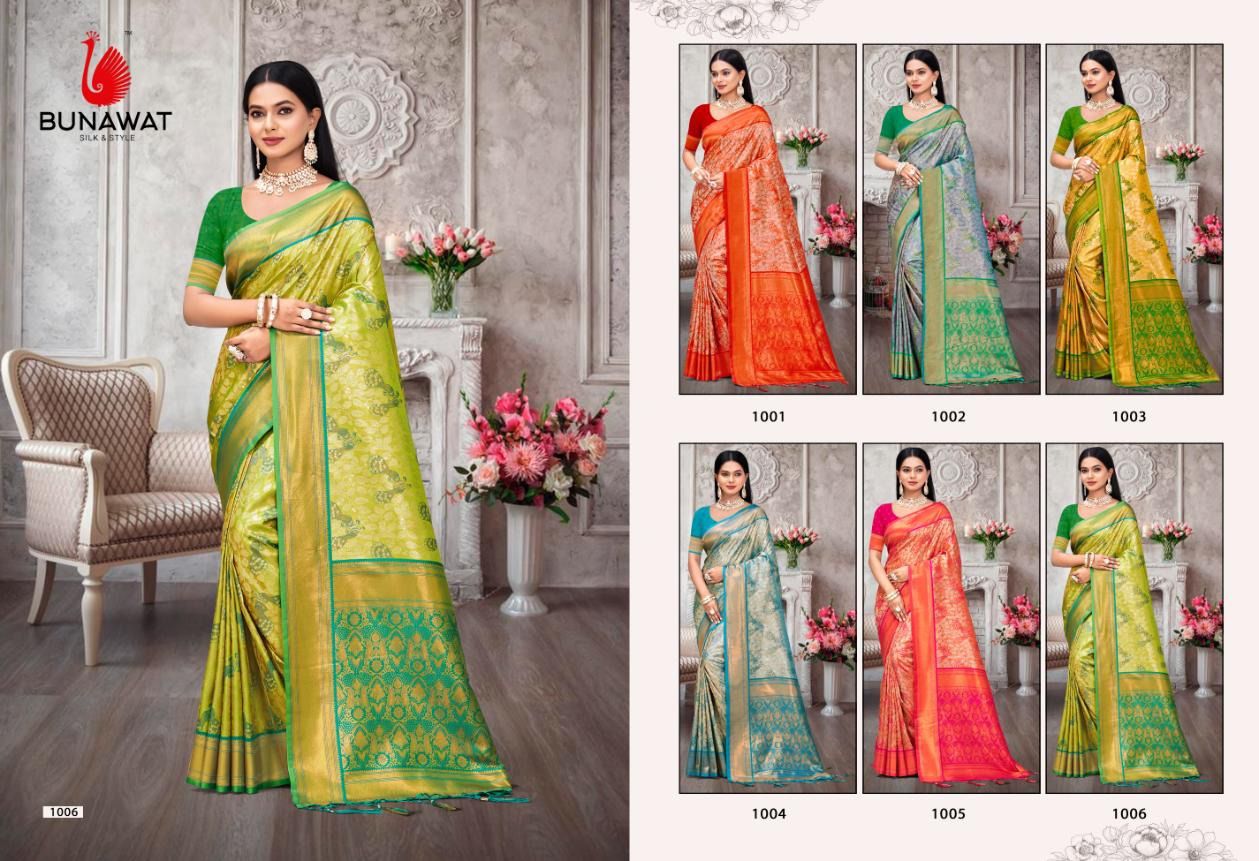 ? *New Catalog Exclusively Launching From Our Newly Launched Brand:- BUNAWAT* ? Catalog Name: *Kalanidhi Vol-02* Brand: *BUNAWAT* Product Type: Saree Fabric: Kanjivaram Silk Price Per Piece: 1121/- Gst Extra: 5% Other Specifications: Kanjivaram Silk Saree Saree Mtr: 5.5 Mtr Blouse: 0.8 Mtr Total Pcs: 6 single available _*Book your orders now*_ 100+single |