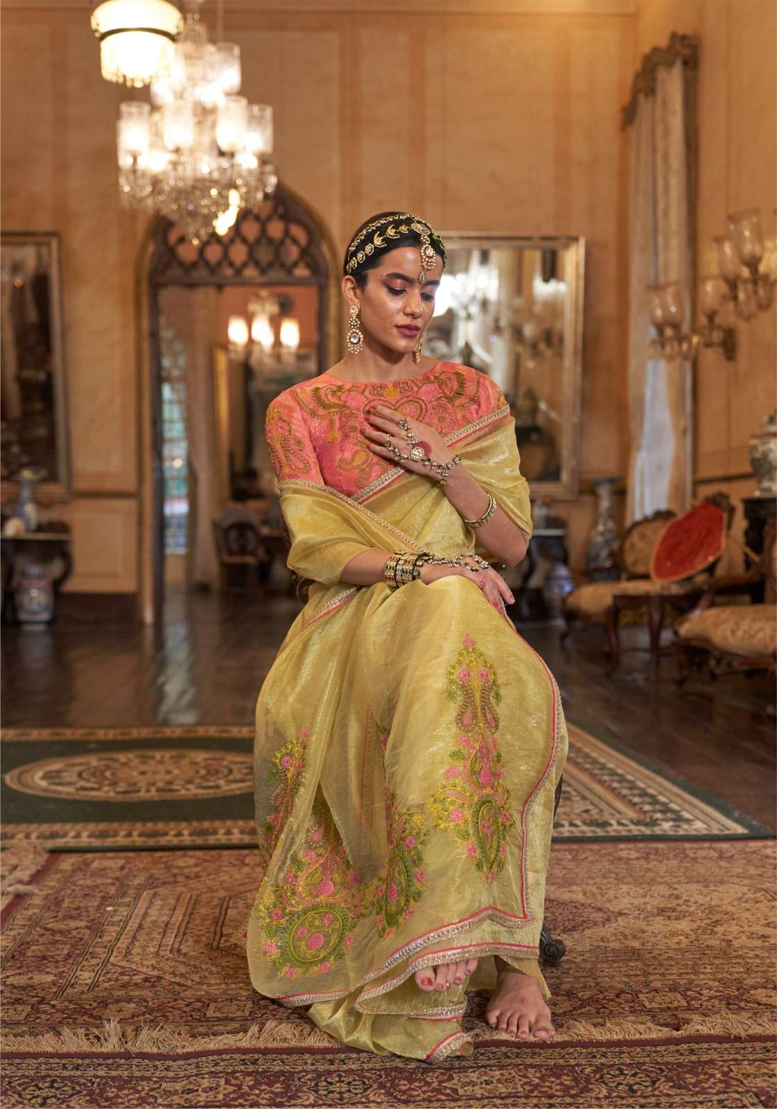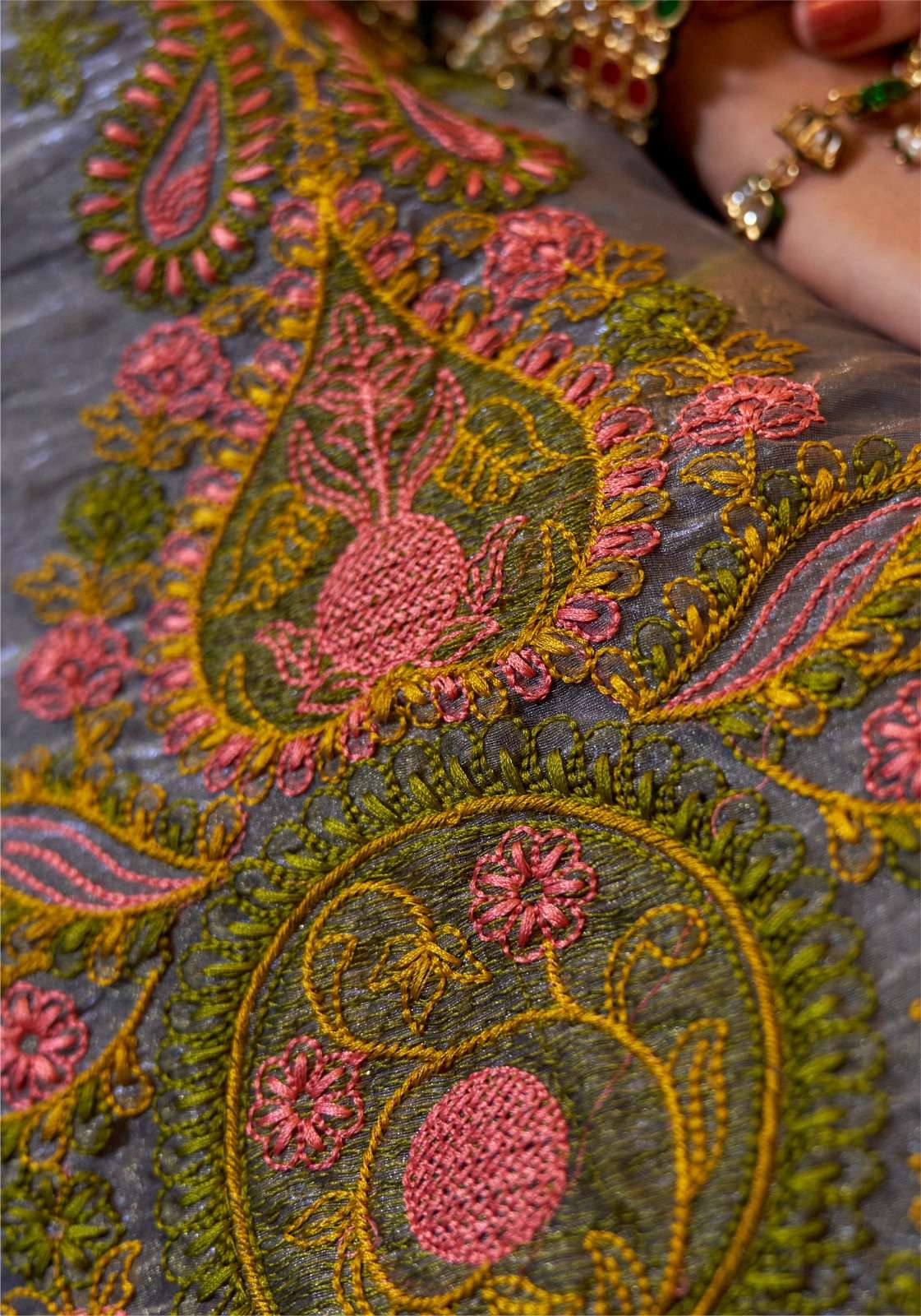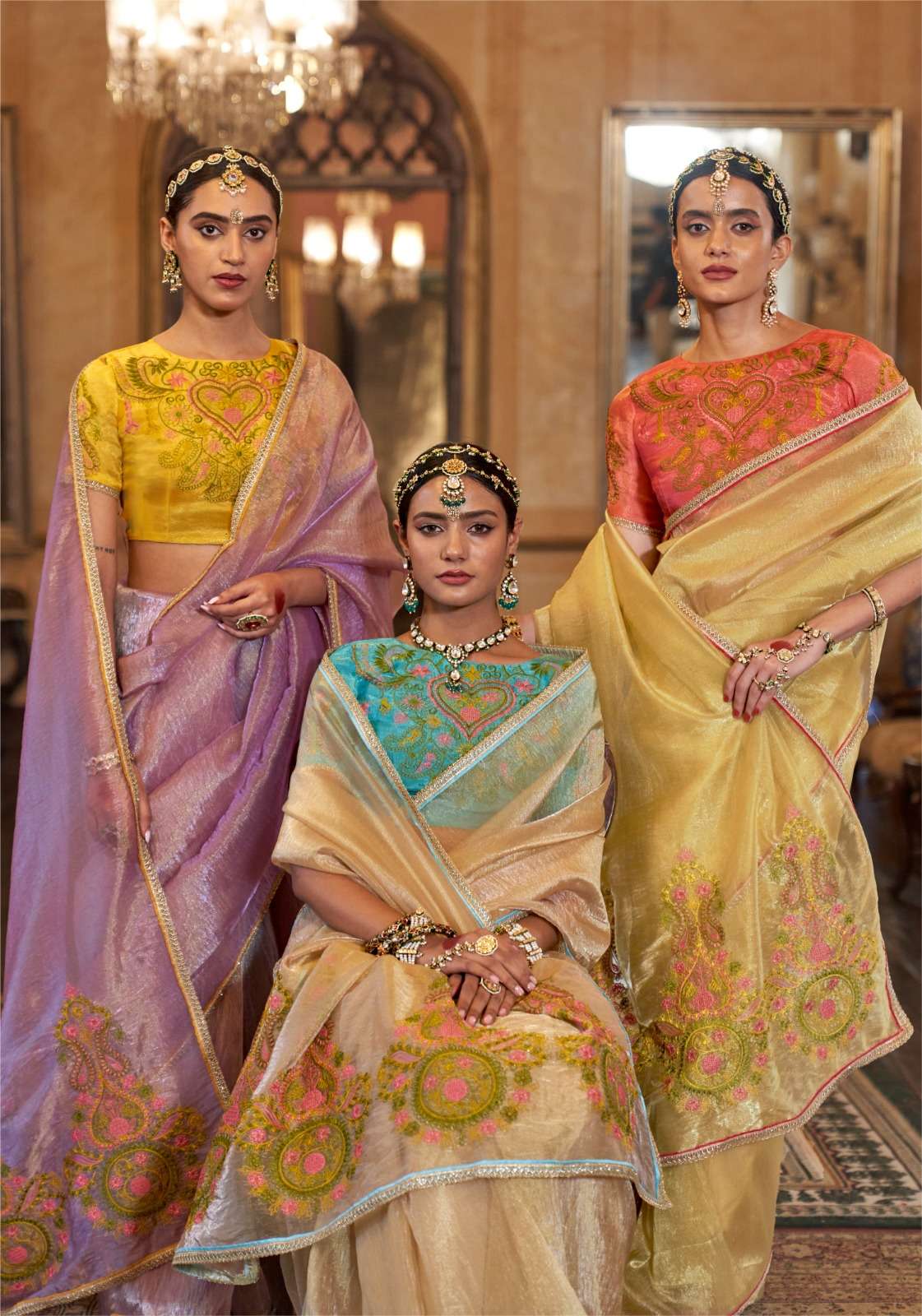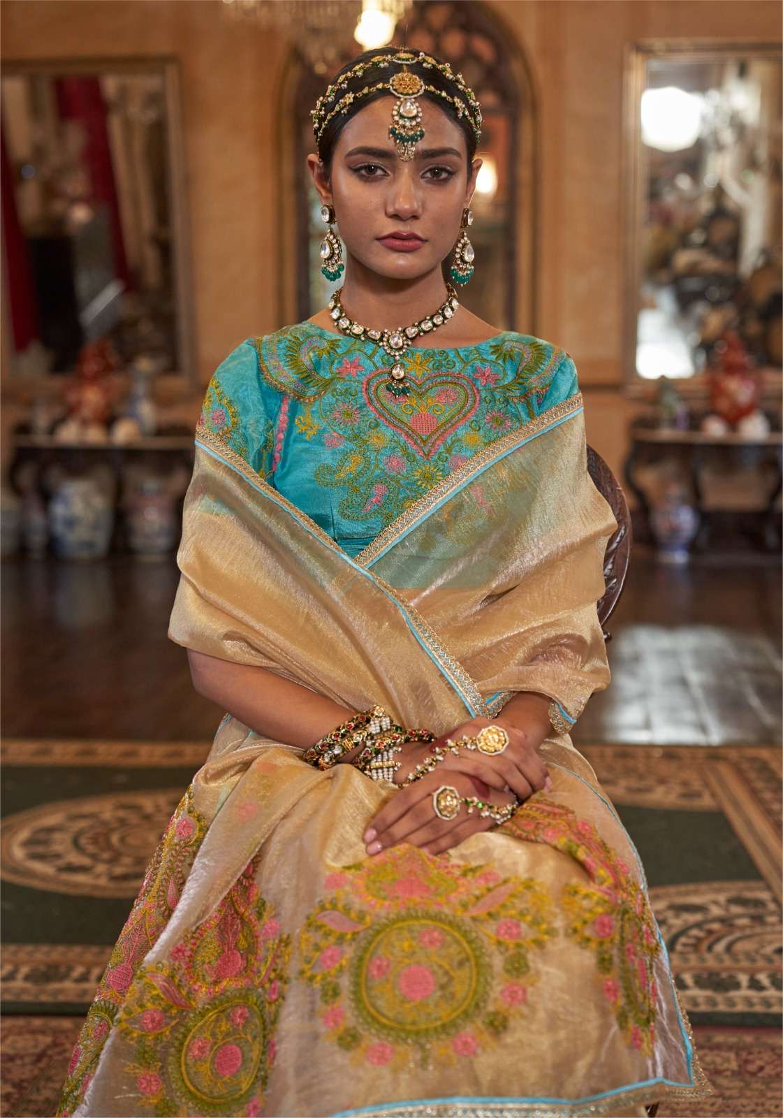 Saree - Gold tissue fabric with multi thread embroidery work and lace border details.
