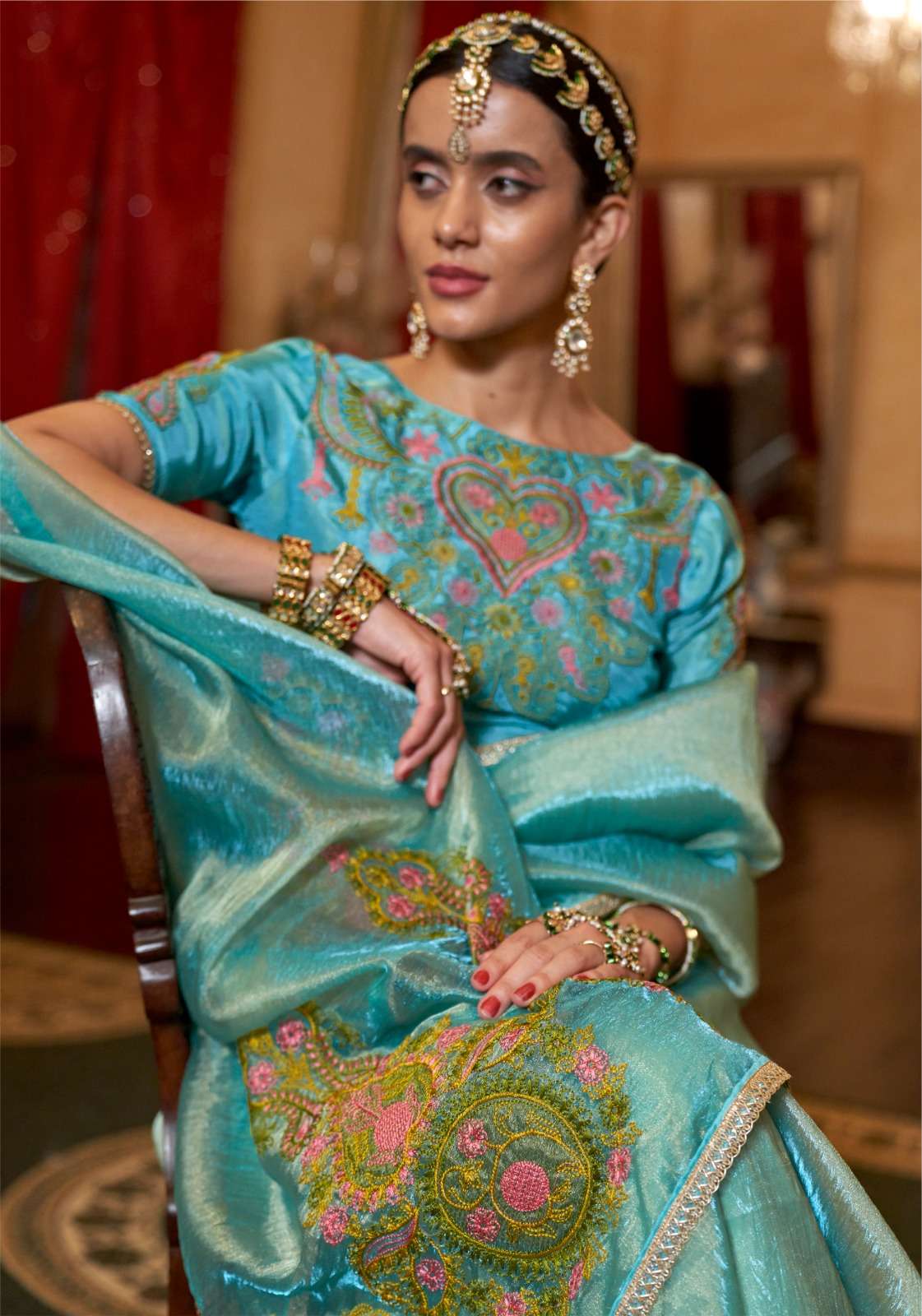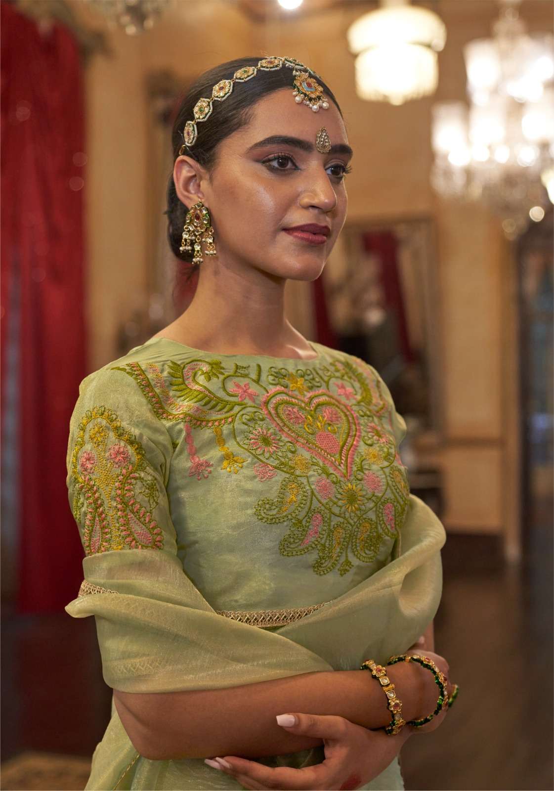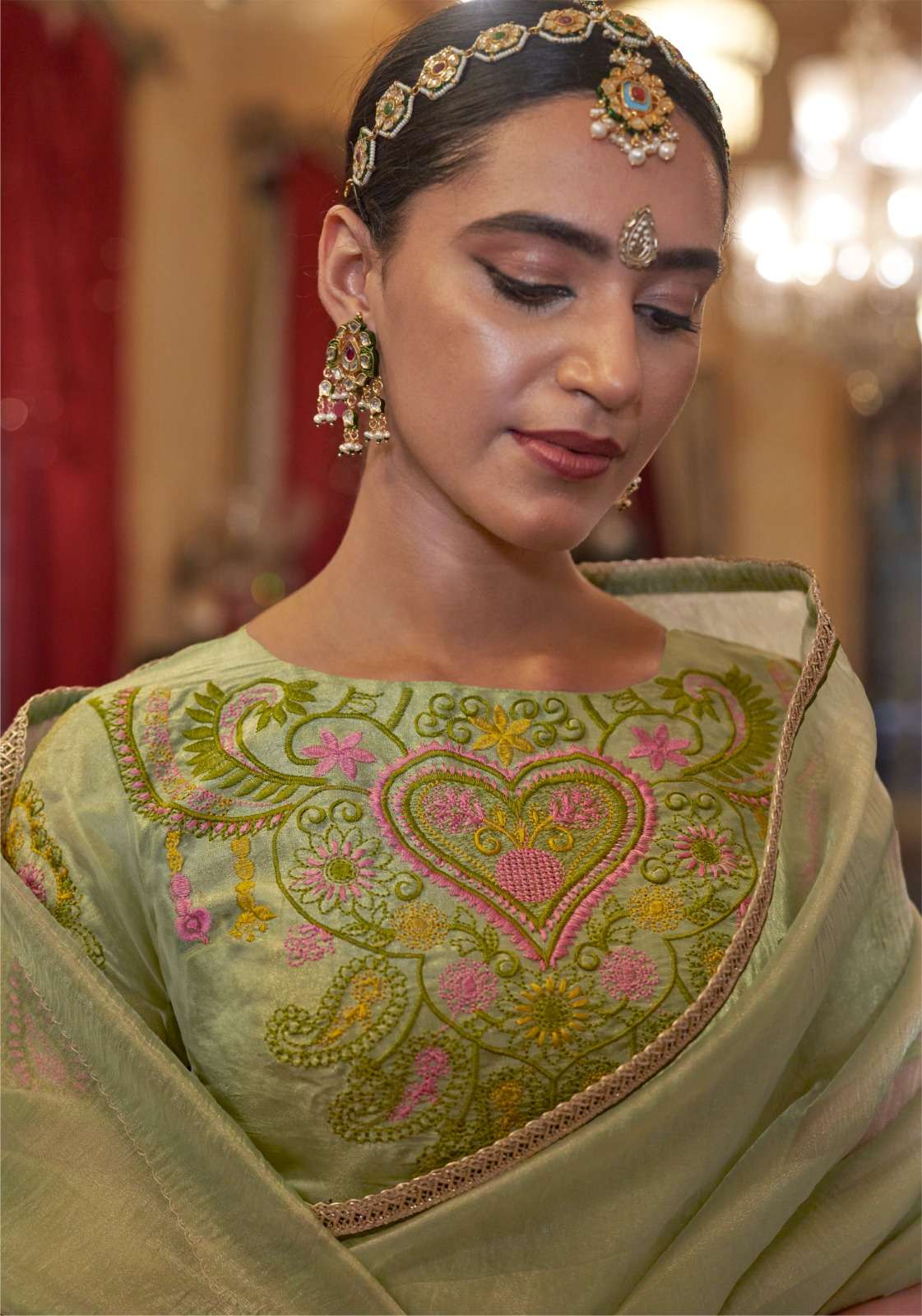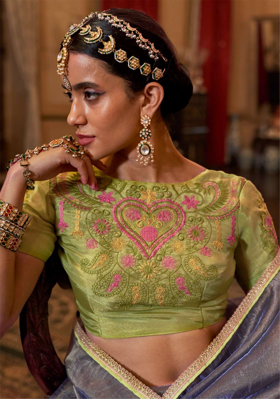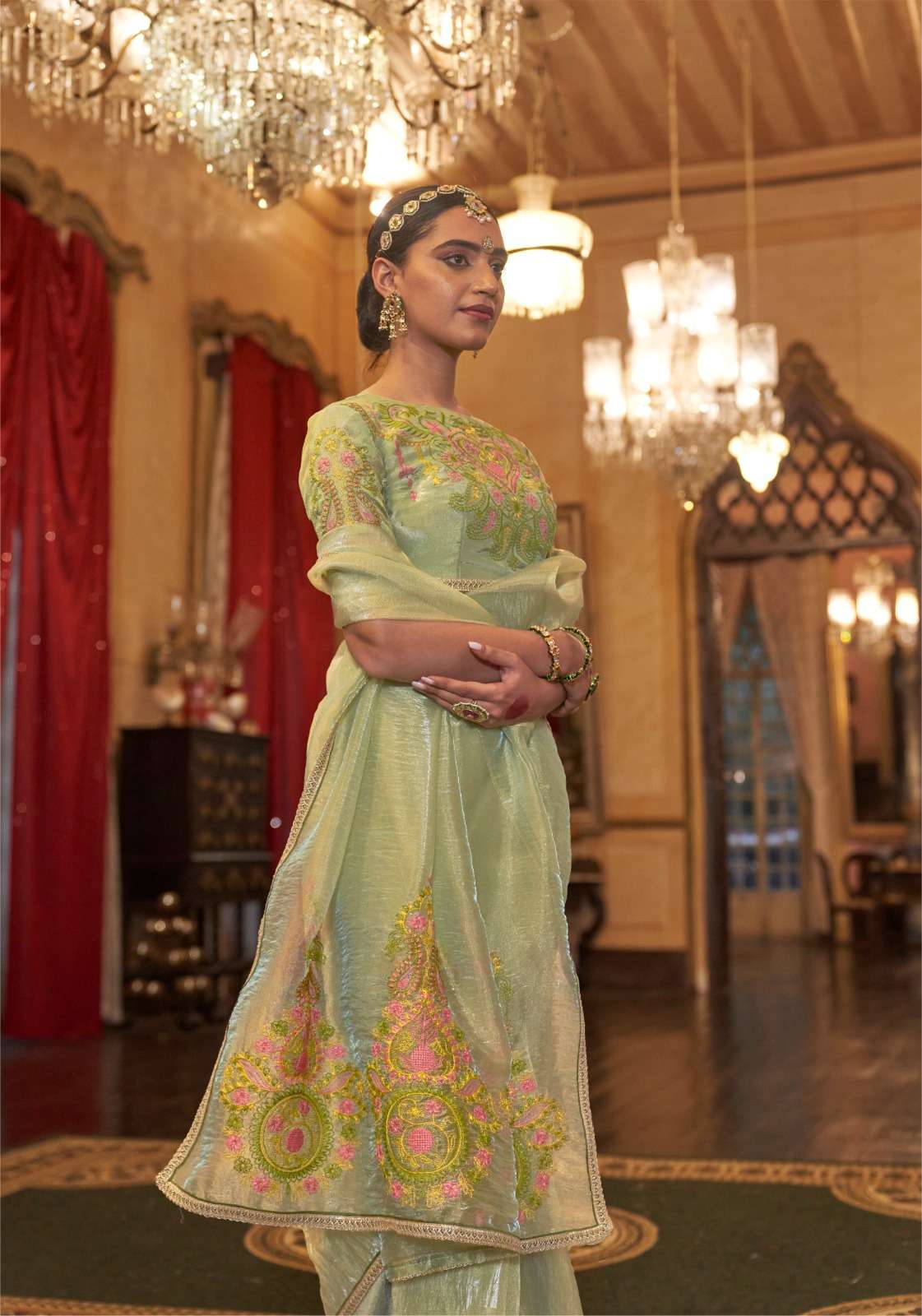 Saree - Gold tissue fabric with multi thread embroidery work and lace border details.