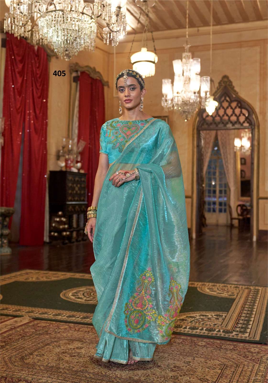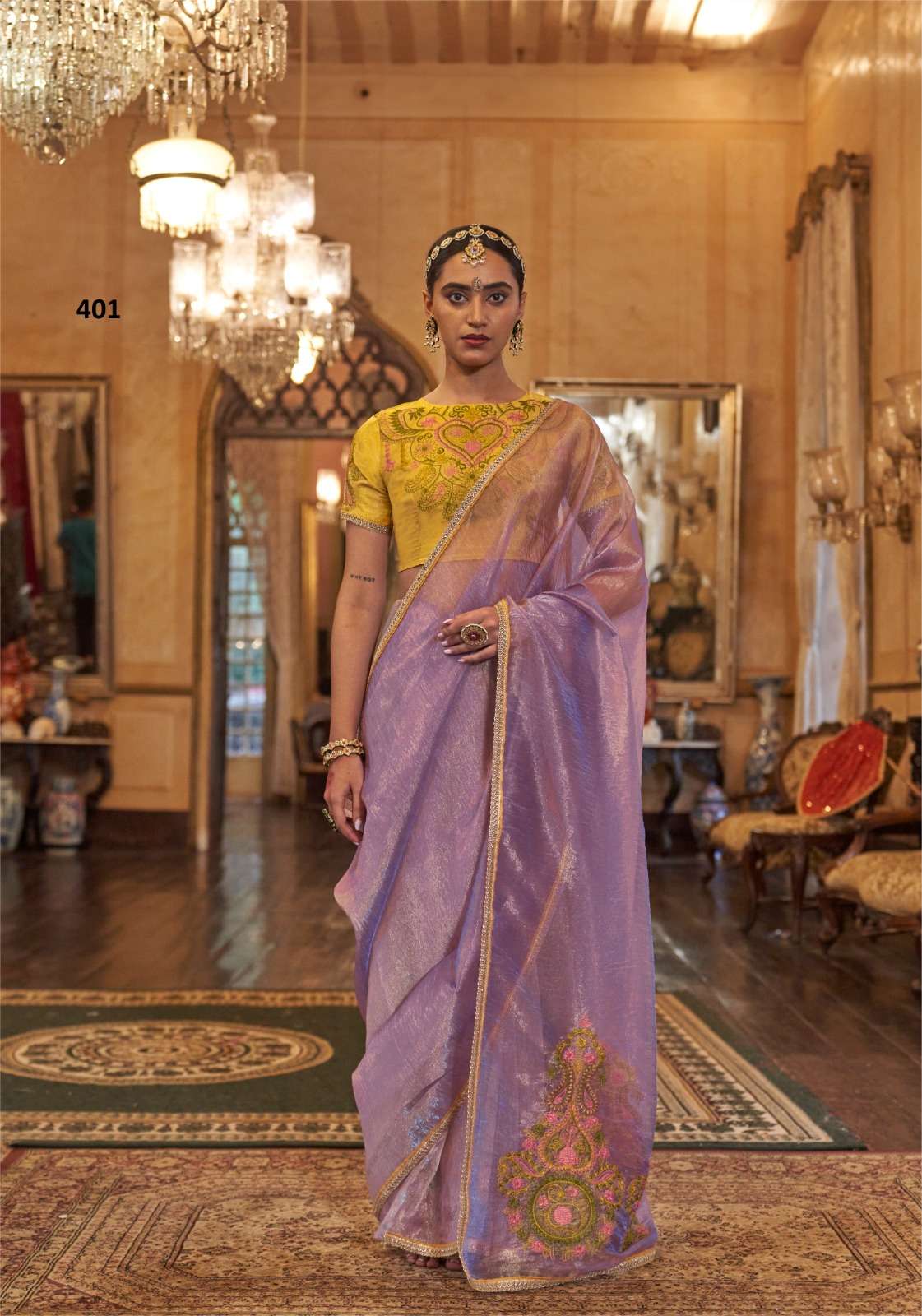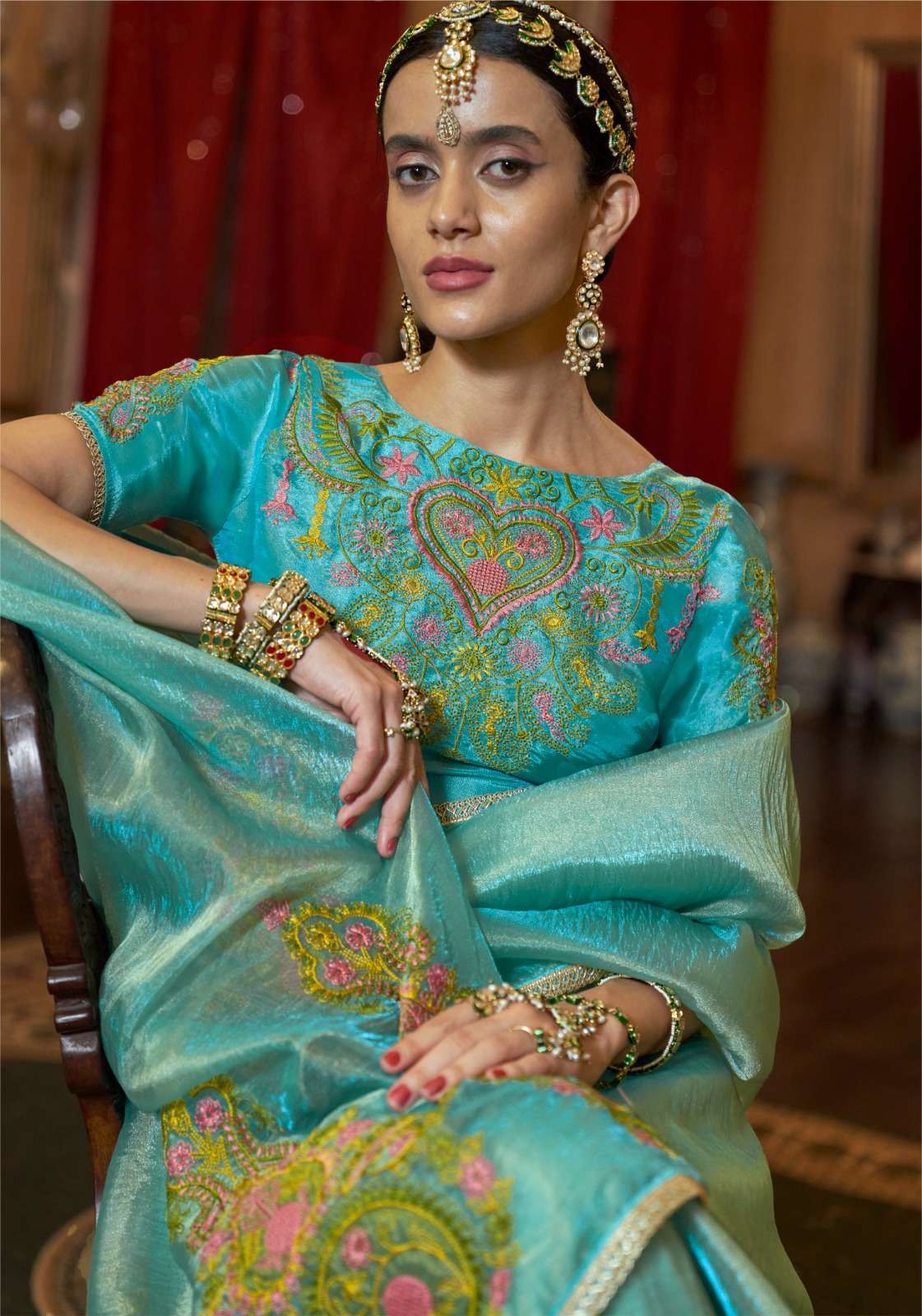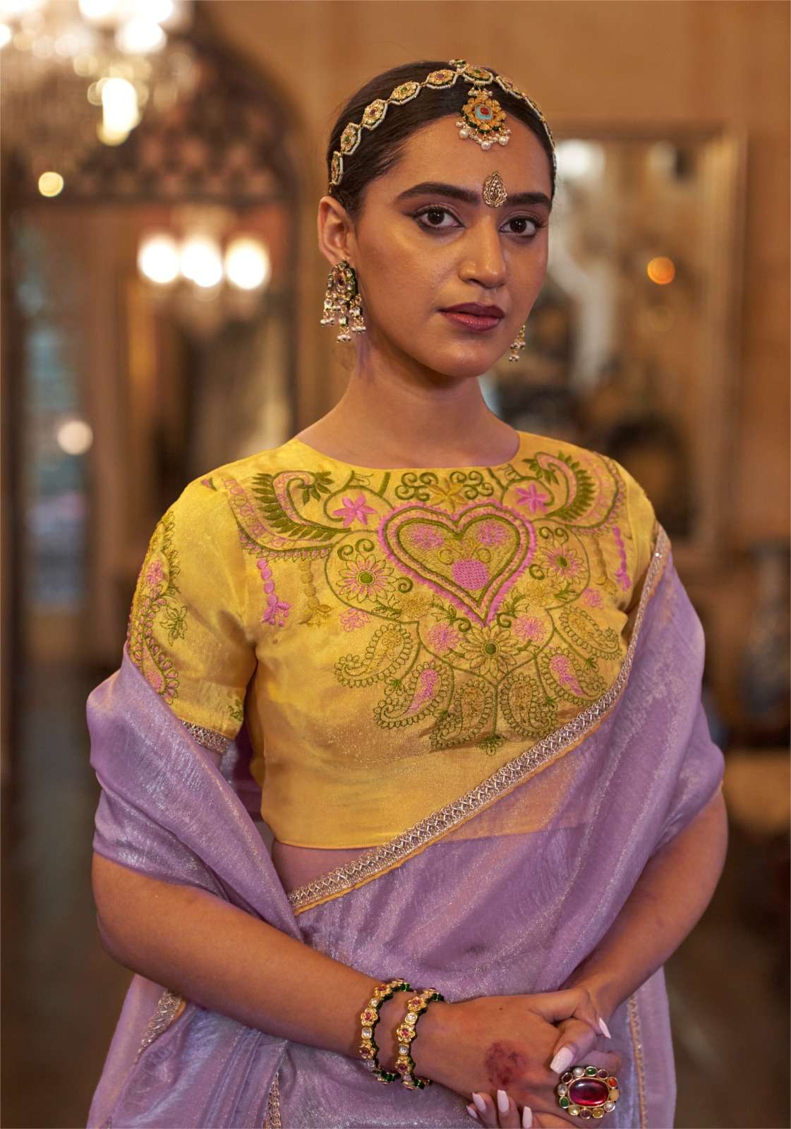 Saree - Gold tissue fabric with multi thread embroidery work and lace border details.
