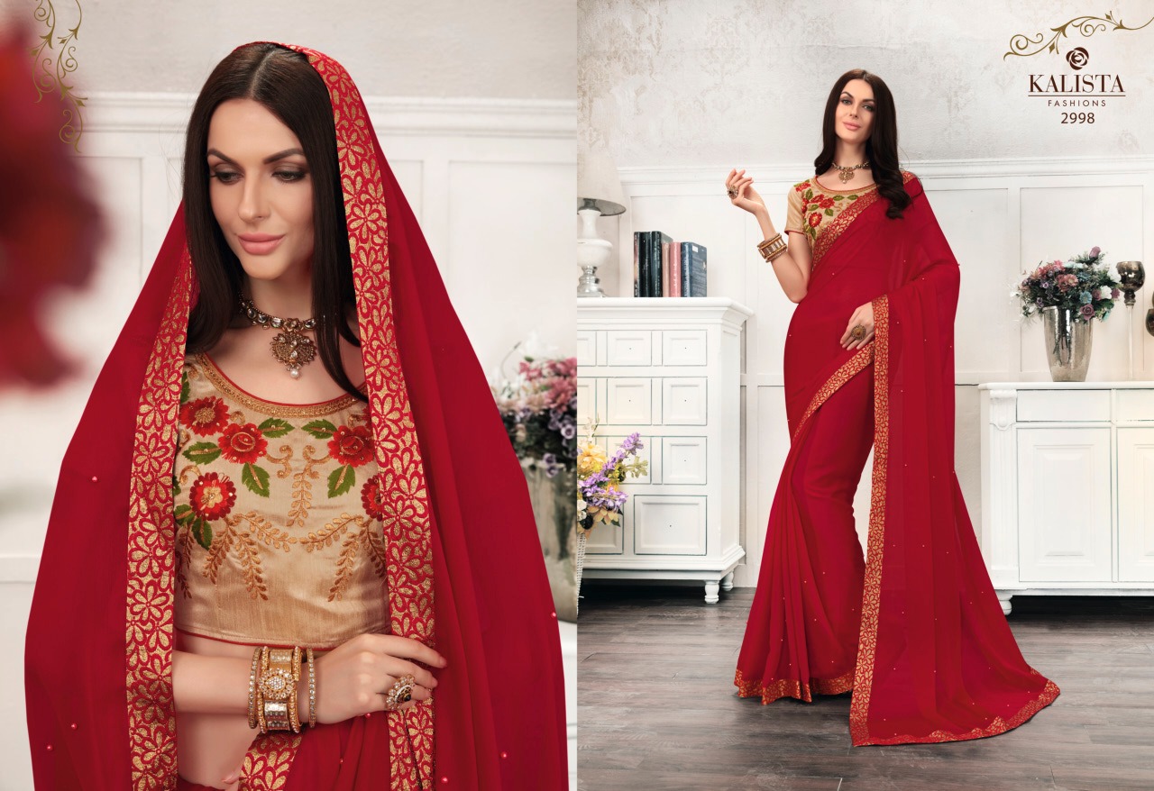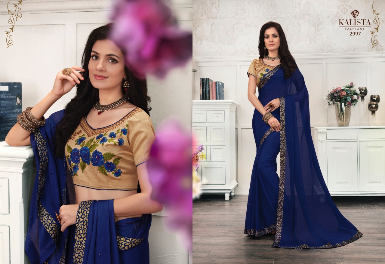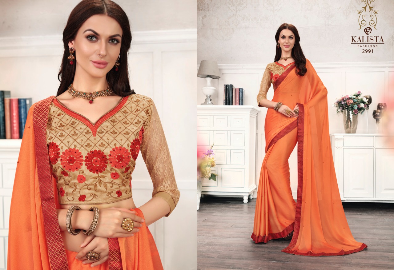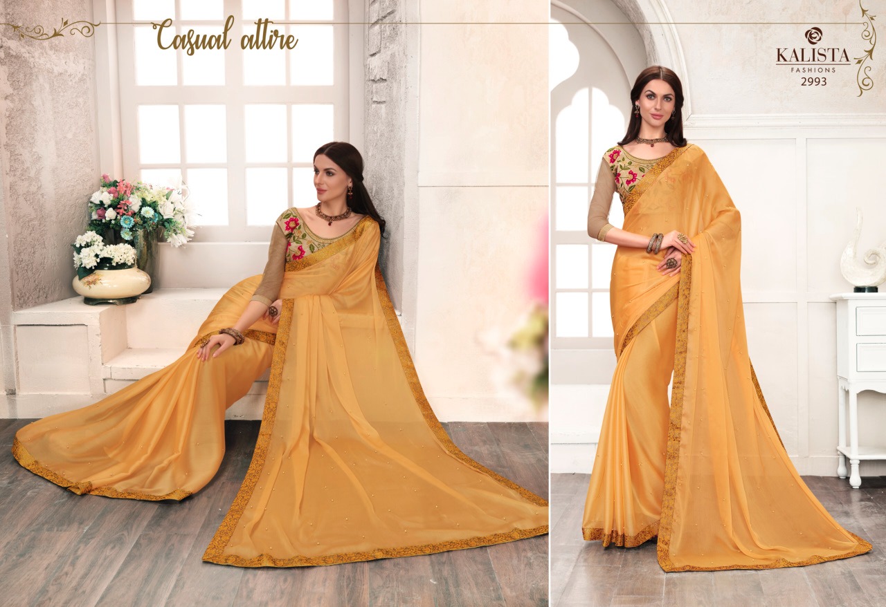 Buy Online Kalista Aanandi 2991 Series Fancy Designer Saree Catlogue 10 Pcs of Full Catalogue at Wholesale Price. Looking for Kalista Aanandi 2991 Series Fancy Designer Saree Catlogue Full Catalouge at Best Price? Buy Now Kalista Aanandi 2991 Series Fancy Designer Saree Catlogue at Wholesale Rate of Rs 5950 with Total 10 Pcs from authroized dealer and supplier of KALISTA FASHION Brand. Cost of Each piece is just only Rs 595 which is very low and affordable price to resale the product in your retail store ,This is Surat based Wholesale Supplier & Dealer of KALISTA FASHION Brand. Click on Brand name to Know more about KALISTA FASHION Brand's products.Call or Whatsapp on 9898838984 for booking or enquiry